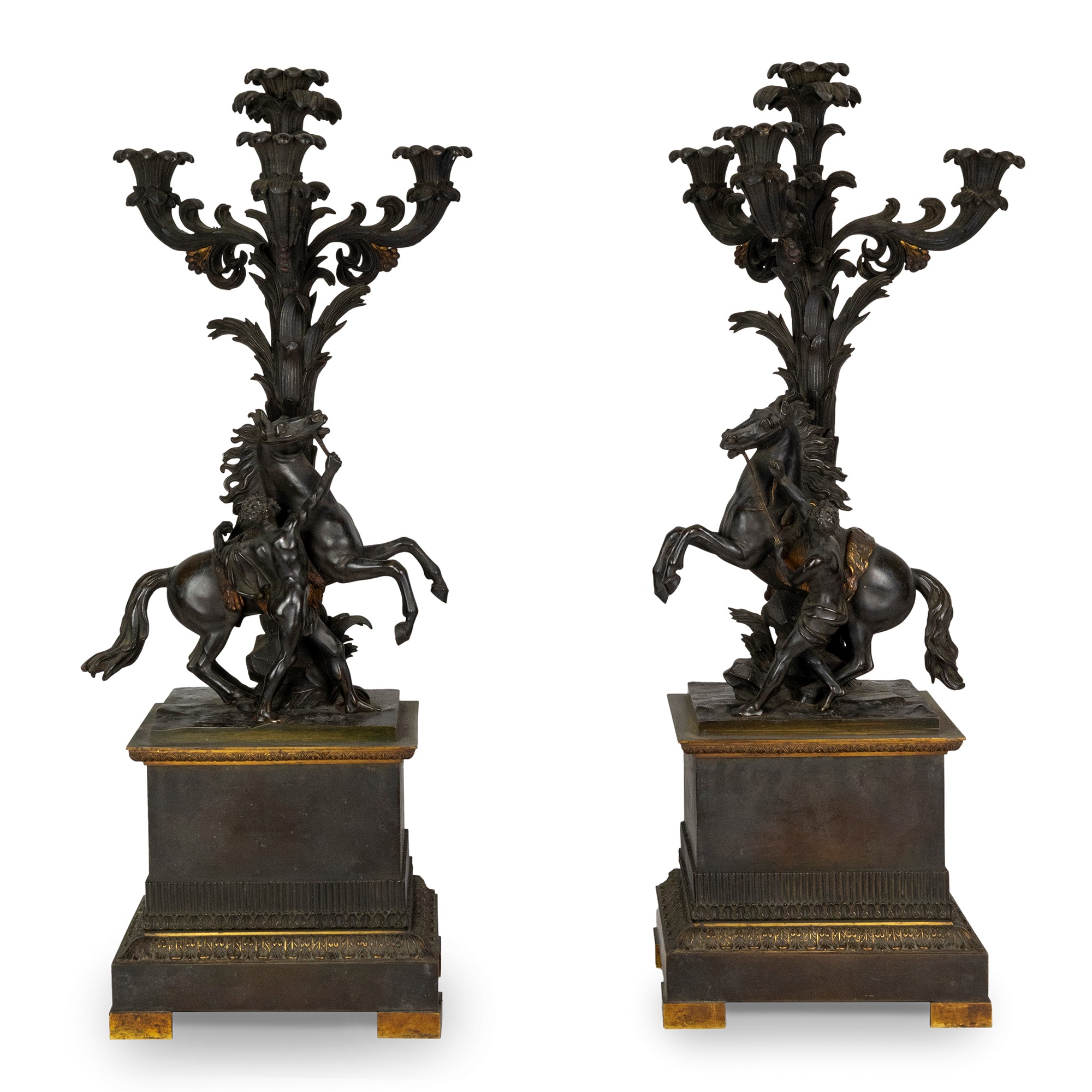 Coppia di candelabri in bronzo patinato e in parte dorato, Francia, XIX secolo