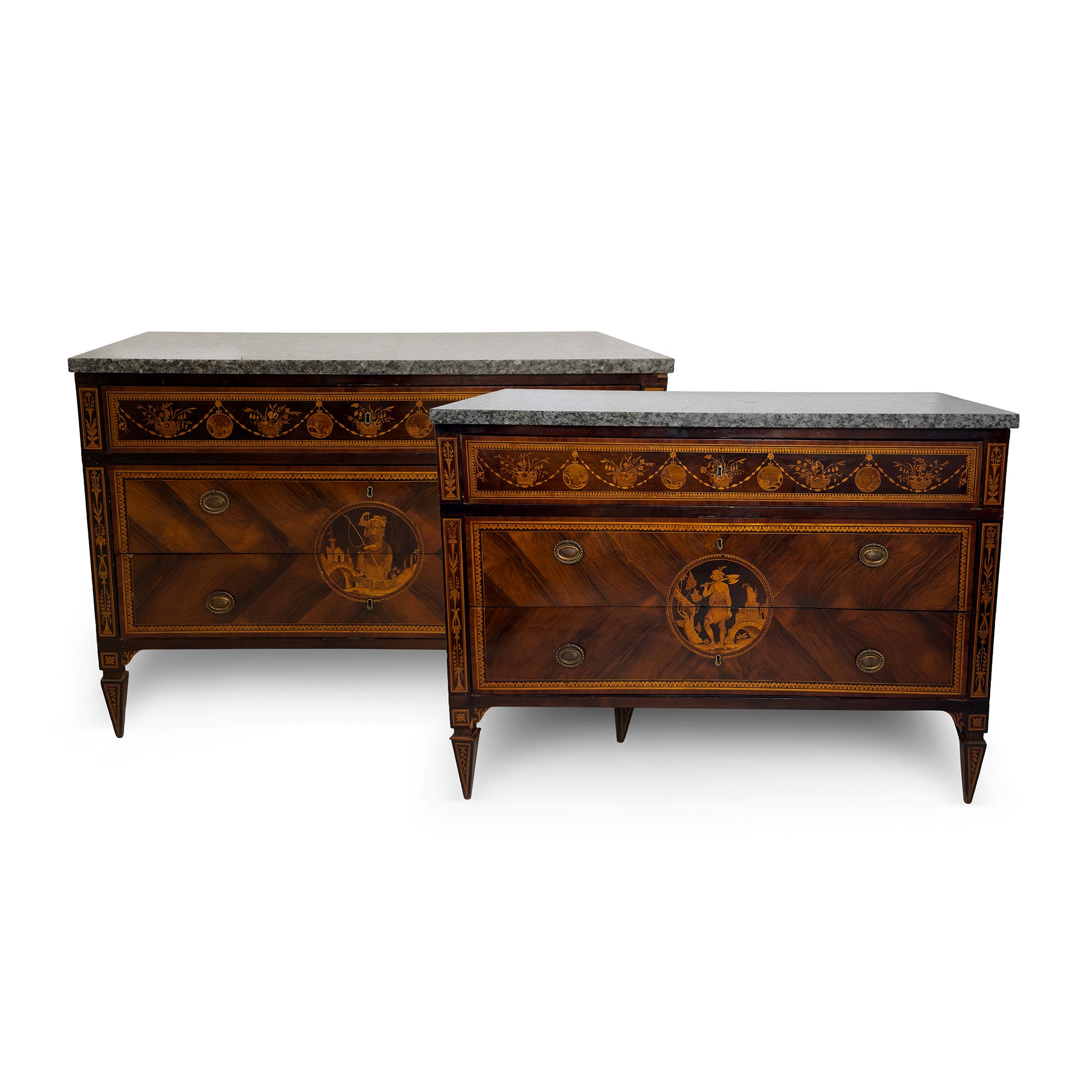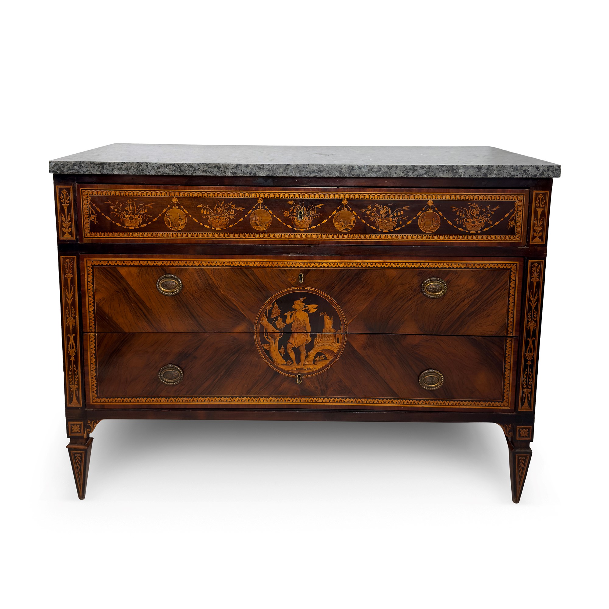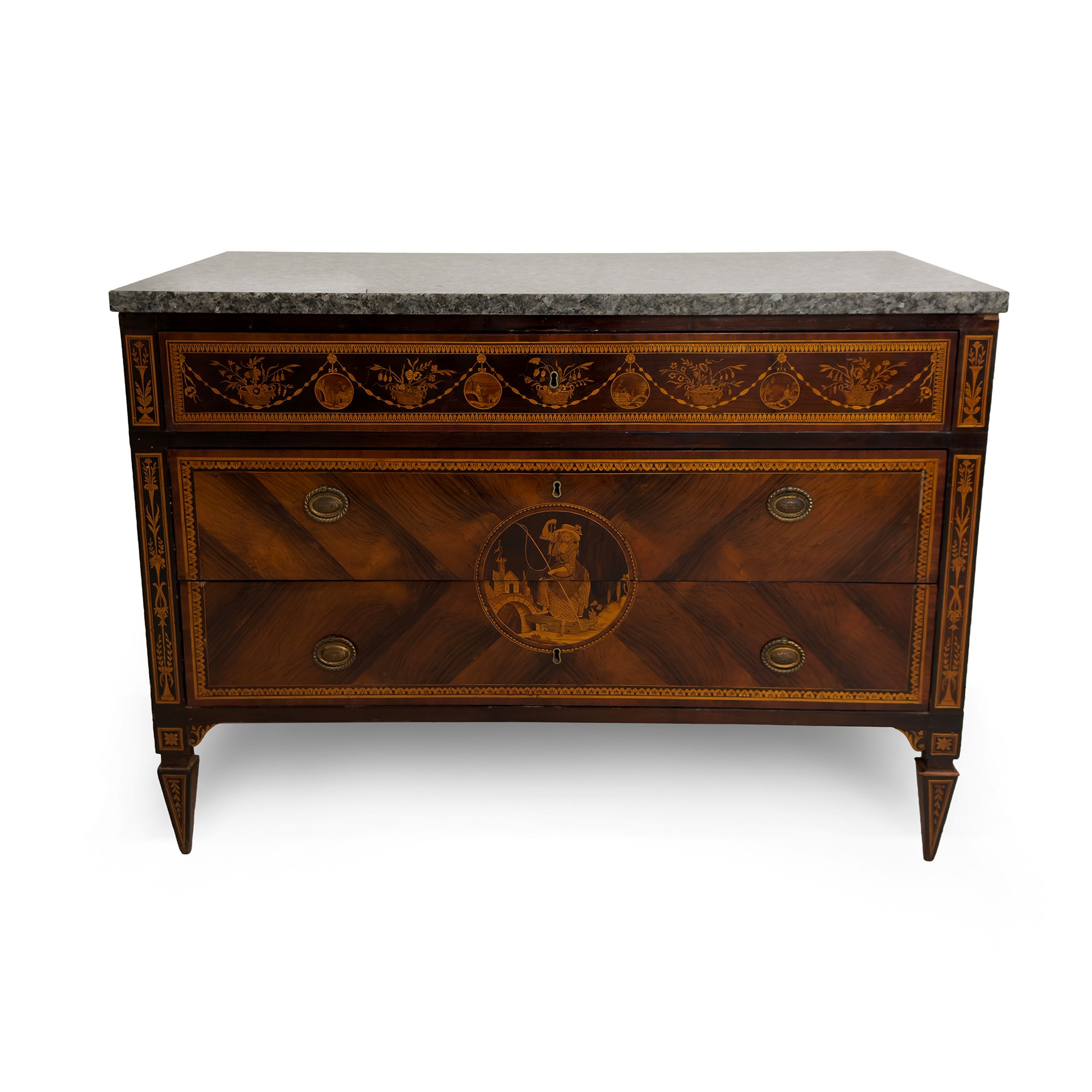 intarsiati in legni di vari essenze pregiate a raffigurare motivi di gusto classico; fronte a tre cassetti dei quali due privi di traversa centrati da una riserva circolare racchiudente la figura di un contadino e una contadinella sullo sfondo di un paesaggio minimo con rovine; lo stesso motivo ma alquanto semplificato si ripete su ciascun fianco; piedi a obelisco, piani in marmo, cm. 92x126x60 (difetti)