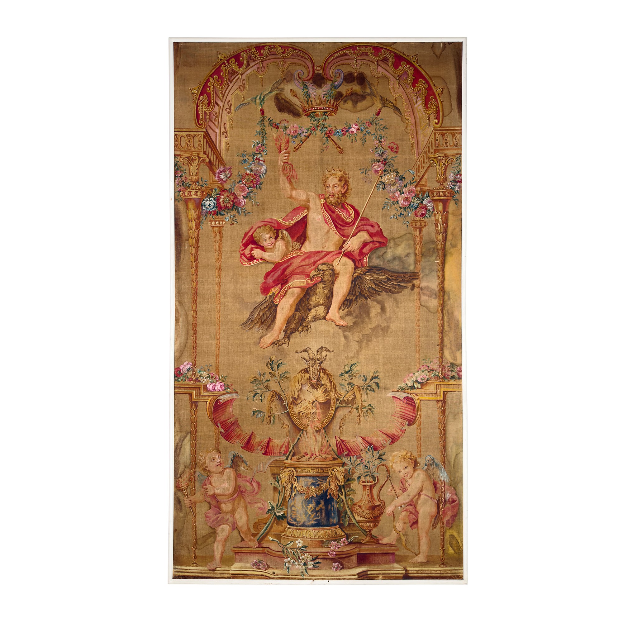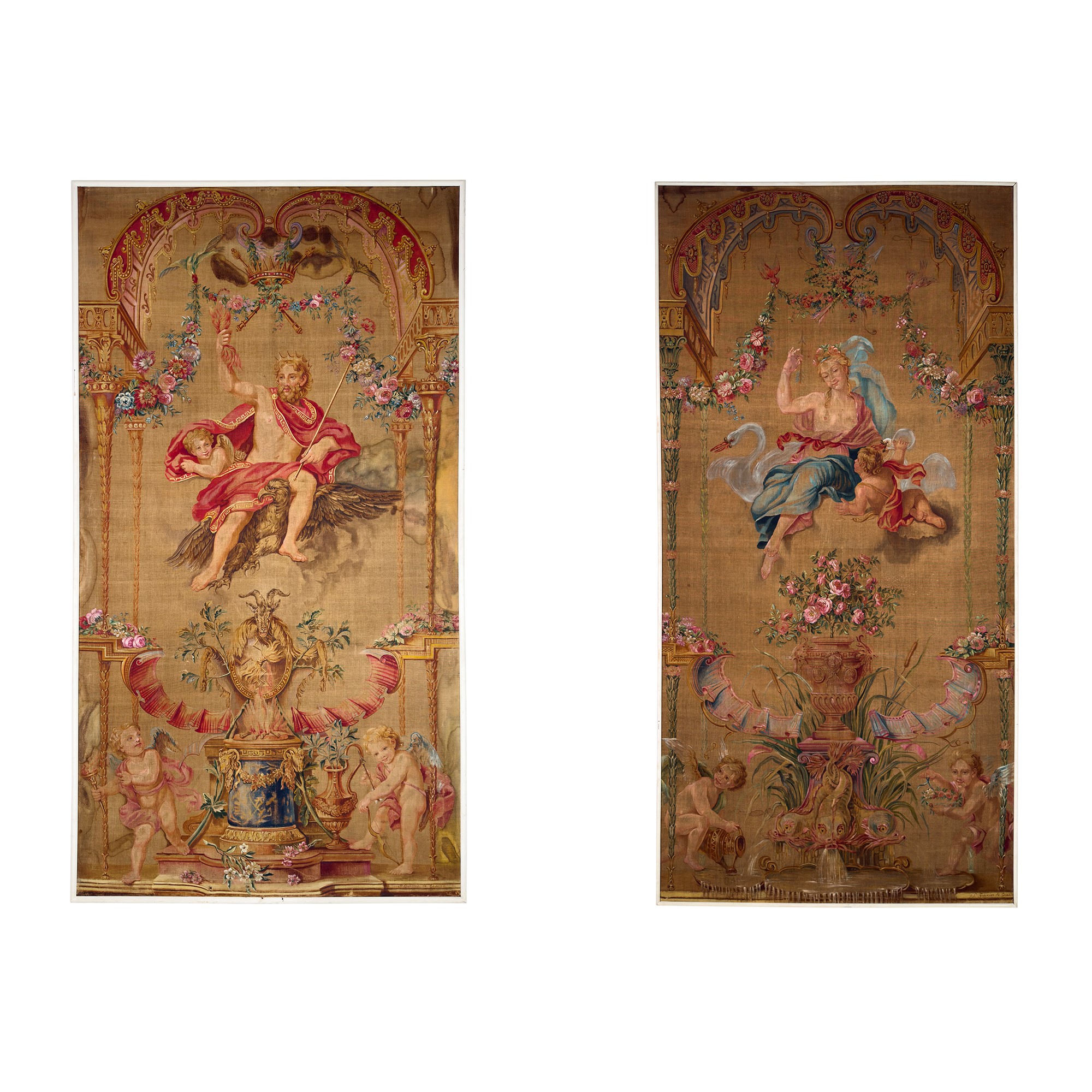 a raffigurare rispettivamente Venere e Giove inseriti in una sorta di prospetto architettonico caratterizzato inoltre da simboli decorativi tratti dalla classicità; entrambi firmati P.Garnier de Grassin in basso a destra, il pannello con Venere: cm. 243x118 ; il pannello con Giove: 244x127 (difetti; macchie di umidità)