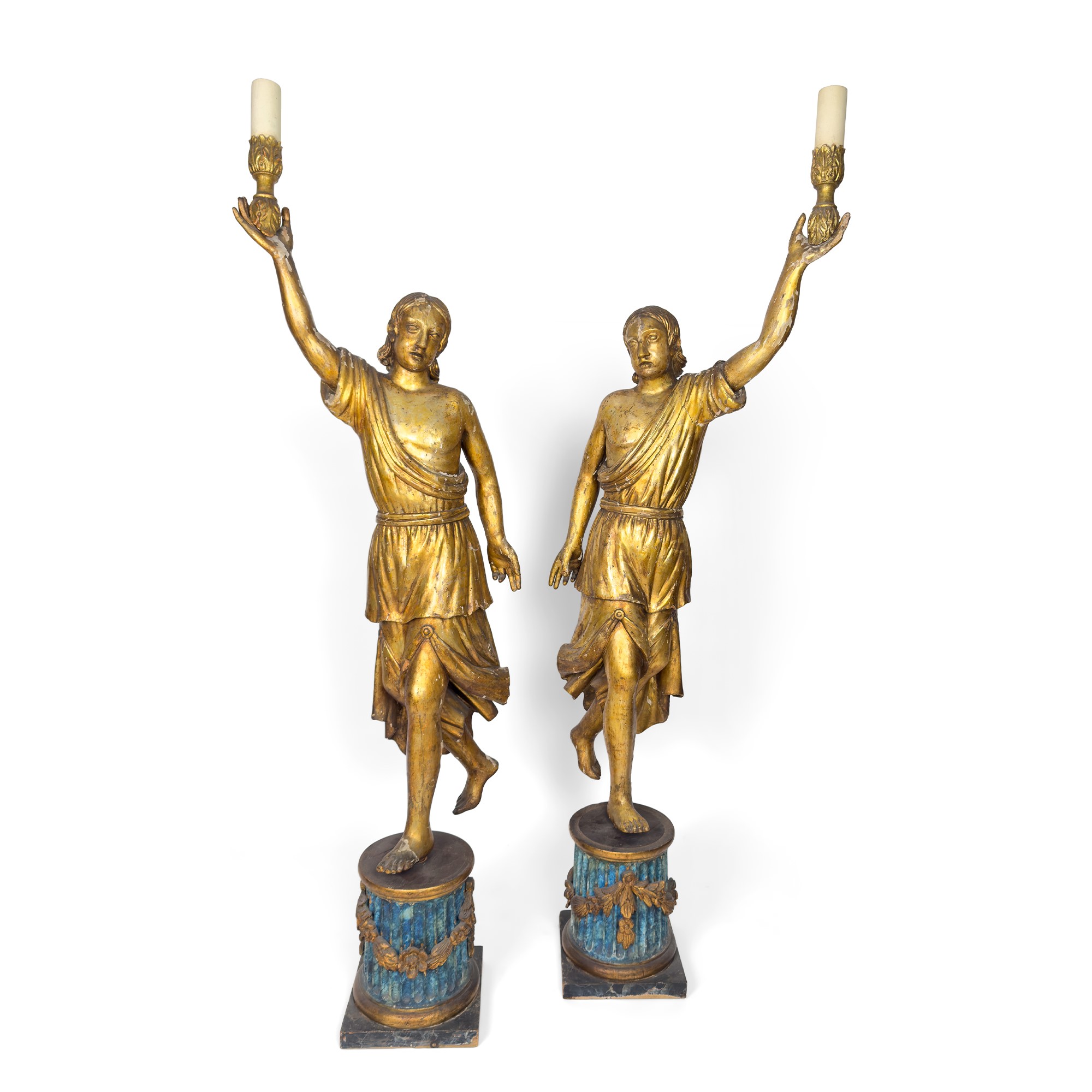 raffiguranti due personaggi maschili panneggiati con il braccio sollevato nell'atto di tenere idealmente una torcia; base cilindrica scanalata dipinta a simulare il lapislazzuli su sottobase quadrata simulante il marmo portoro, complessivamente h. cm. 200 circa (qualche caduta di doratura)
