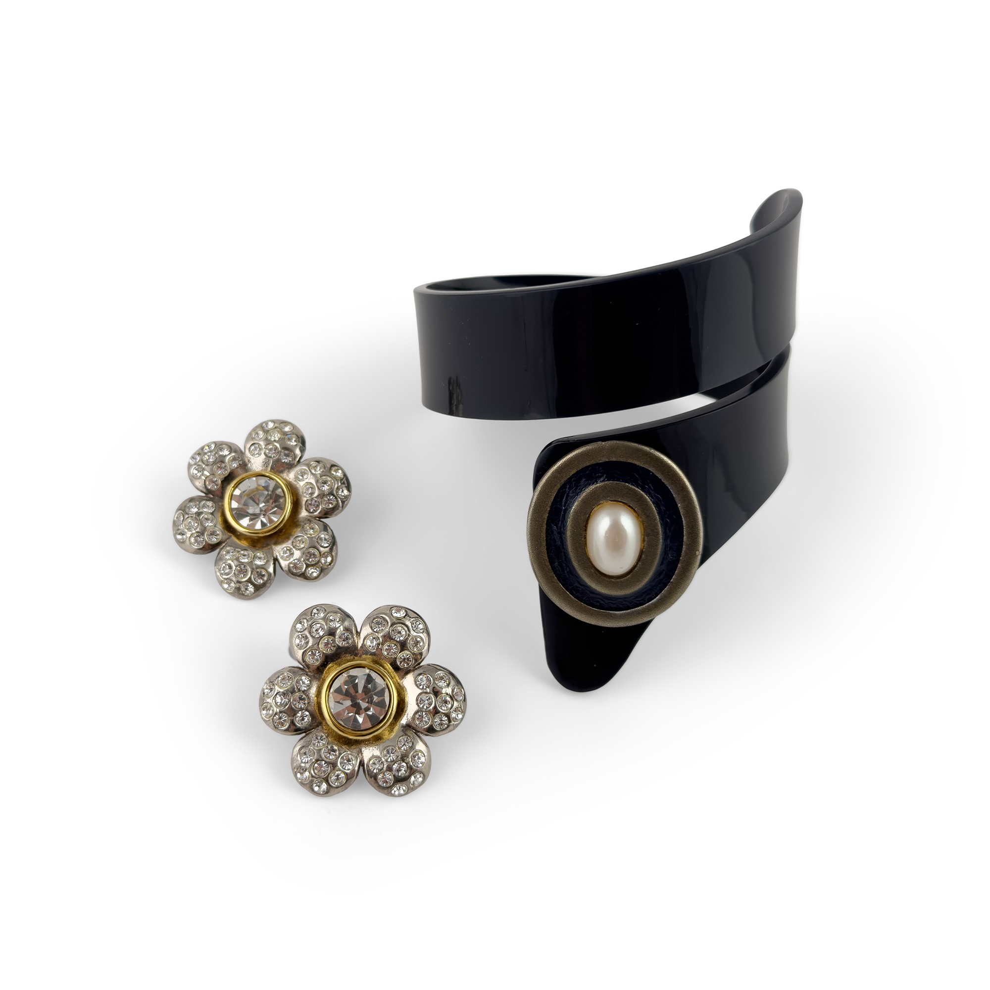bracciale in plastica blu con finta perla UNITO a un paio di orecchini a forma di margherita con strass e chiusura a clip, il bracciale: d. cm. 7; orecchini: d. cm. 3,5