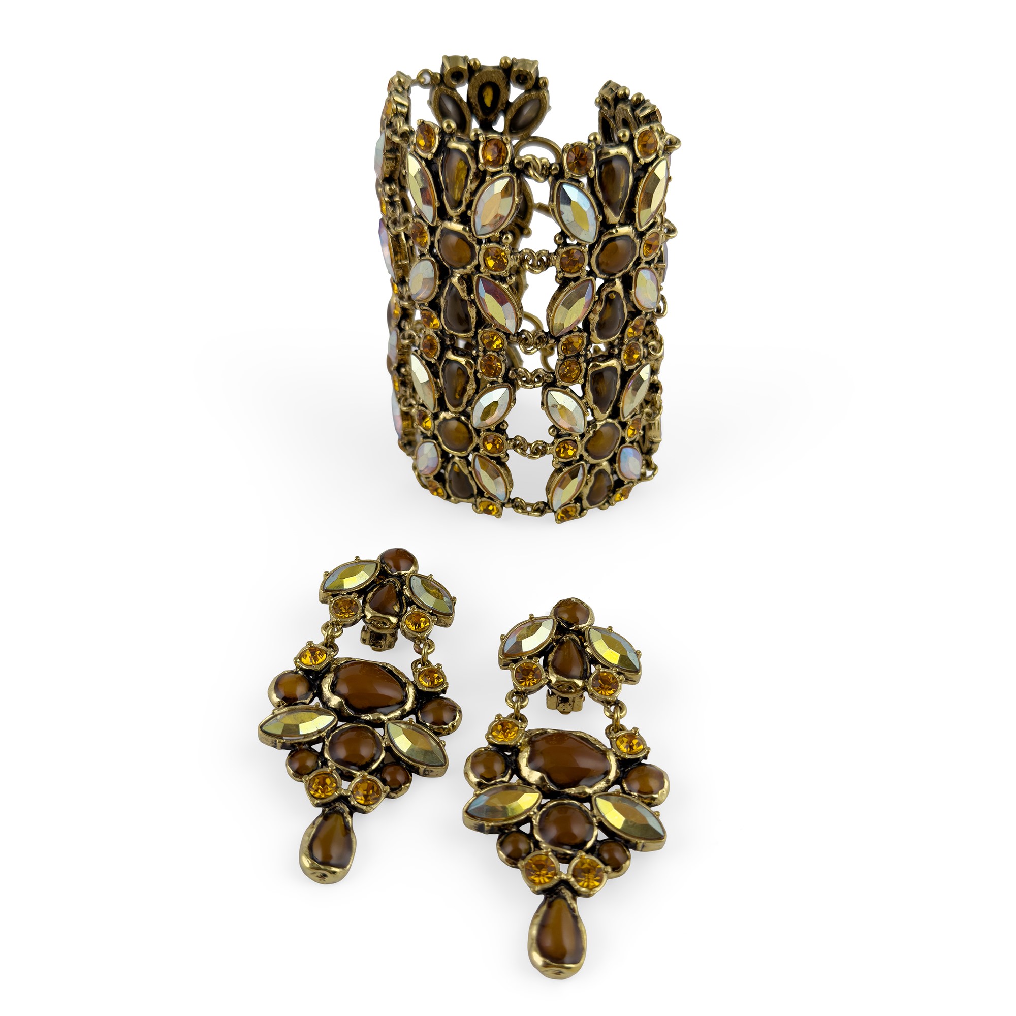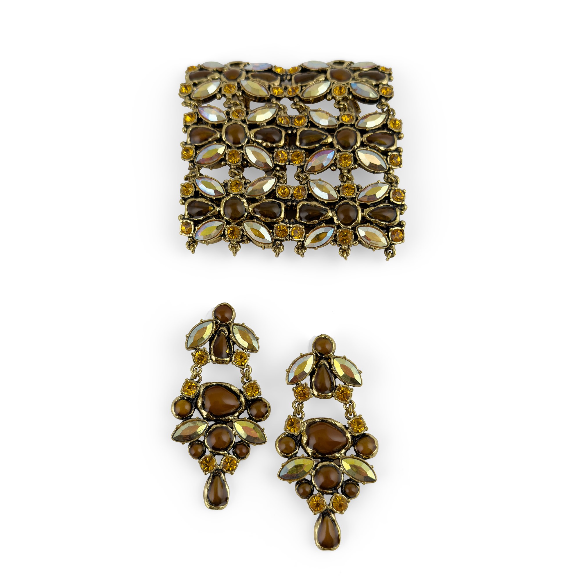 demi-parure composta da bracciale e orecchini in metallo dorato con strass iridescenti e cristalli cabochon color nocciola, il bracciale: cm. 10x18; orecchini: l. cm. 9.