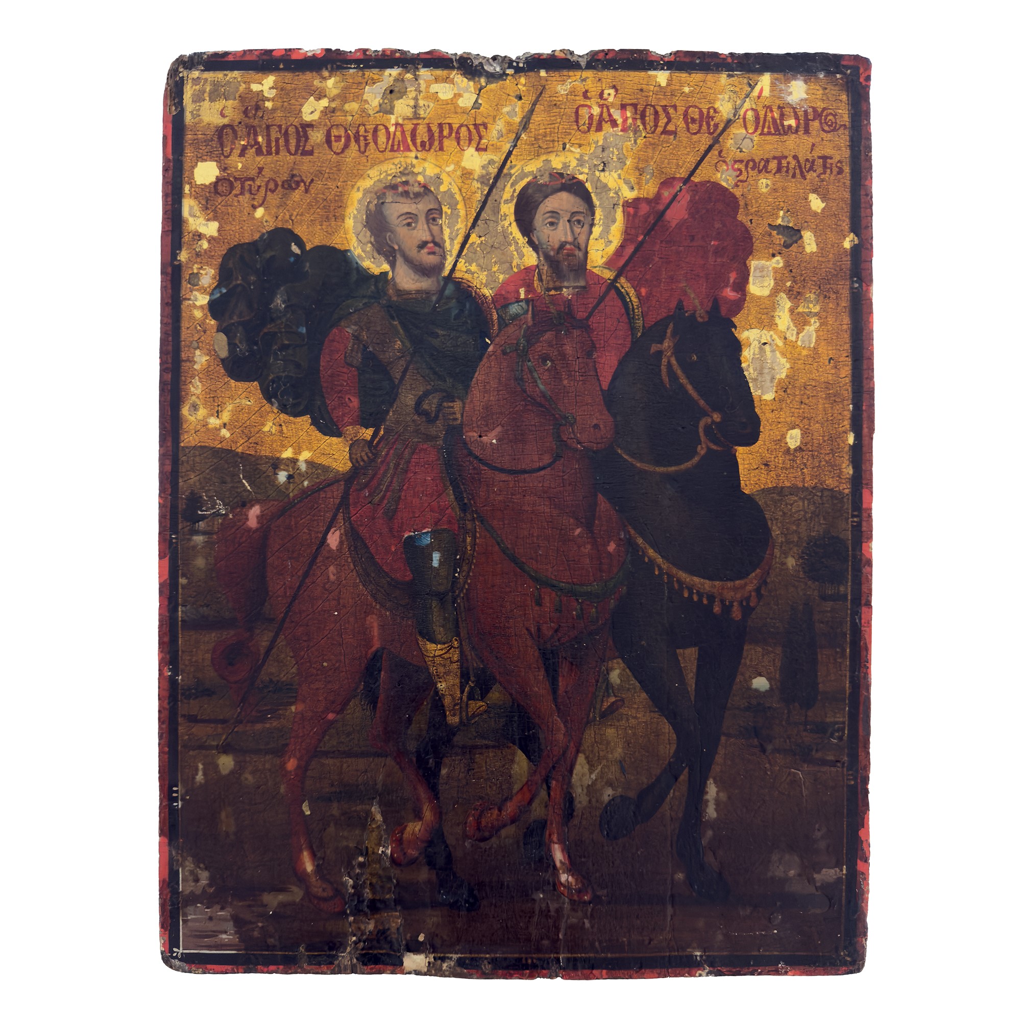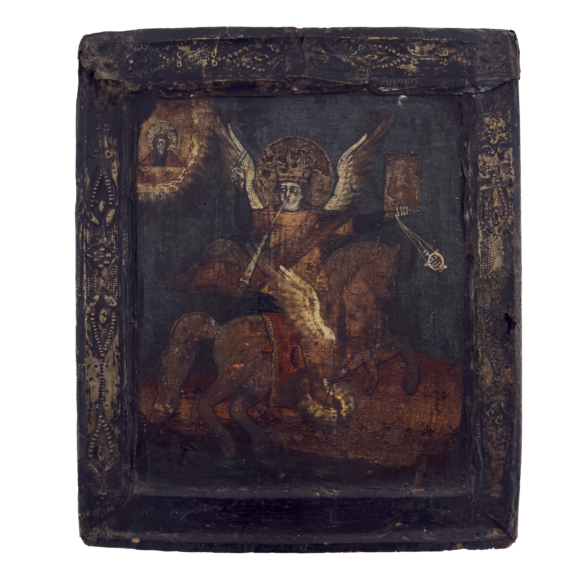 una con basma in lamina metallica, cm. 30x25,5; cm. 38x29,5 (difetti)