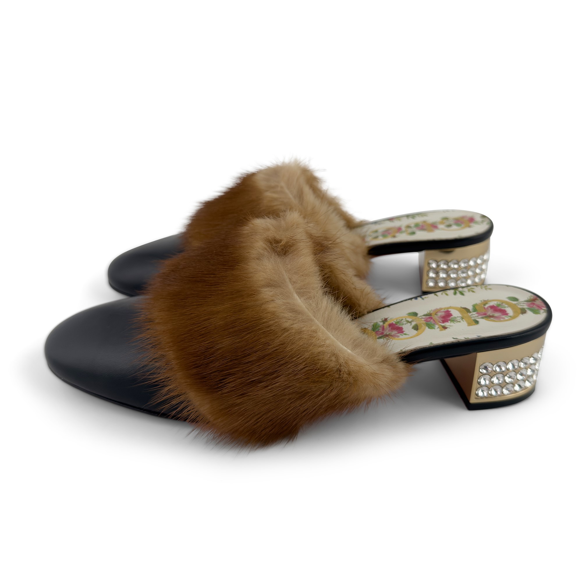 mules in pelle nera con fascia in visone e tacco dorato abbellito da tre file di strass,n. 37