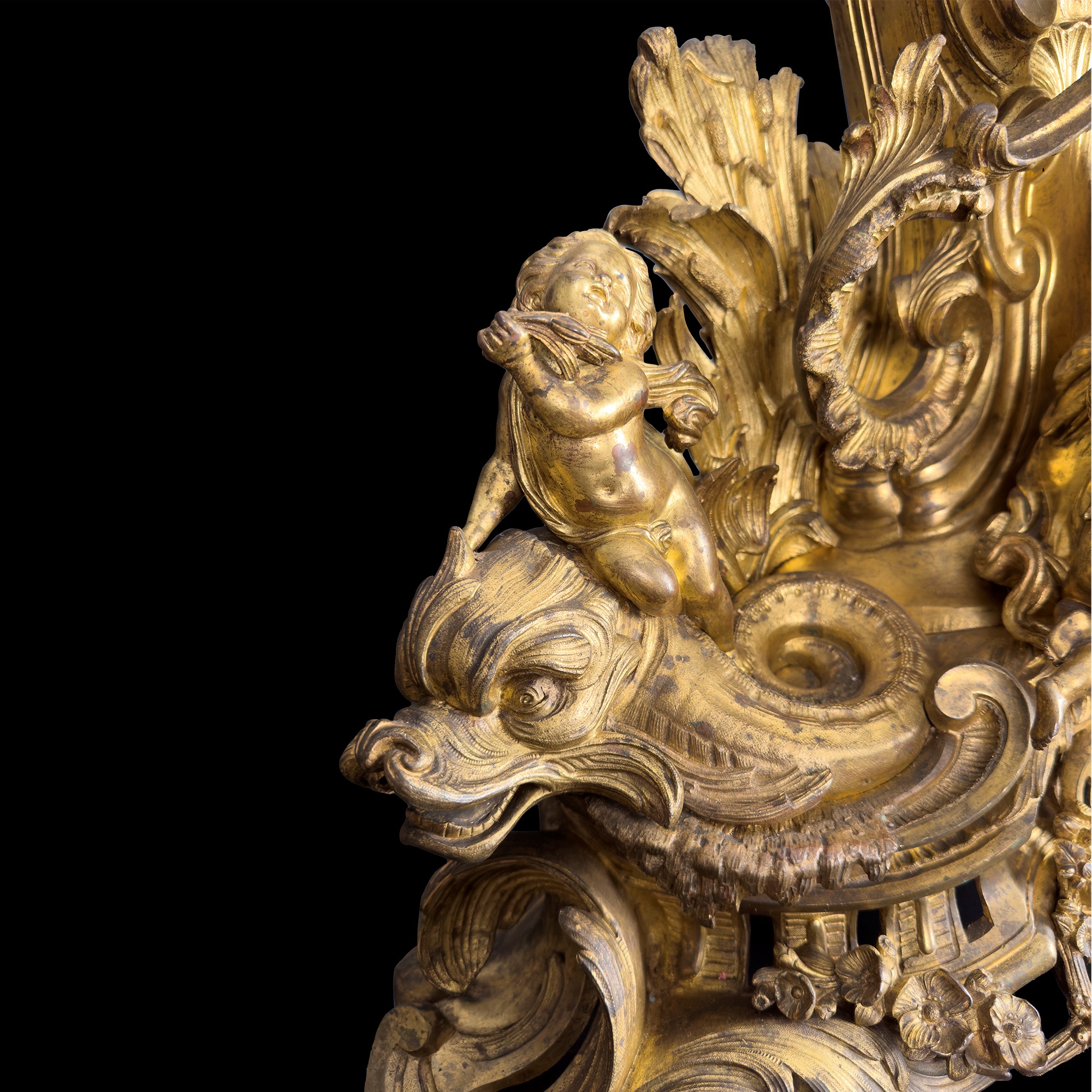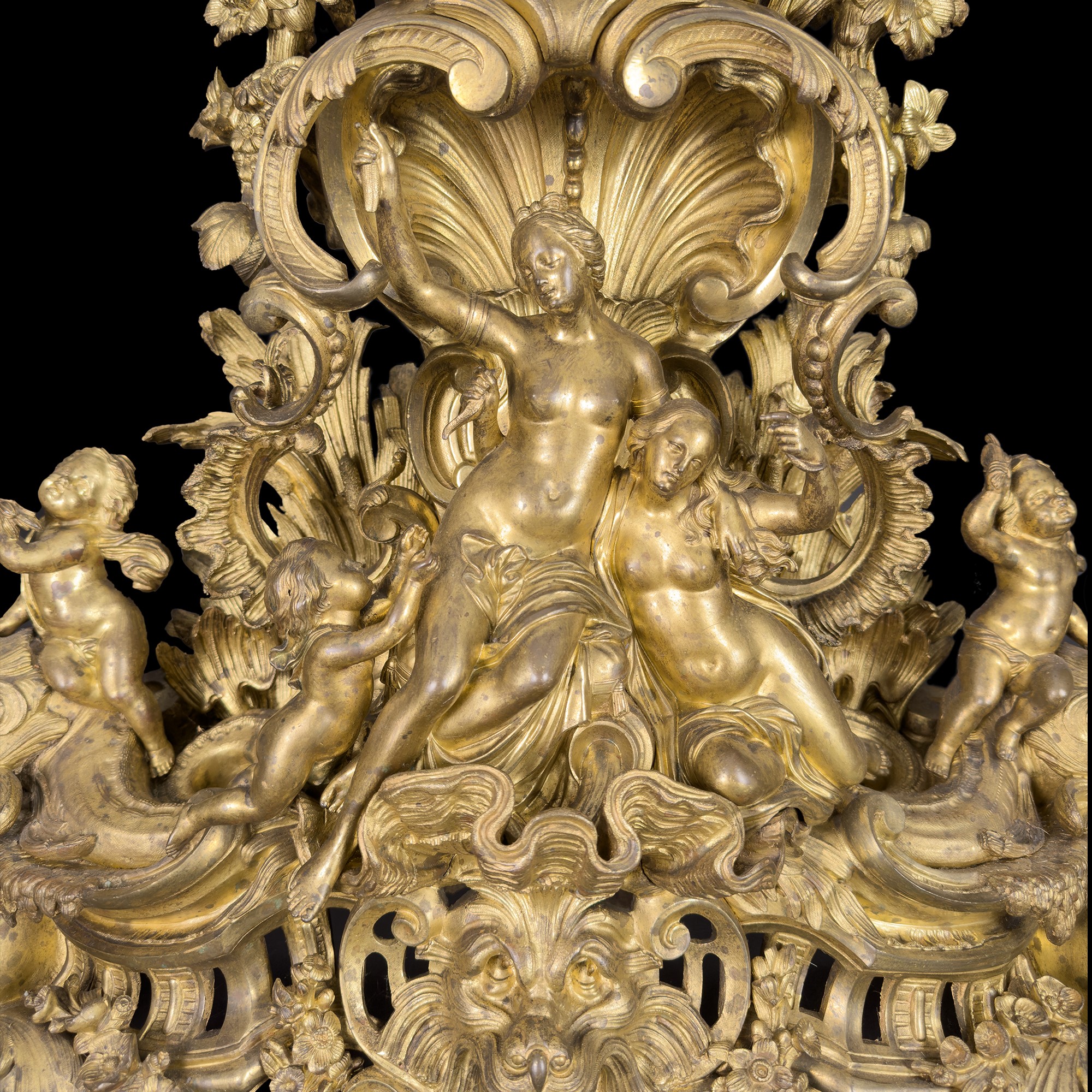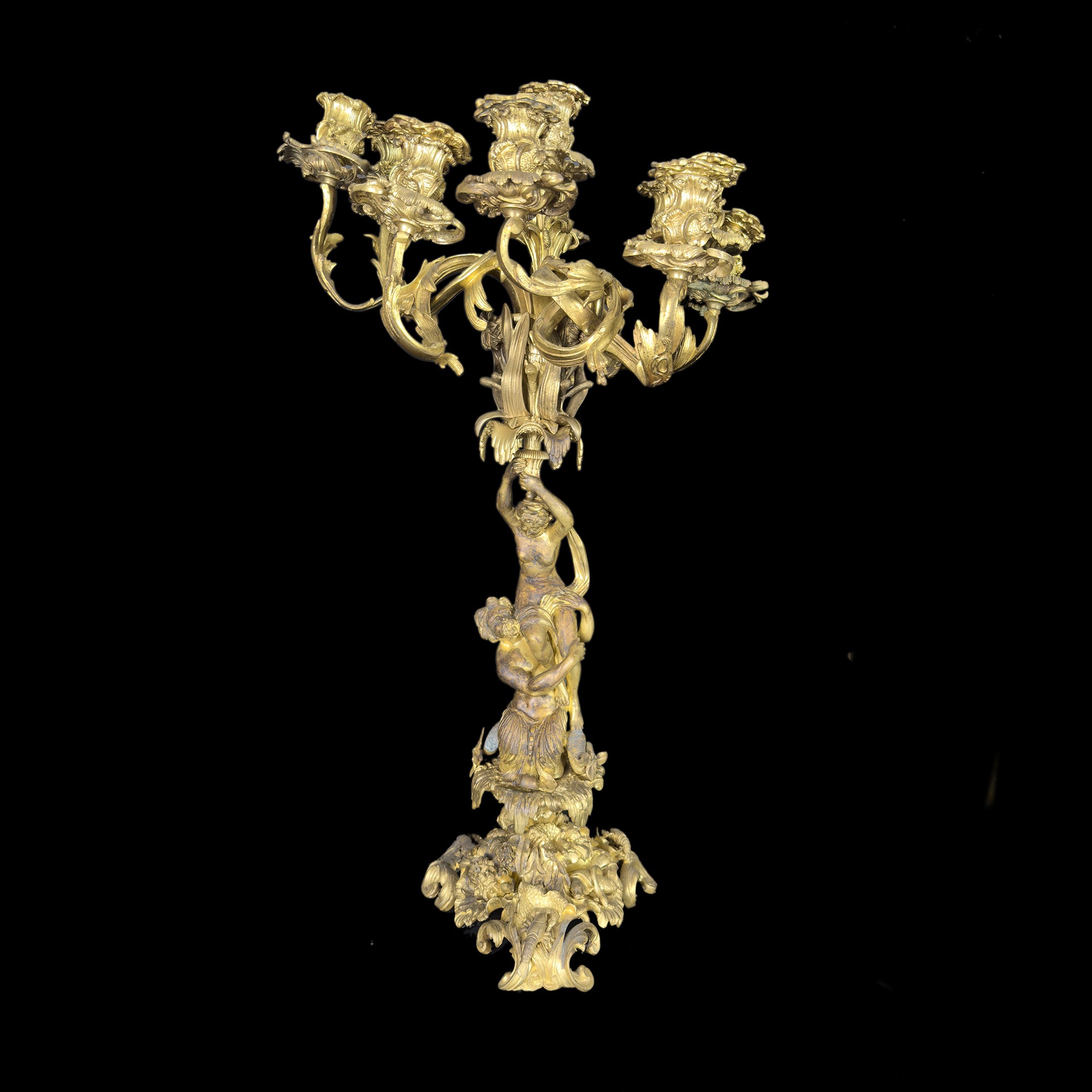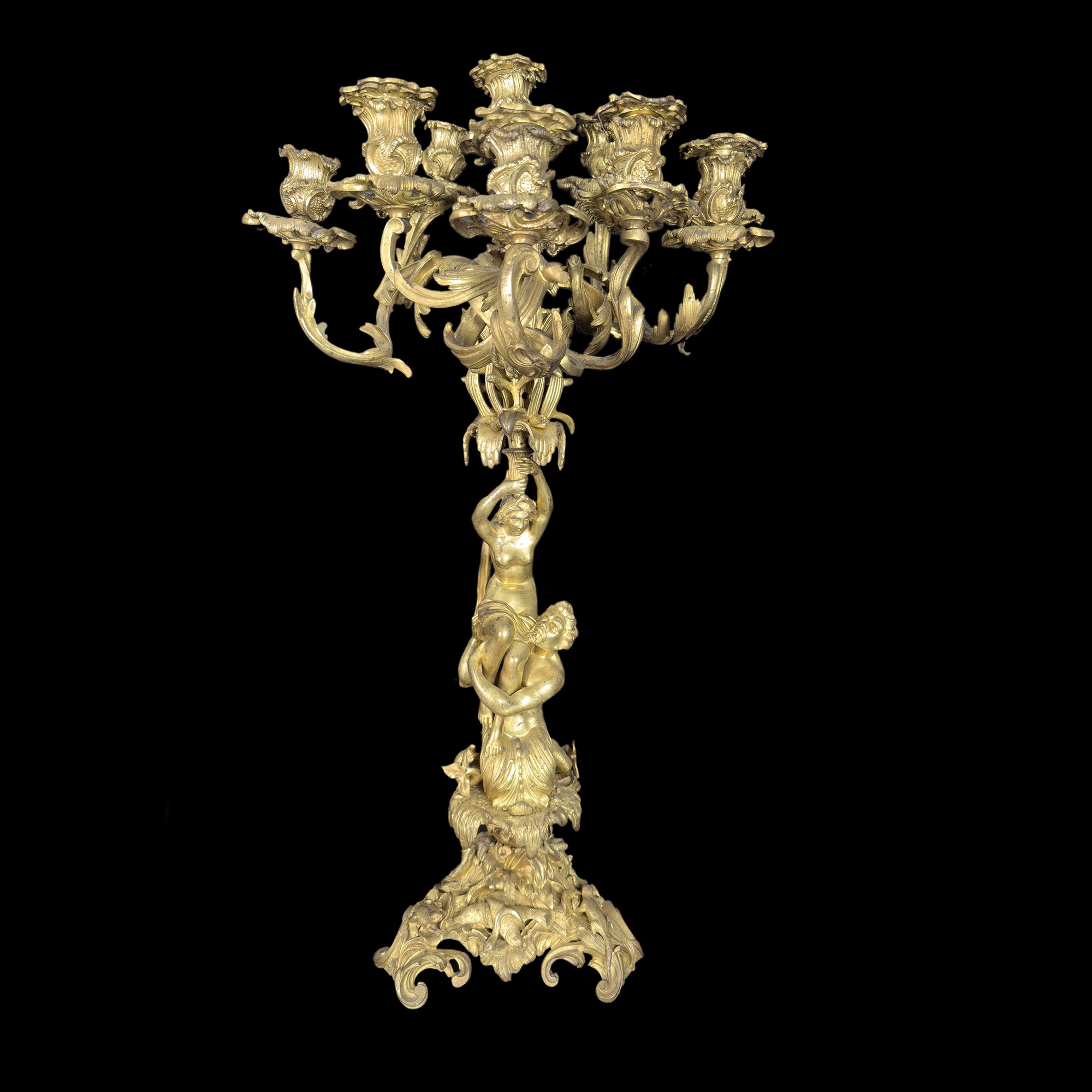 la pendola con cassa centinata finemente cesellata centrata da un mascherone leonino su cui poggia la figura di Venere con una ninfa e Cupido, affiancati da due putti che siedono su un delfino; quadrante circolare con pasticche in smalto bianco e blu con indici in numeri romani inserito in una sorta di cartiglio di volute fogliate da cui nascono serti fioriti, sormontato da un'Allegoria dell'Amore quale putti che si baciano. I candelabri a dieci luci ciascuno con stelo in forma di un satiro che abbraccia una ninfa, riccamente cesellati a volute, rocailles e motivi fogliati, la pendola: cm. 86x66 circa; i candelabri: h. cm. 77 (la pendola priva di chiave di carica; meccanismo mancante di pendolo, da revisionare; quattro piattelli delle bobèches e un braccio di uno dei candelabri mancante)