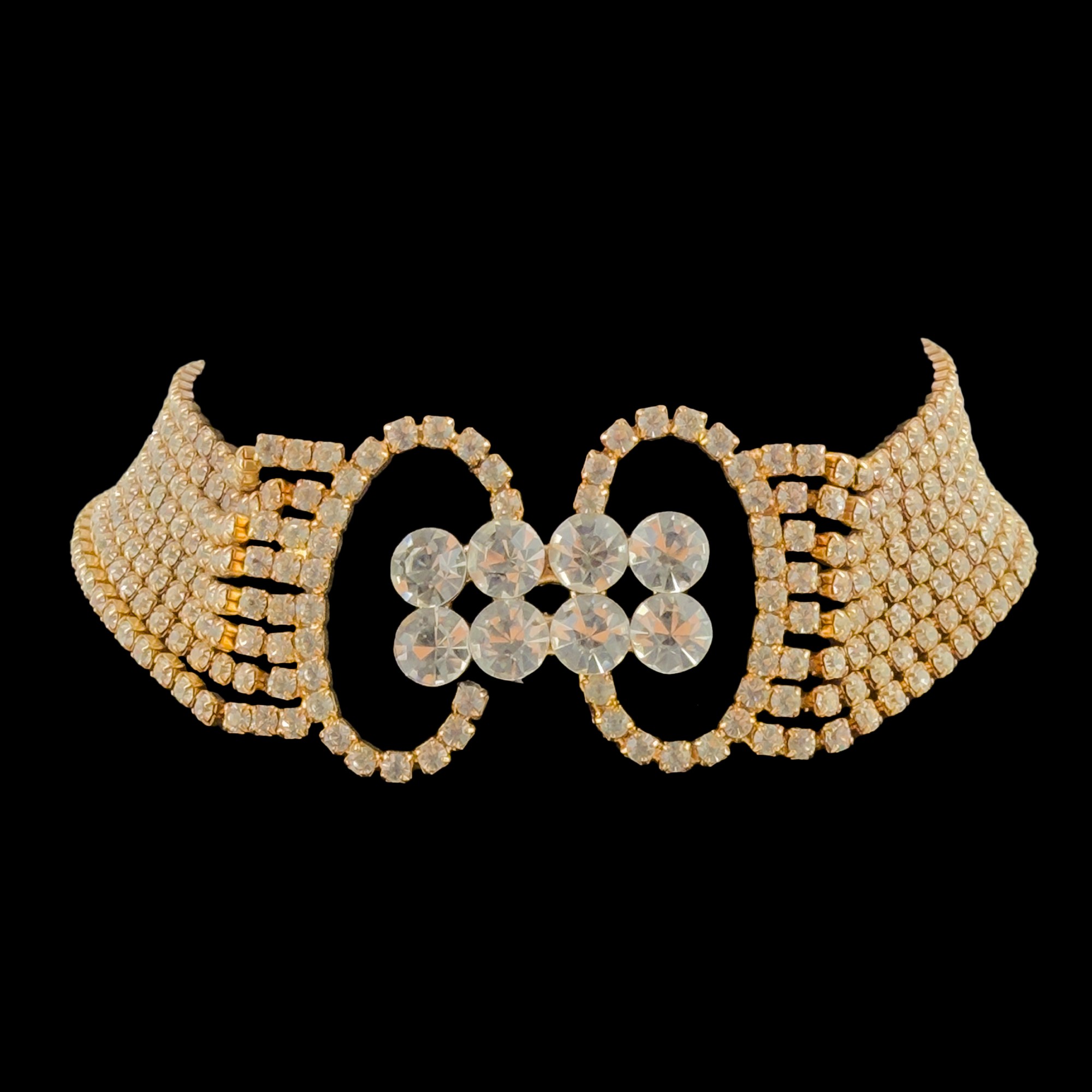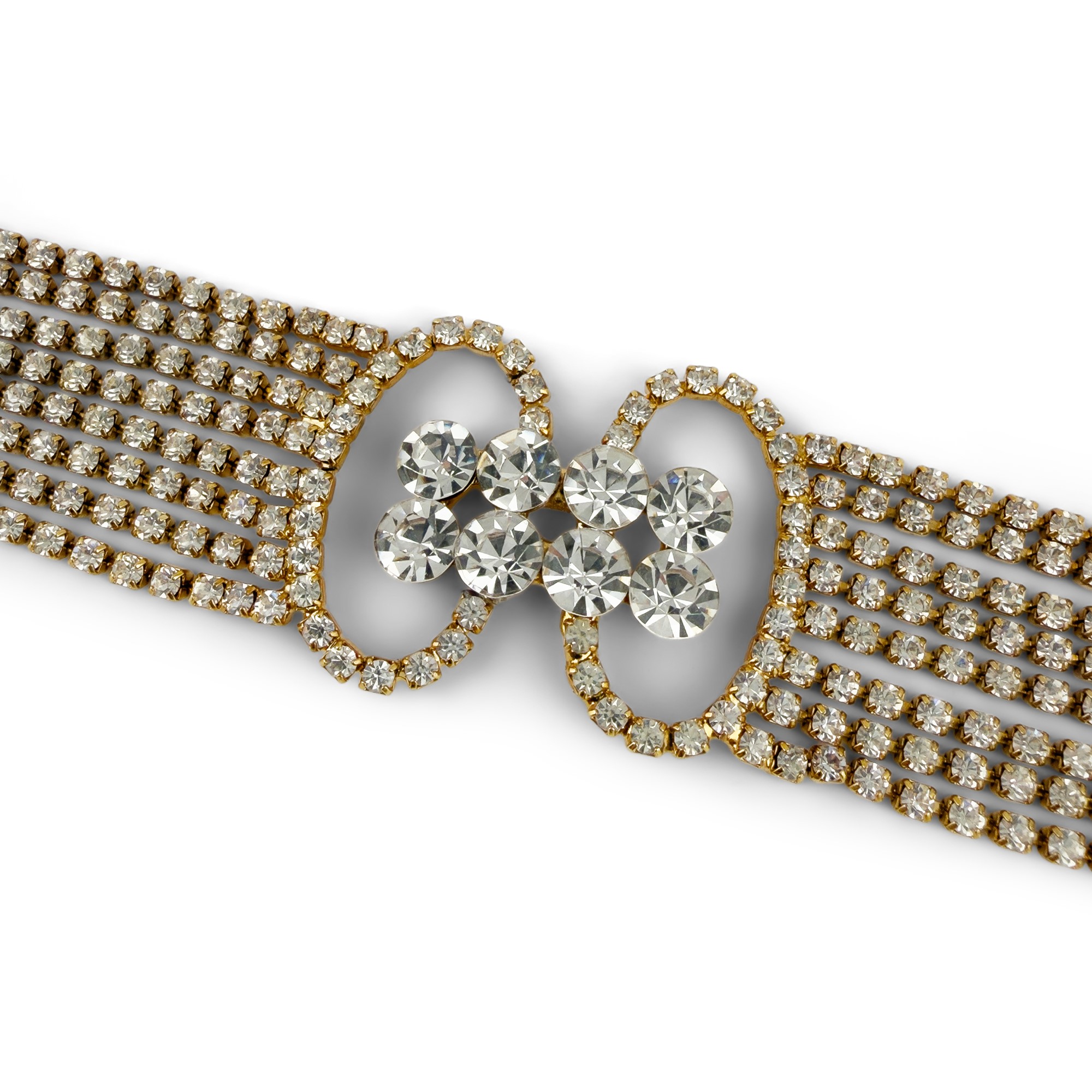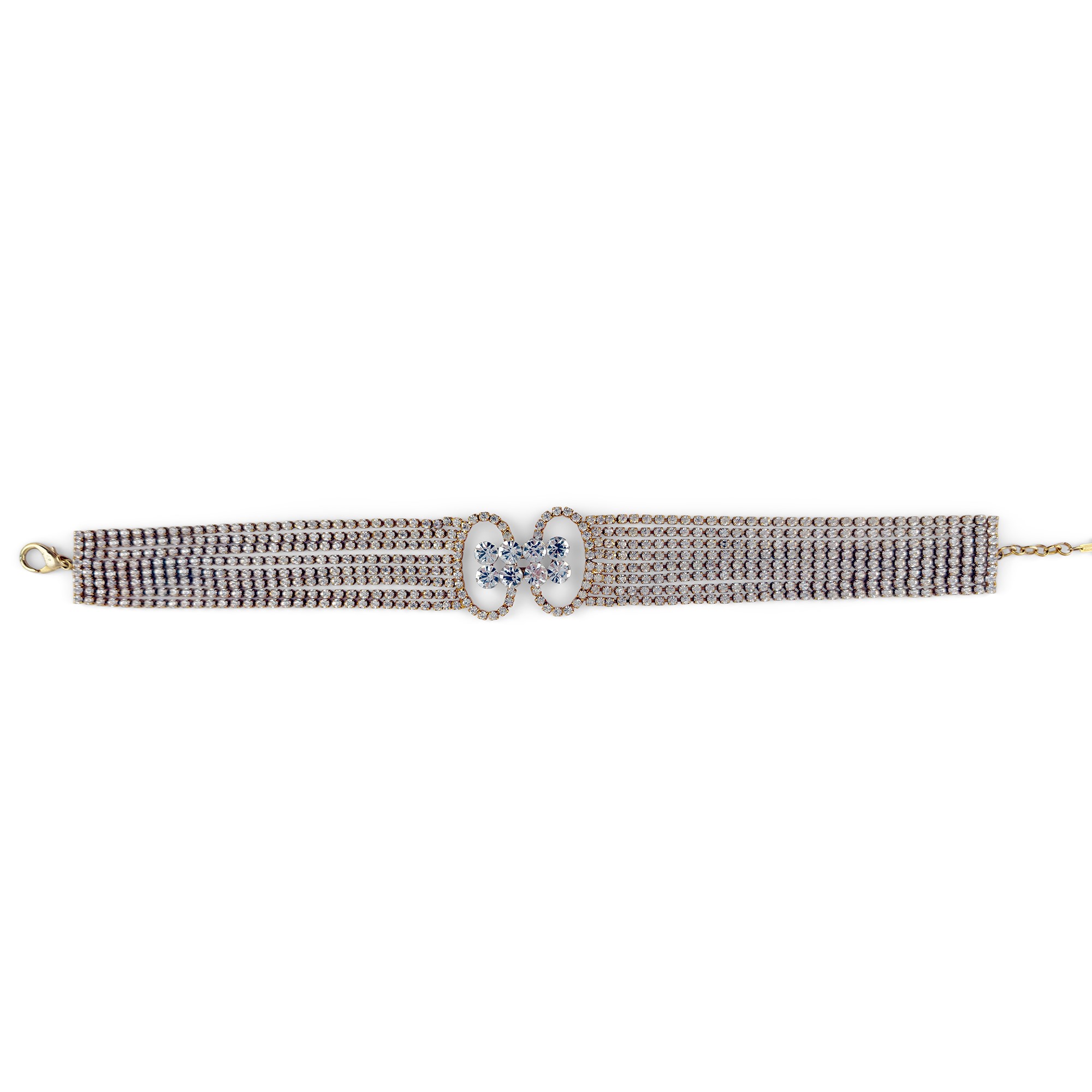 collier de chien in metallo dorato con 8 file di strass ed elemento centrale a motivo geometrico, l. cm. 32