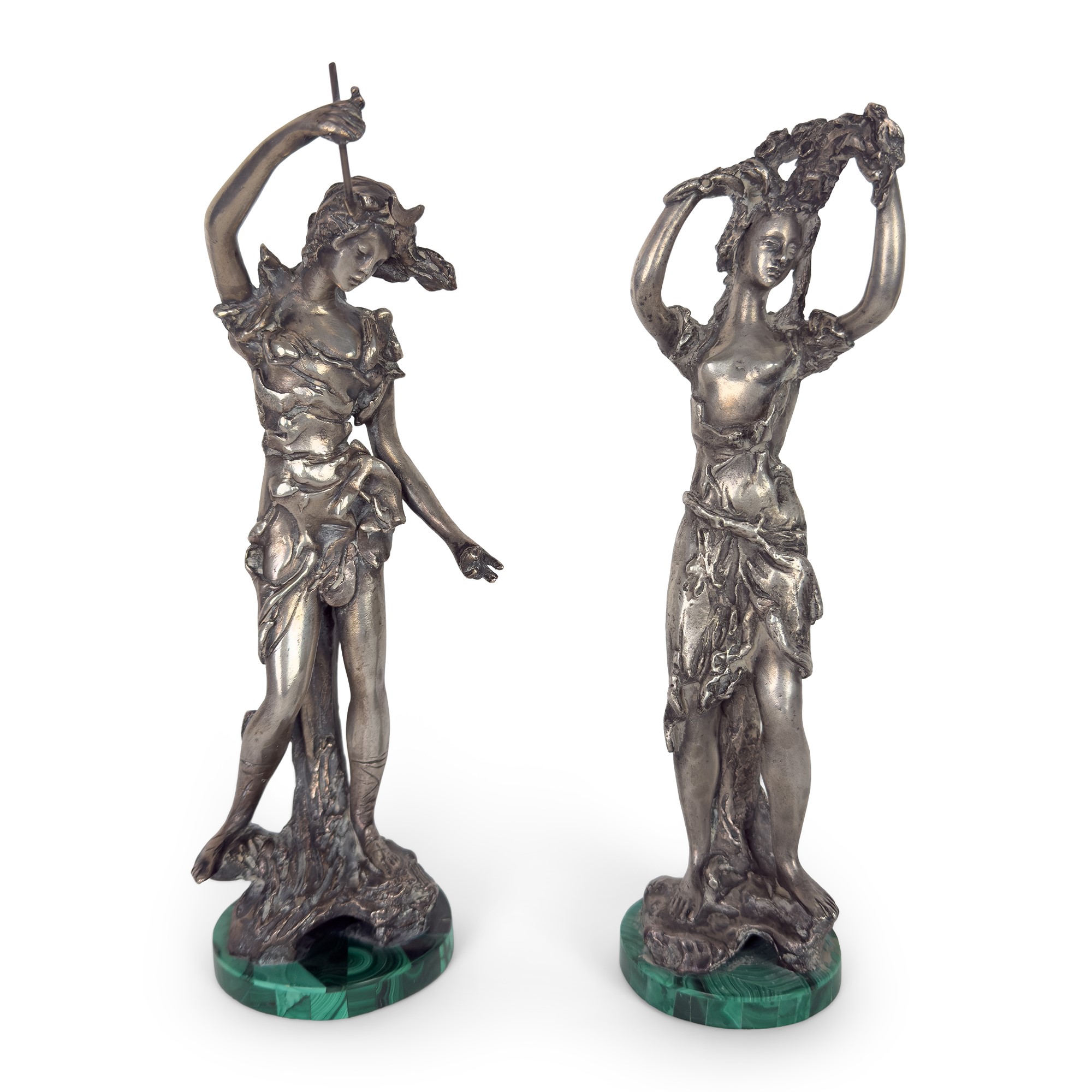 due sculture in argento a cera persa, h. cm. 25, peso lordo gr. 1.550 circa; basetta placcata in malachite