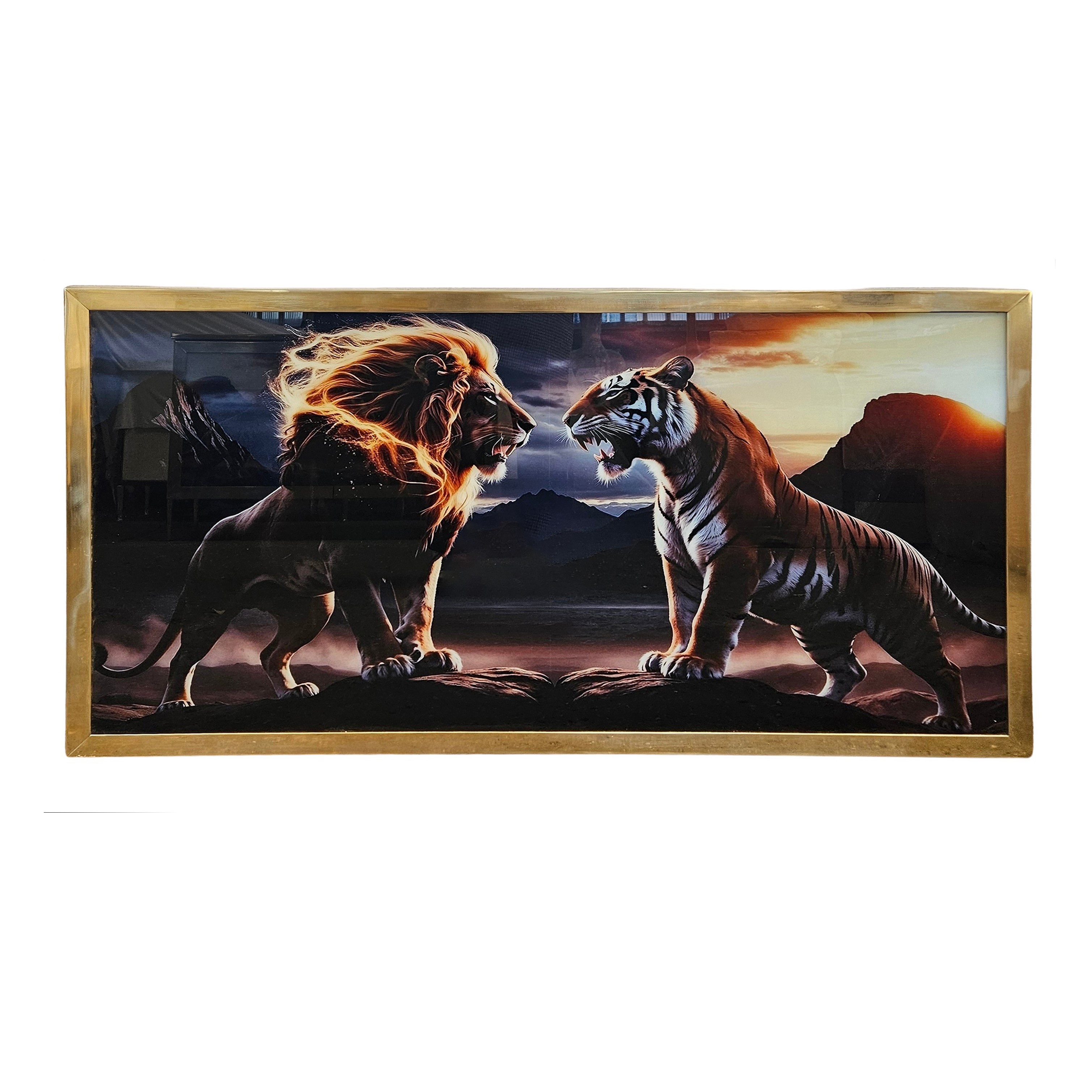 decorato dalle figure di un leone e di una tigre che si affrontano; cornice in ottone, cm. 67x127