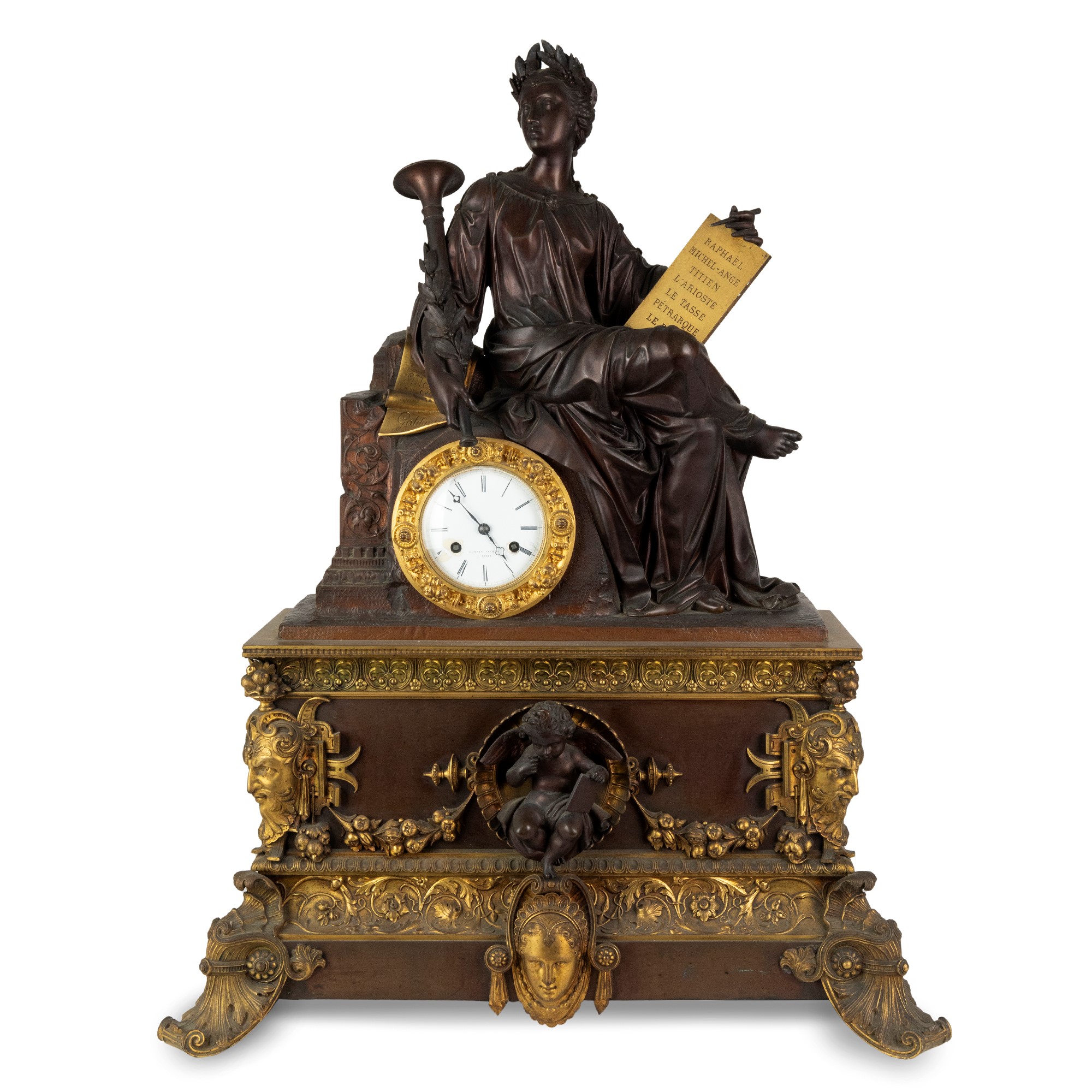 cassa parallelepipeda centrata dalla figura di un genio alato circondata da mascheroni virili e femminili, sormontata da una figura allegorica delle Arti quale musa che tiene in mano una tromba cinta di foglie di alloro e un cartiglio, seduta su un rudere classico che contiene il quadrante circolare in smalto bianco con indici in numeri romani firmato Romain Vacher à Paris, cm. 78x61x27 (vetro posteriore mancante; chiave di carica e pendolo mancanti; meccanismo da revisionare)