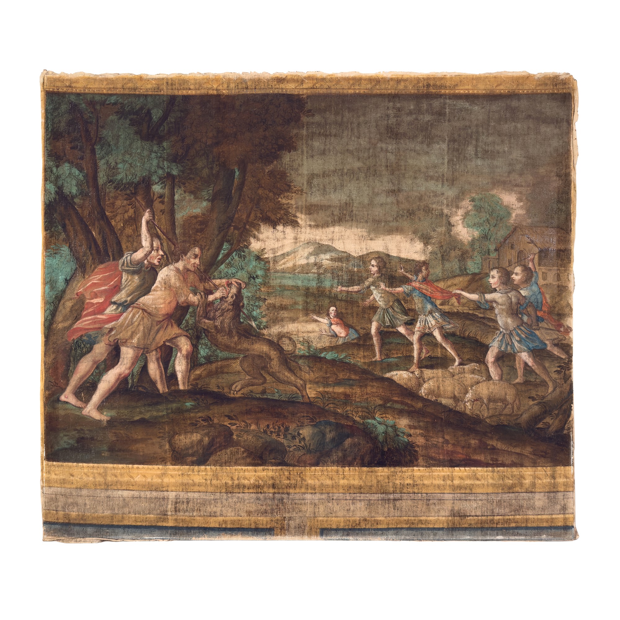 Scena di caccia al leone, grande succo d'erba, XVIII secolo