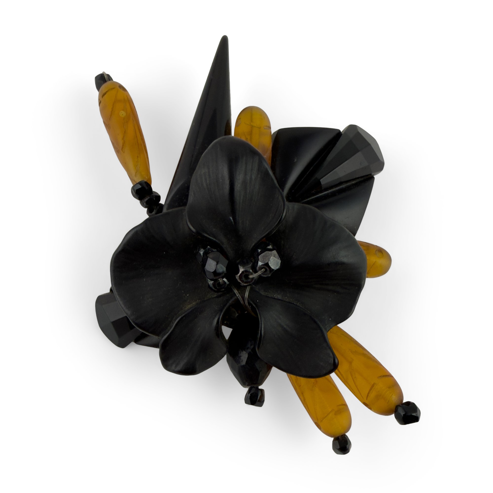 spilla orchidea in bachelite nera e color ambra, h. cm. 7,5