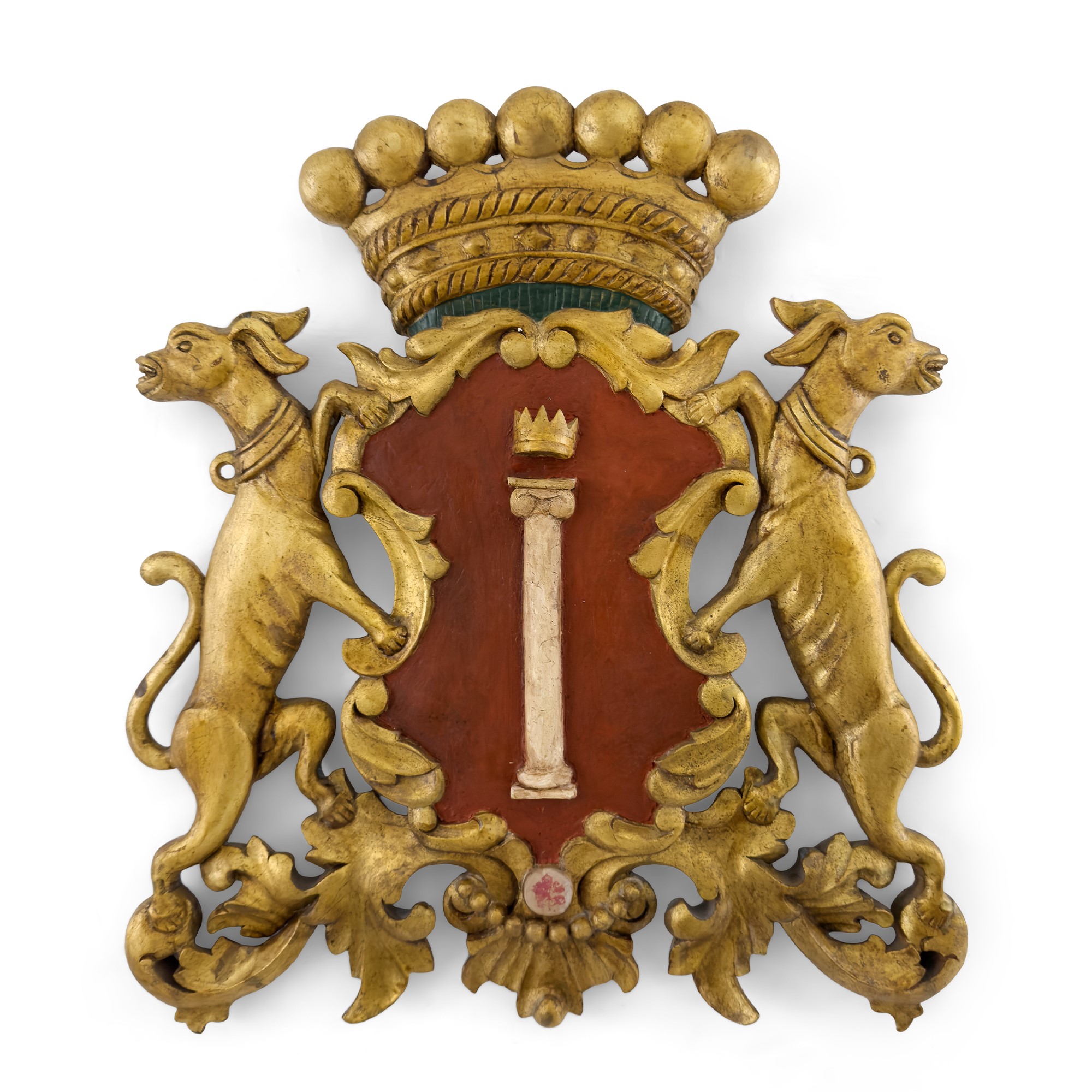 qualificato da una colonna sormontata da una corona, trattenuta idealmente da due animali rampanti, cm. 59x55