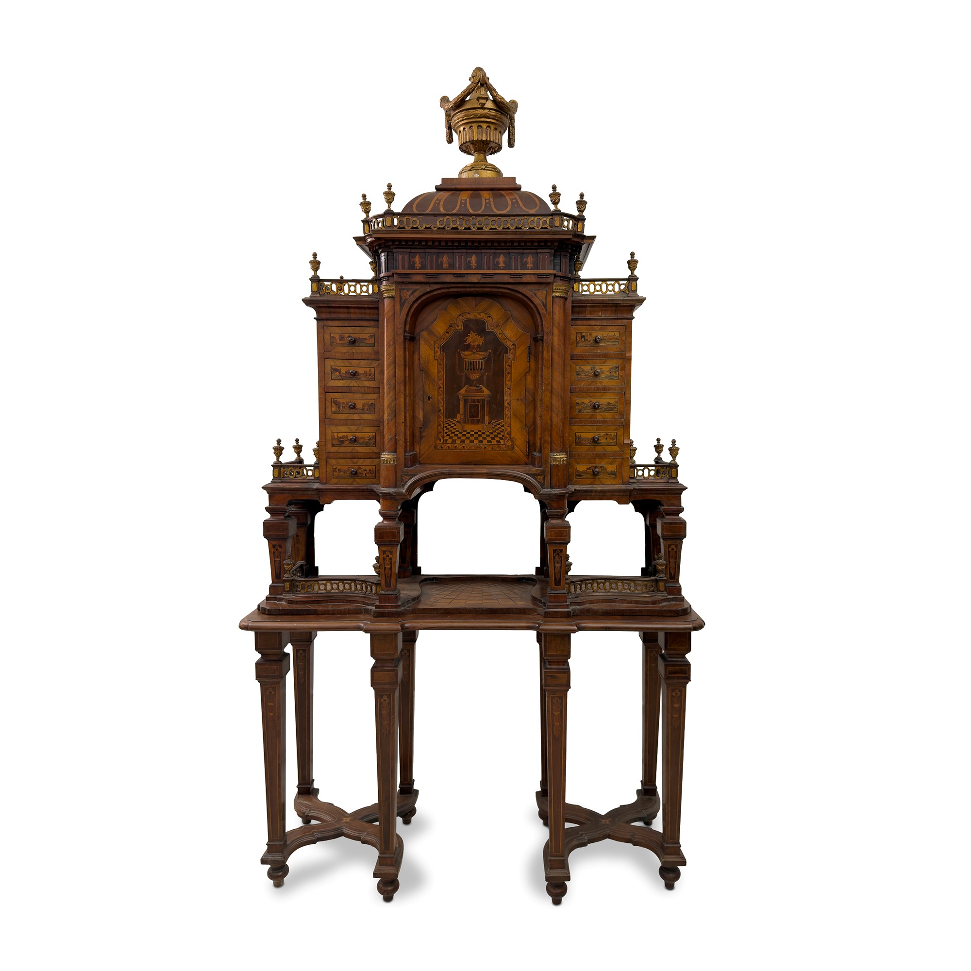 fronte a struttura architettonica caratterizzato da un vaso traboccante fiori e affiancato da dieci cassetti in colonna ciascuno dei quali intarsiato a raffigurare paesaggi minimi con casolari e apribili tramite un meccanismo segreto; un ulteriore cassetto caratterizzato da gigli stilizzati è posto sopra la cortina centrale. Chiudono il mobile ringhierine traforate in legno dorato e un vaso scolpito a tuttotondo parimenti in legno dorato che si erge dalla sommità del mobile. Lo stipo poggia su una base con montanti a obelisco di epoca posteriore, misure complessive: cm. 225x115,5x44 (qualche difetto)