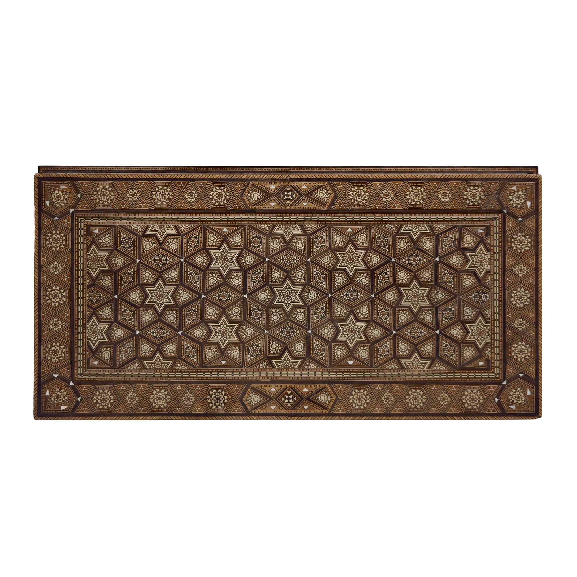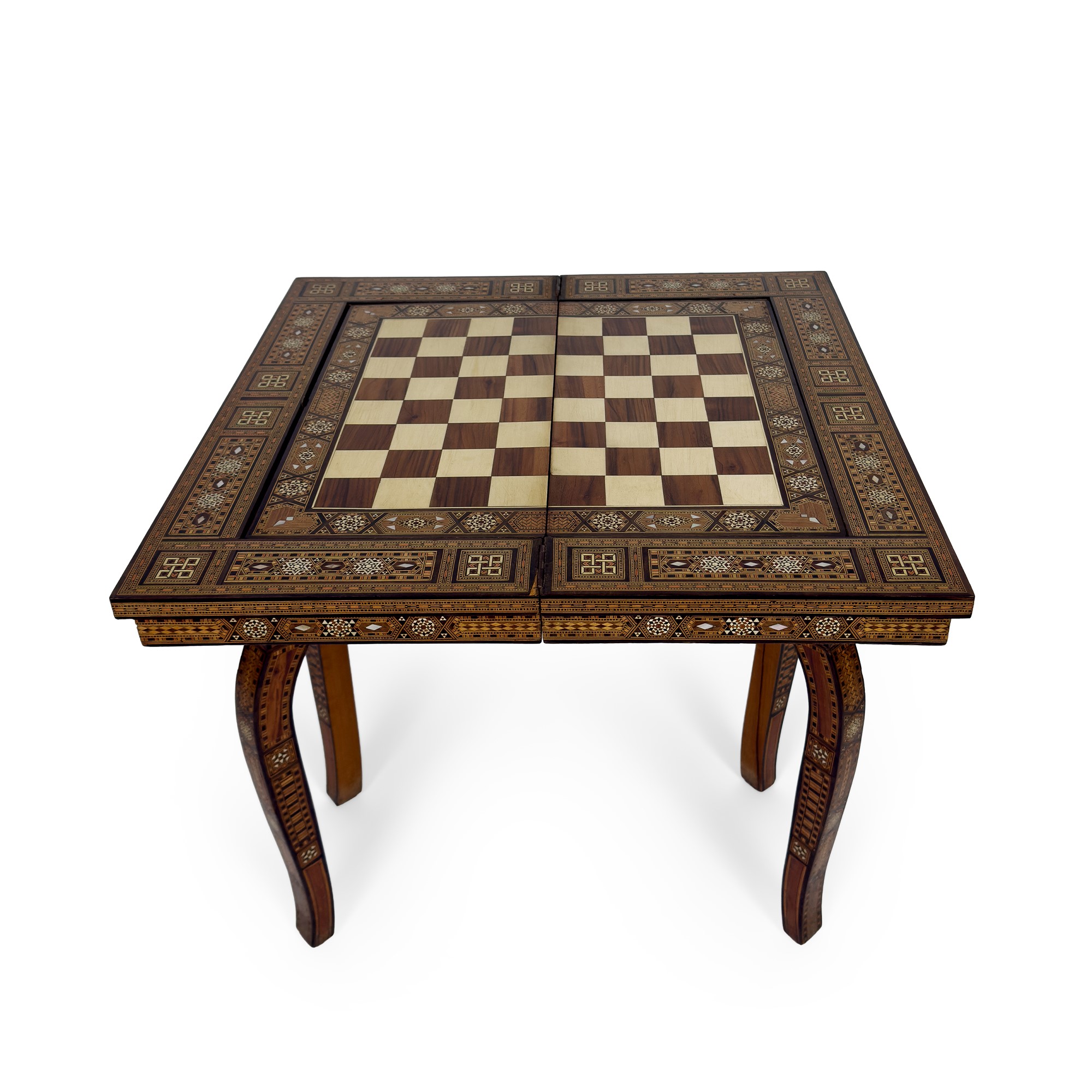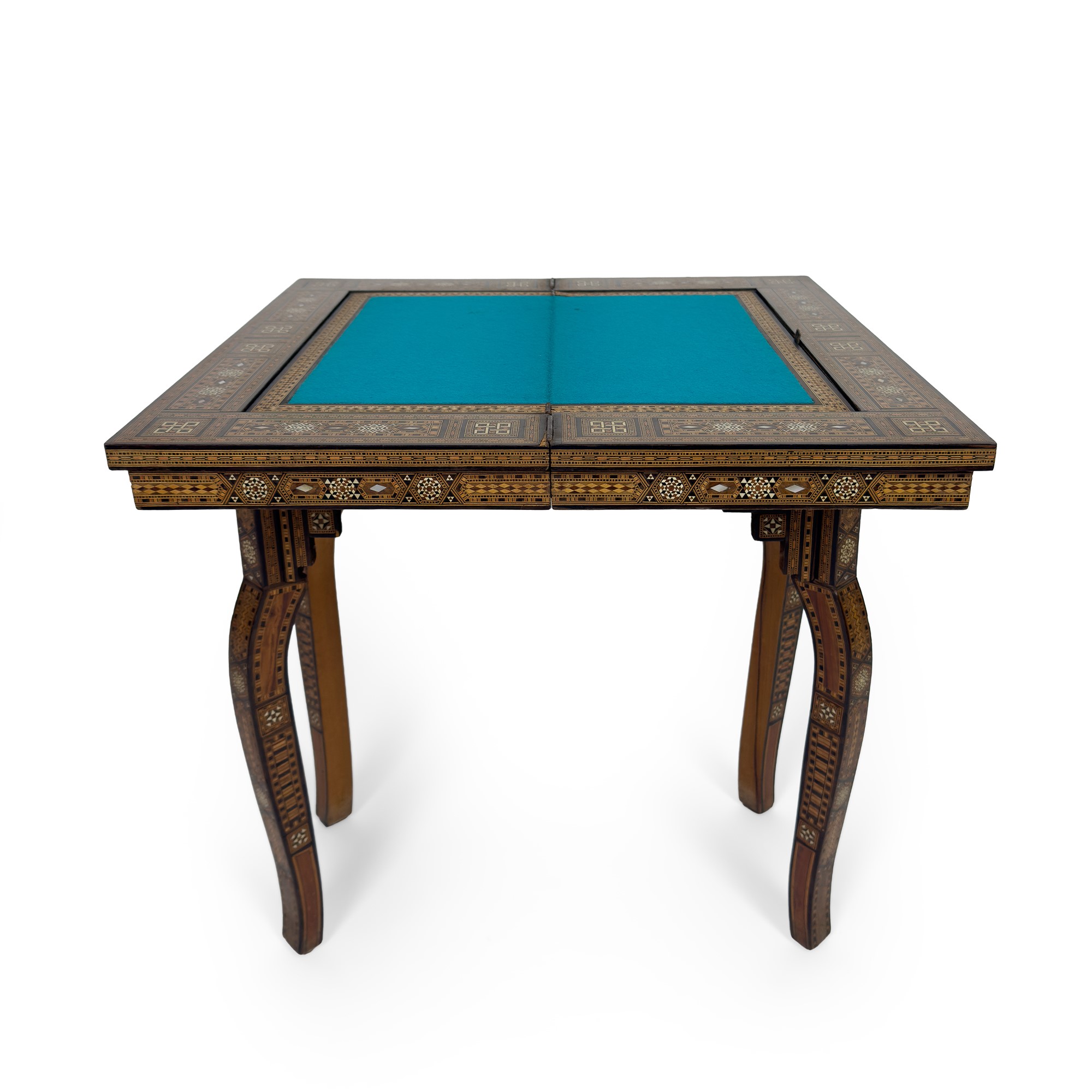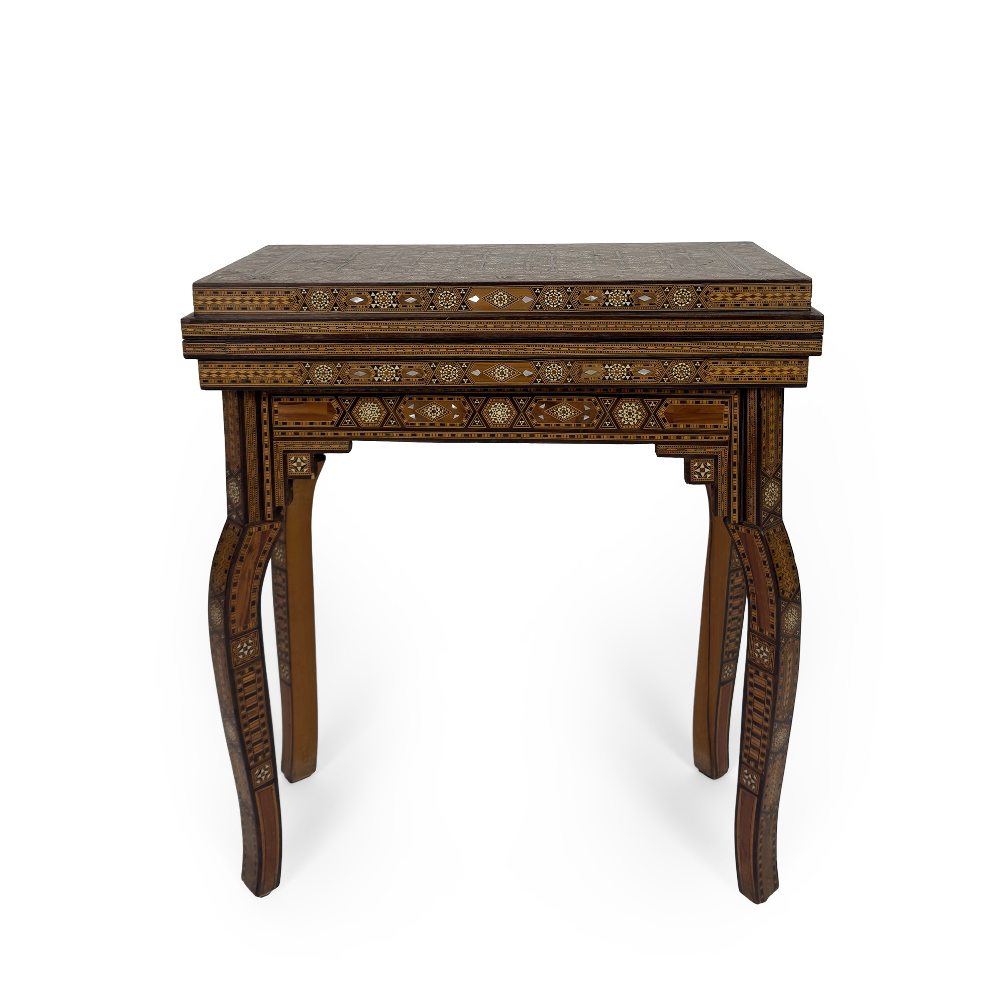 interamente intarsiato a fitti motivi arabeggianti in osso e madreperla; piano apribile a libro che cela il gioco del backgammon e degli scacchi; gambe mosse, cm. 71x62x31 (chiuso)