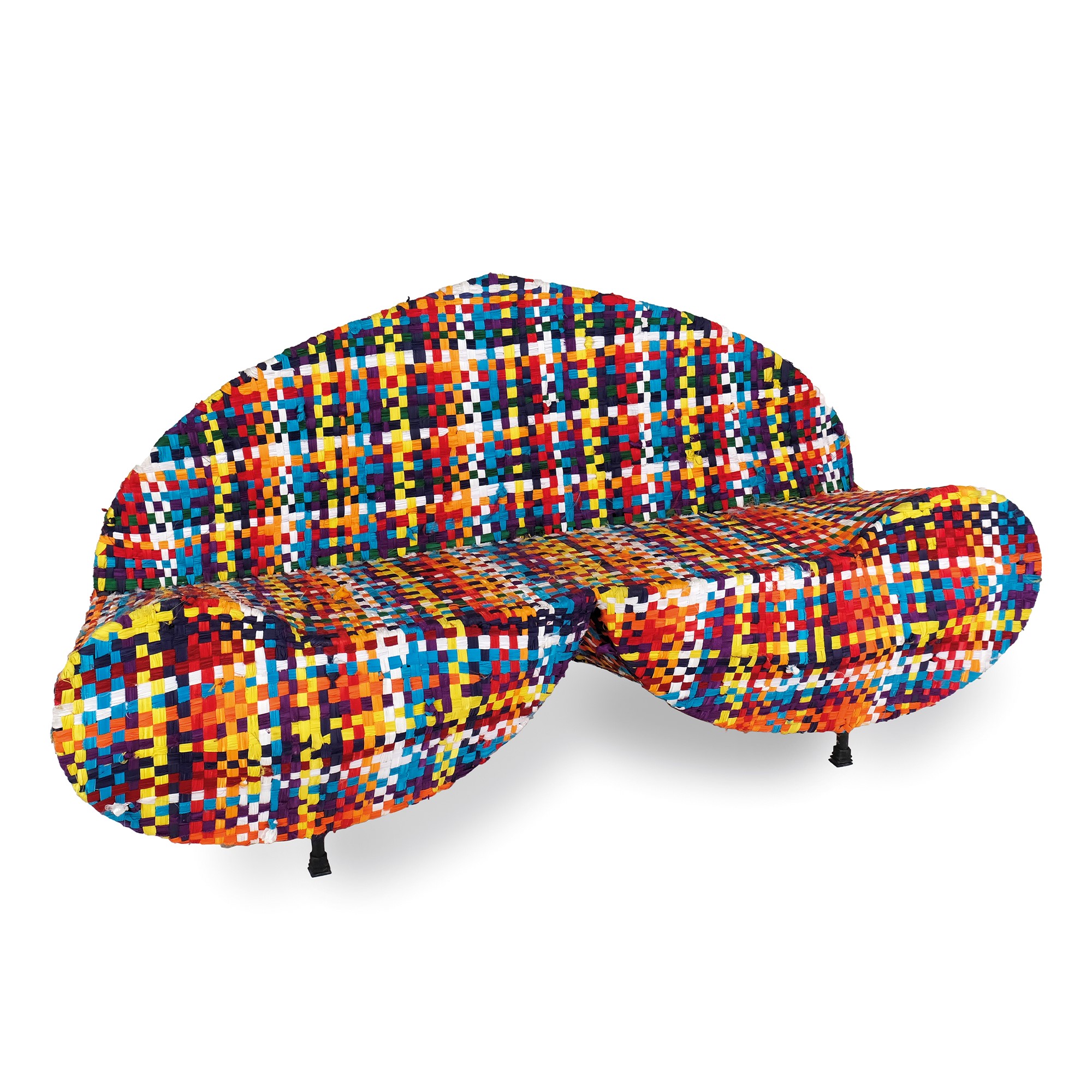 Divano a due posti in tessuto multicolor intrecciato; monogramma AS in basso sul lato posteriore, cm. 80x160x50