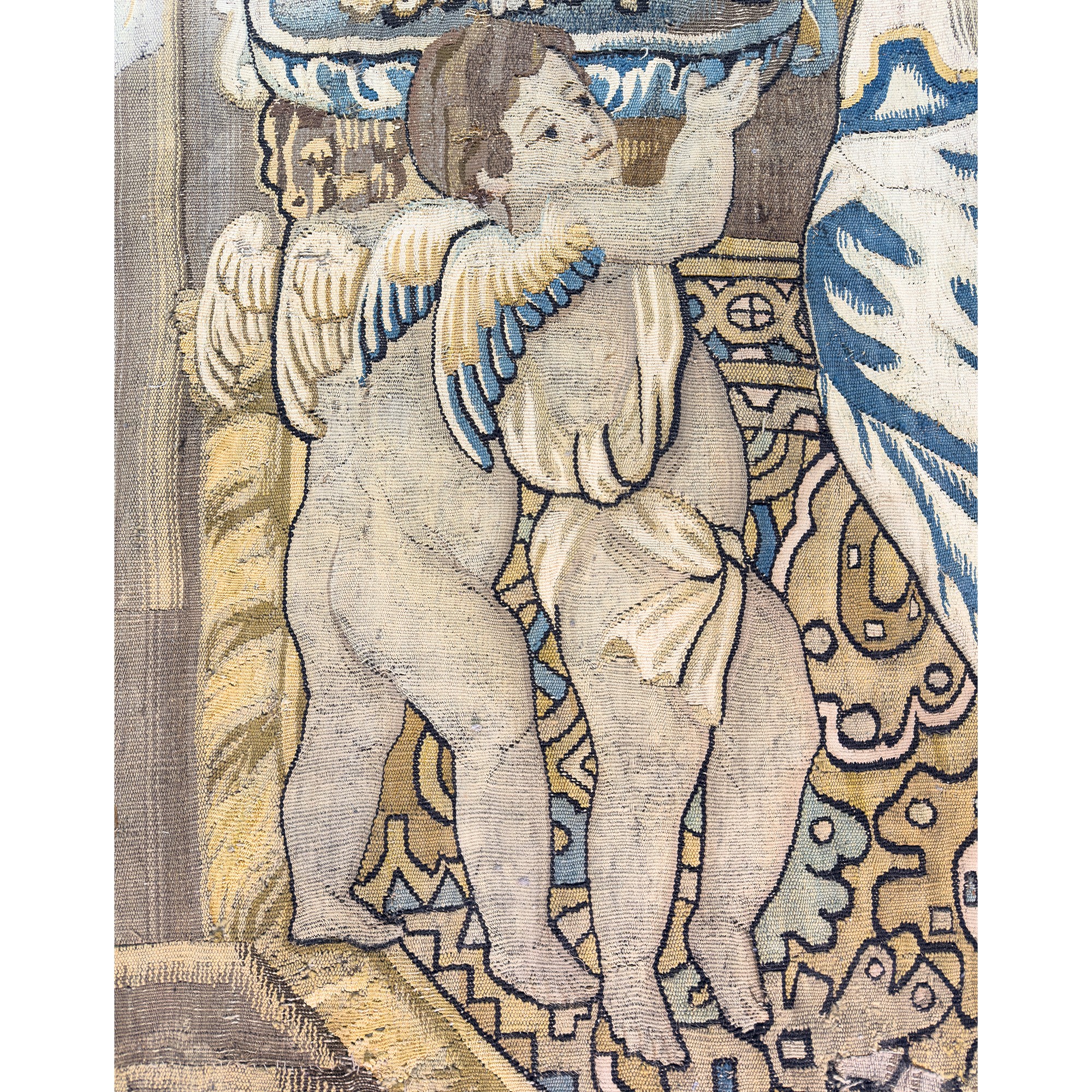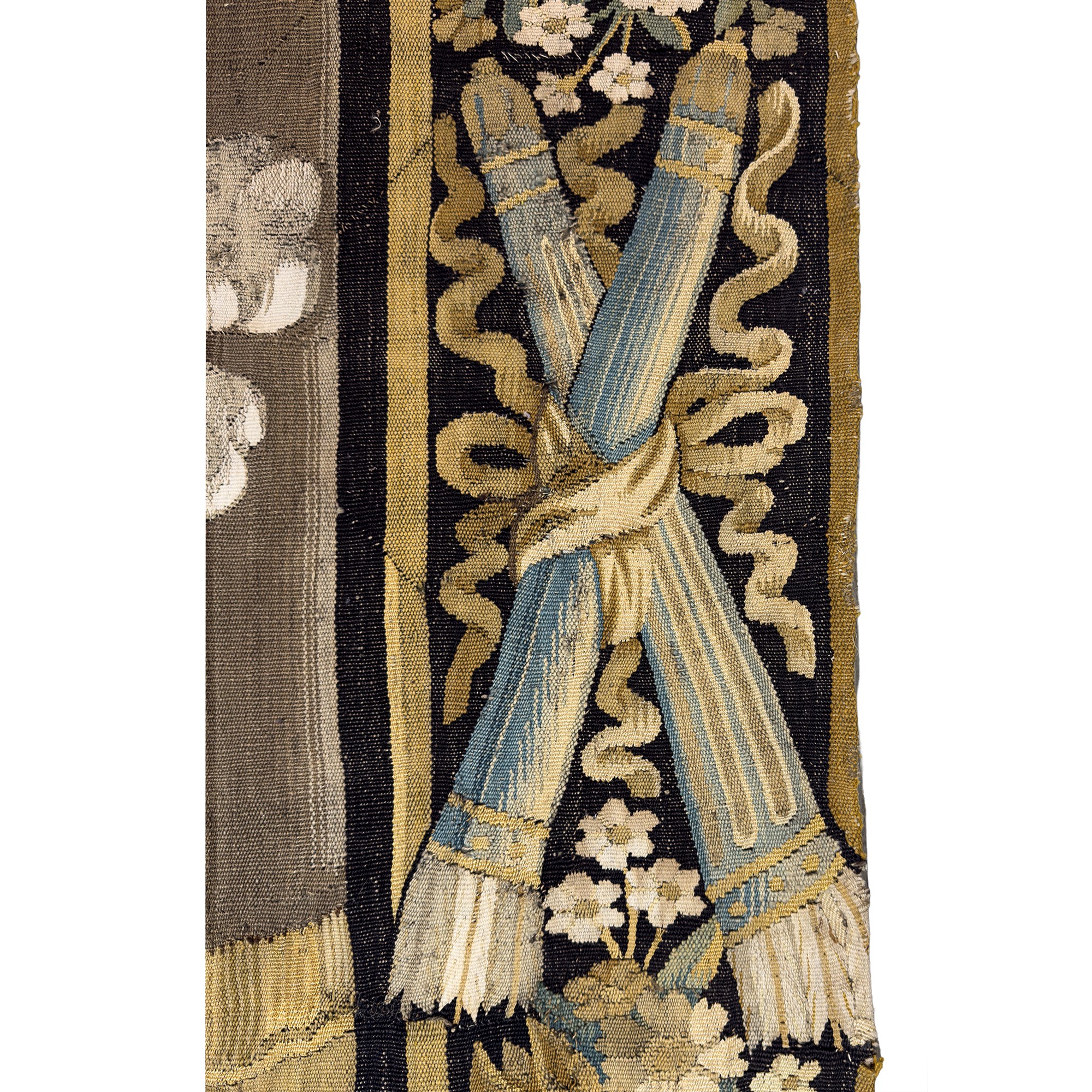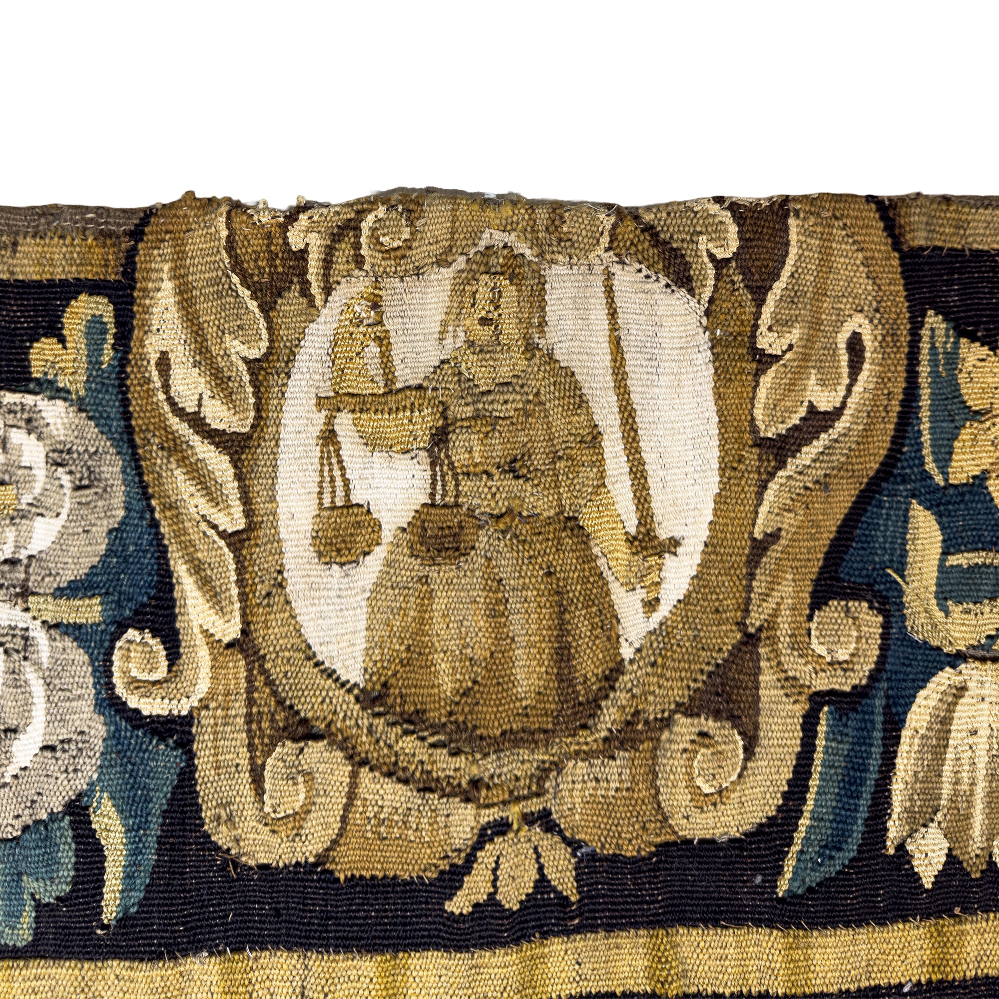 bordura riccamente decorata a composizioni di fiori e foglie, interrotte sui lati lunghi da due faretre incrociate e sui lati corti dalla raffigurazione della Giustizia e, verosimilmente, della Morte, cm. 287x229 (qualche difetto)