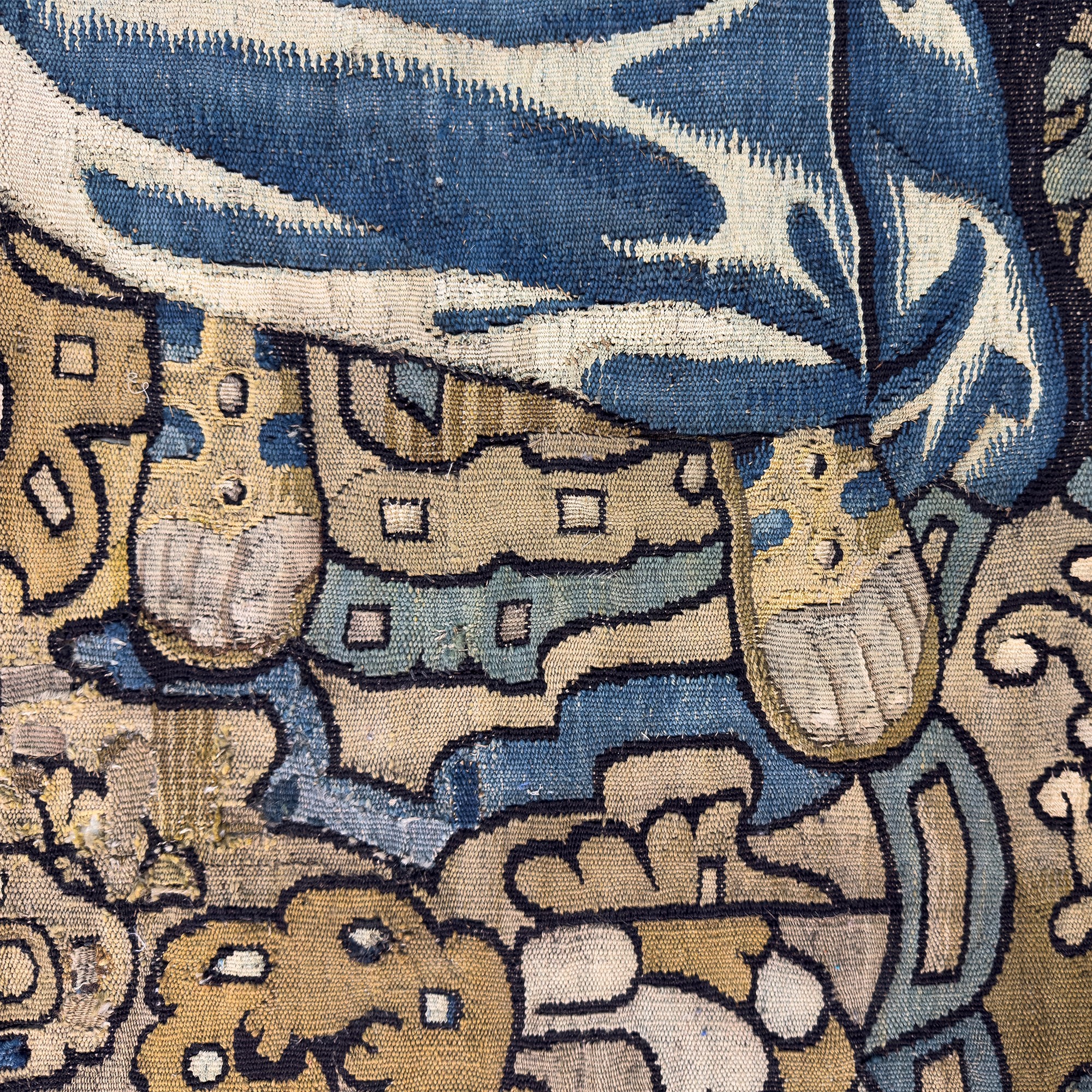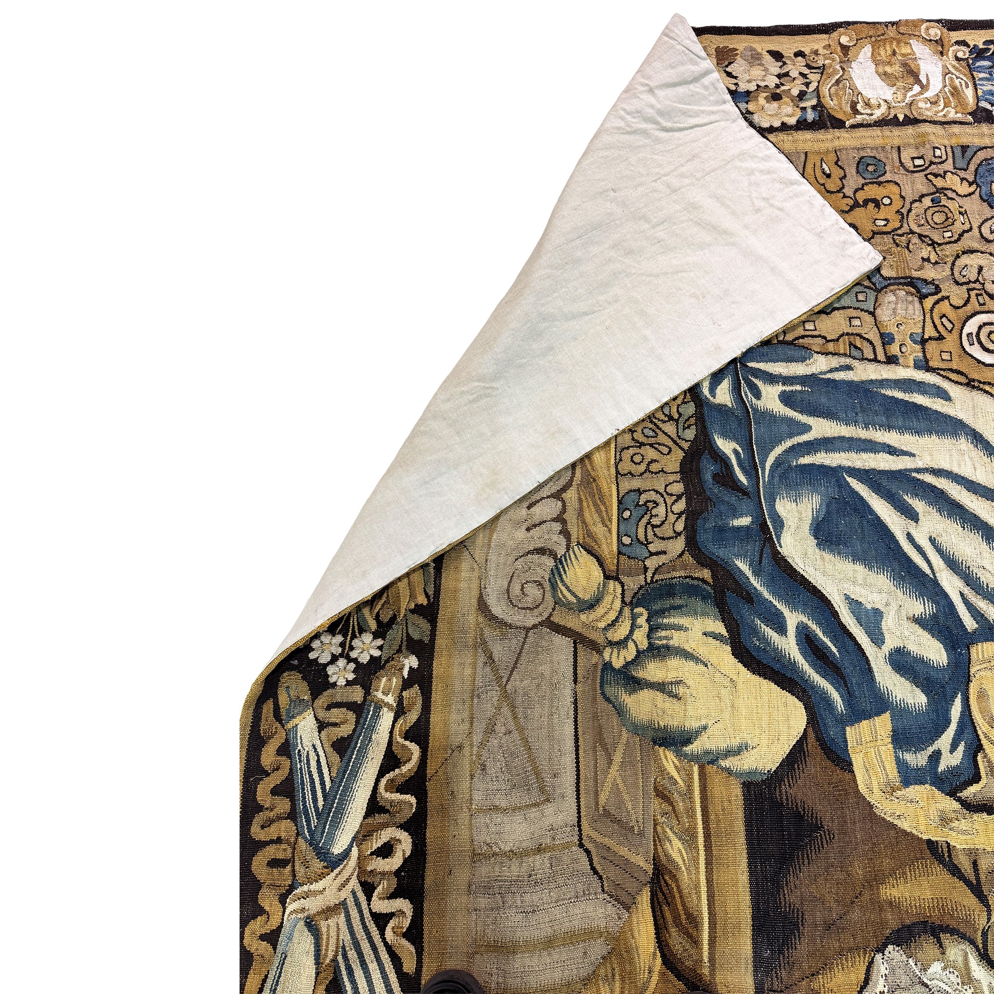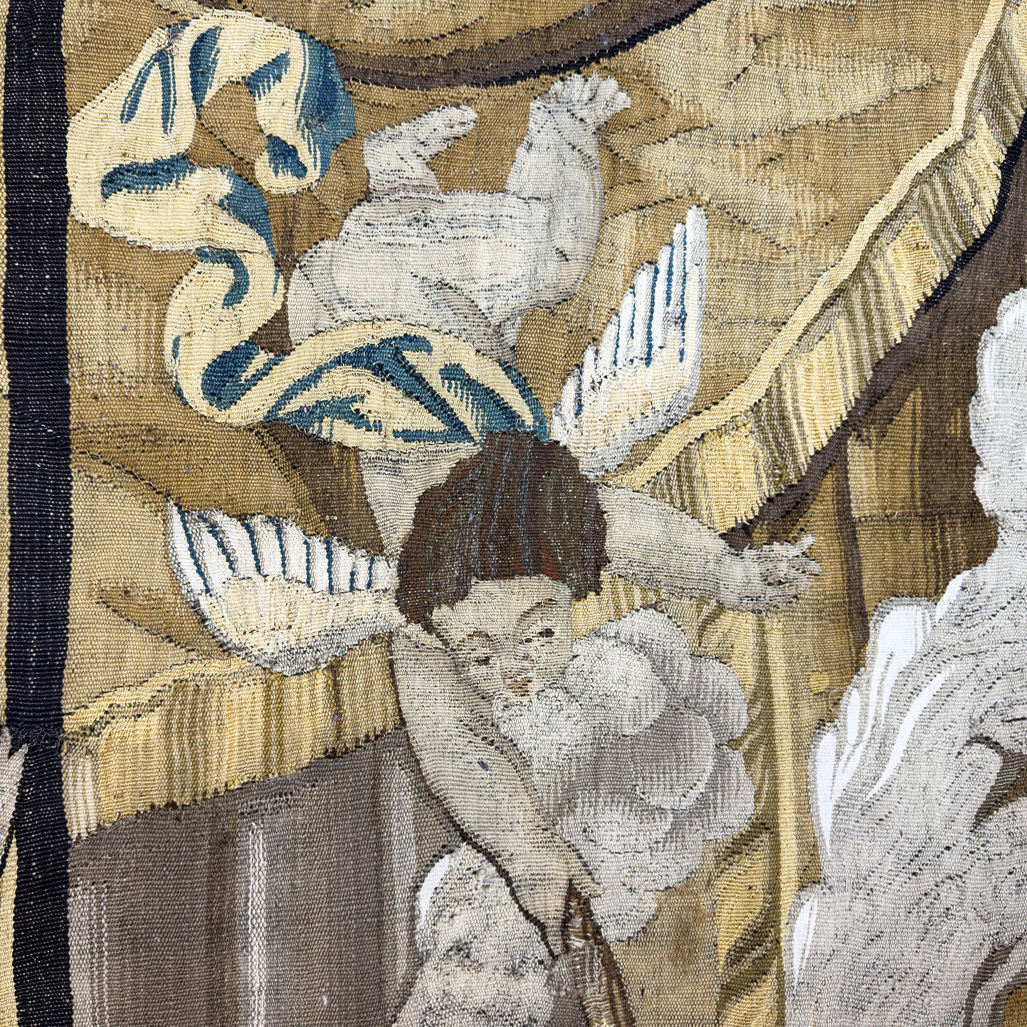 bordura riccamente decorata a composizioni di fiori e foglie, interrotte sui lati lunghi da due faretre incrociate e sui lati corti dalla raffigurazione della Giustizia e, verosimilmente, della Morte, cm. 287x229 (qualche difetto)