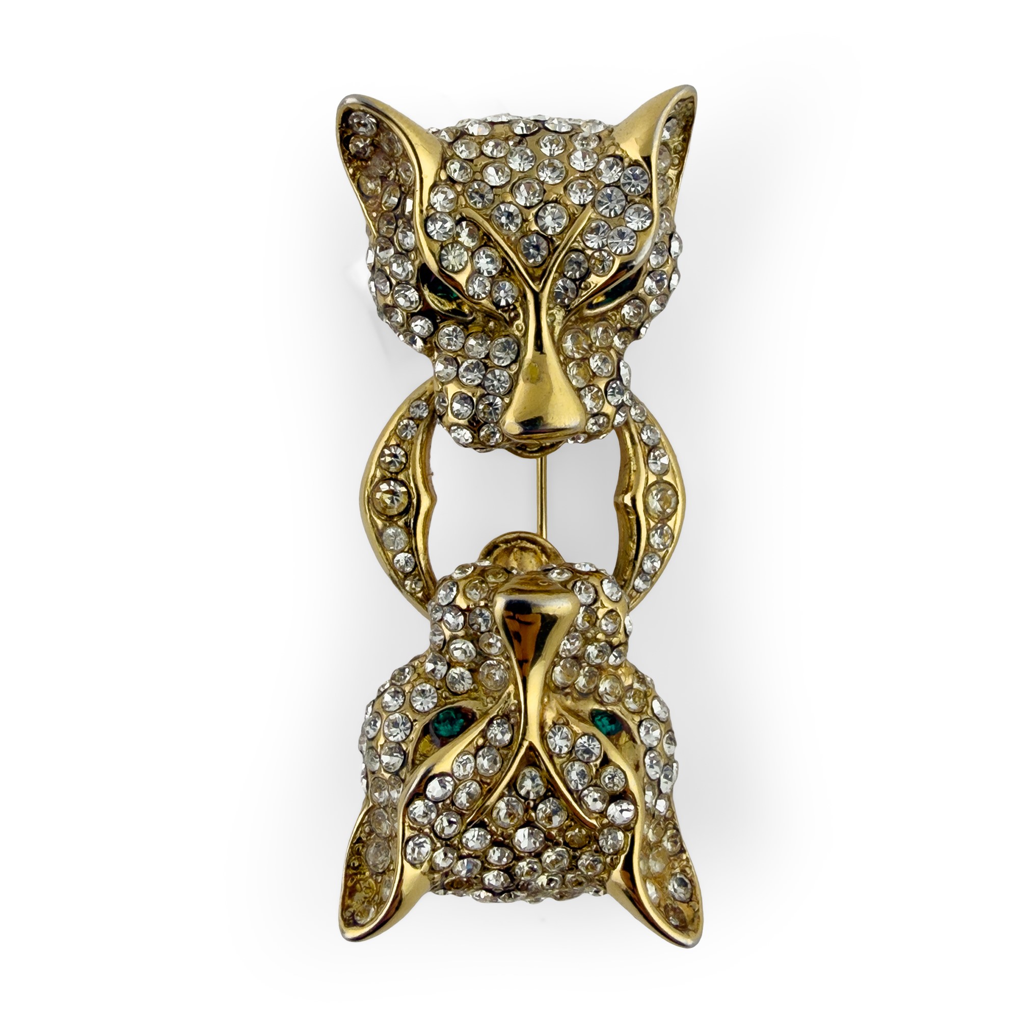 spilla in metallo dorato cesellata a testa di pantera con strass, l. cm. 6,5