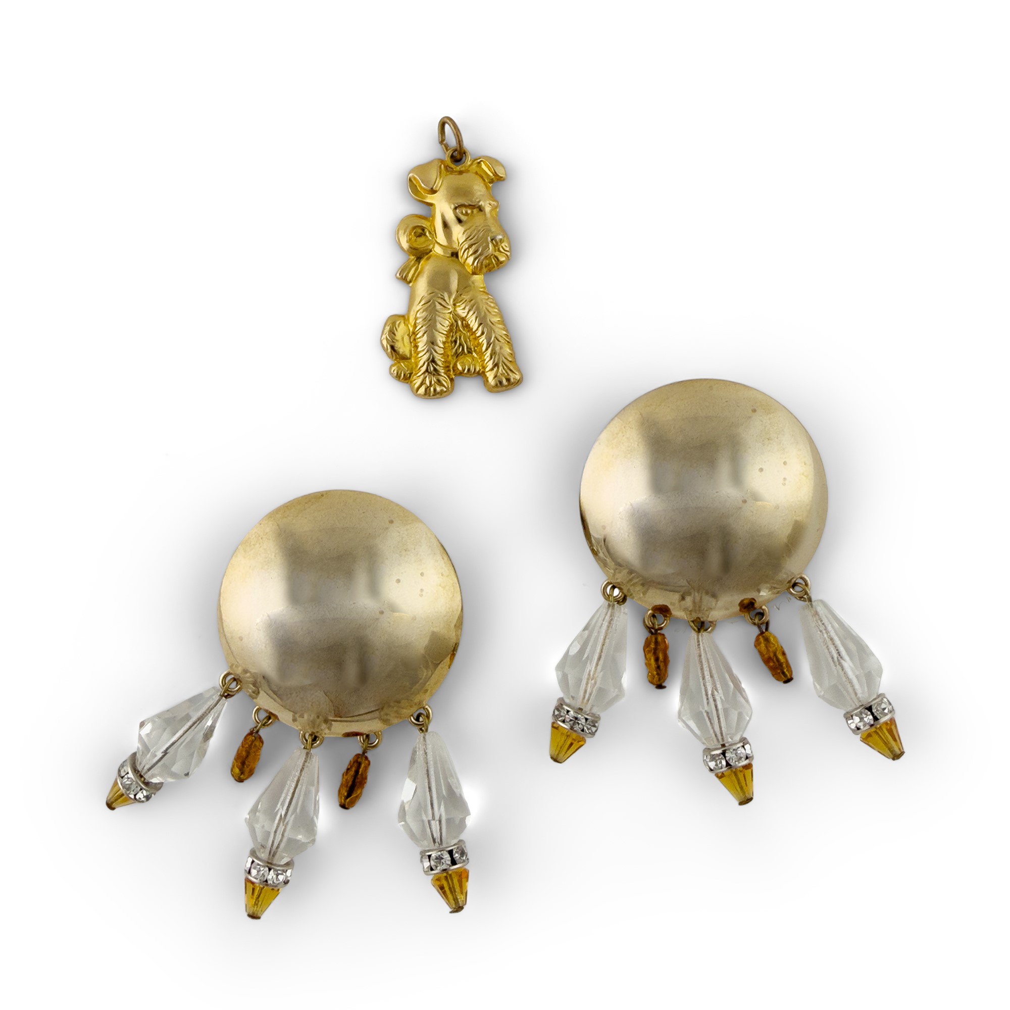 paio di orecchini in metallo dorato con pietre trasparenti a ciondolo e chiusura a clip UNITO a ciondolo in metallo dorato a forma di fox terrier, gli orecchini: l. cm. 6,5; il ciondolo: l. cm. 4,5