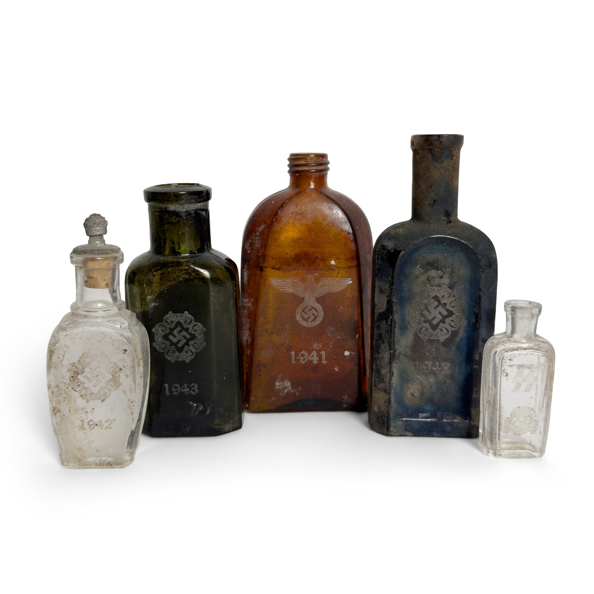 Cinque piccole bottiglie in vetro di diverso colore e forma, 1941-1944