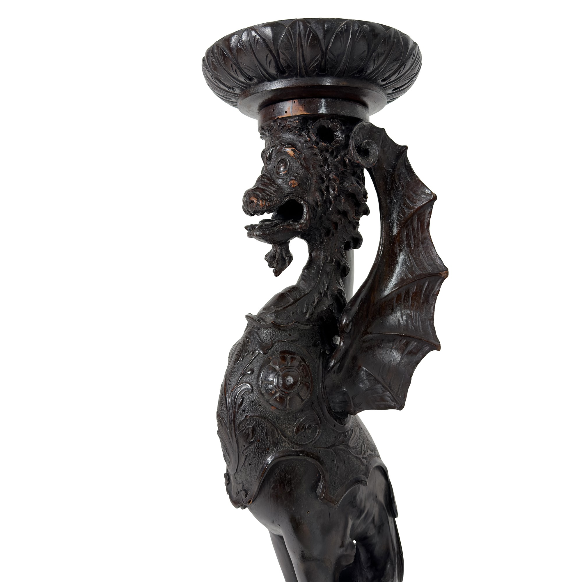 caratterizzate dalla figura di un grifone alato; base circolare su tre piedi a voluta fogliata; h. cm. 101; il piano: d. interno cm. 18,5