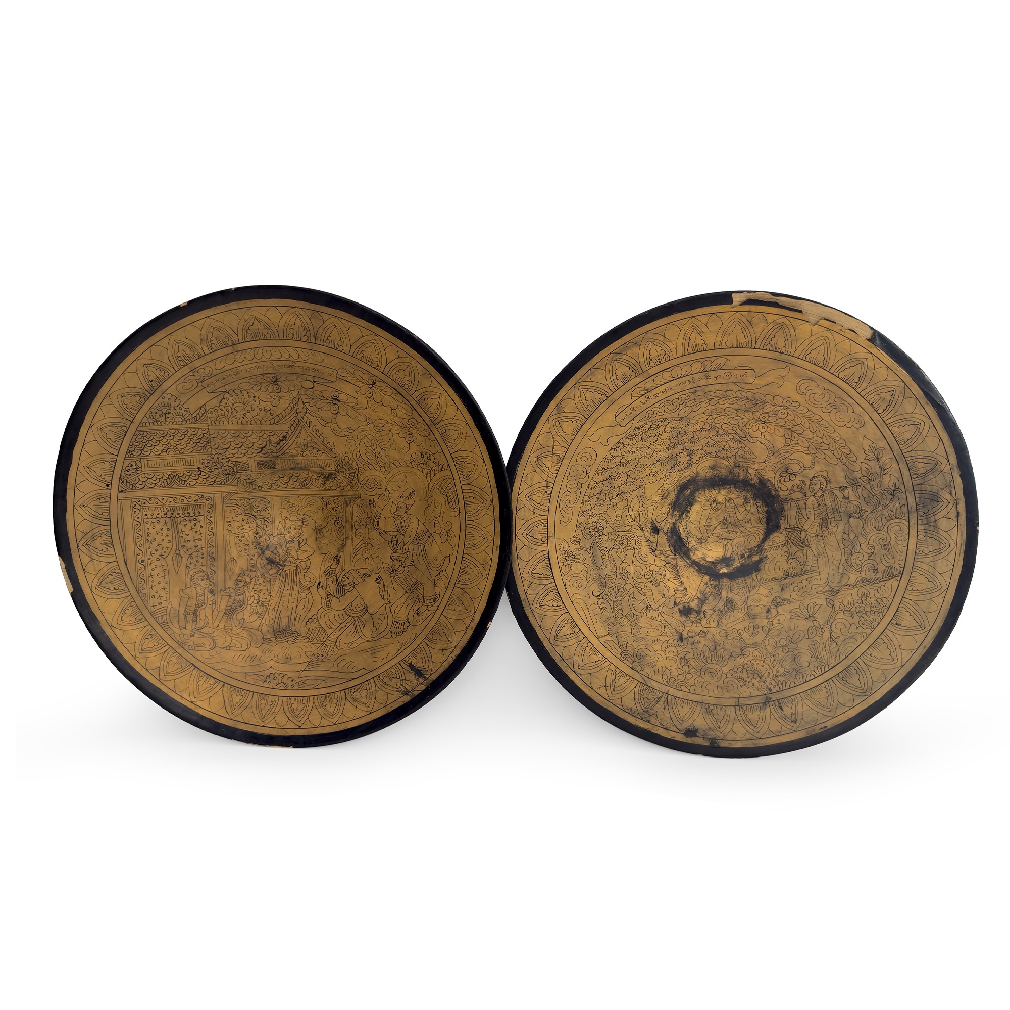 in legno laccato nero e dorato, dipinti a scene con numerose figure, d. cm. 60,5 (qualche difetto e segno di usura)