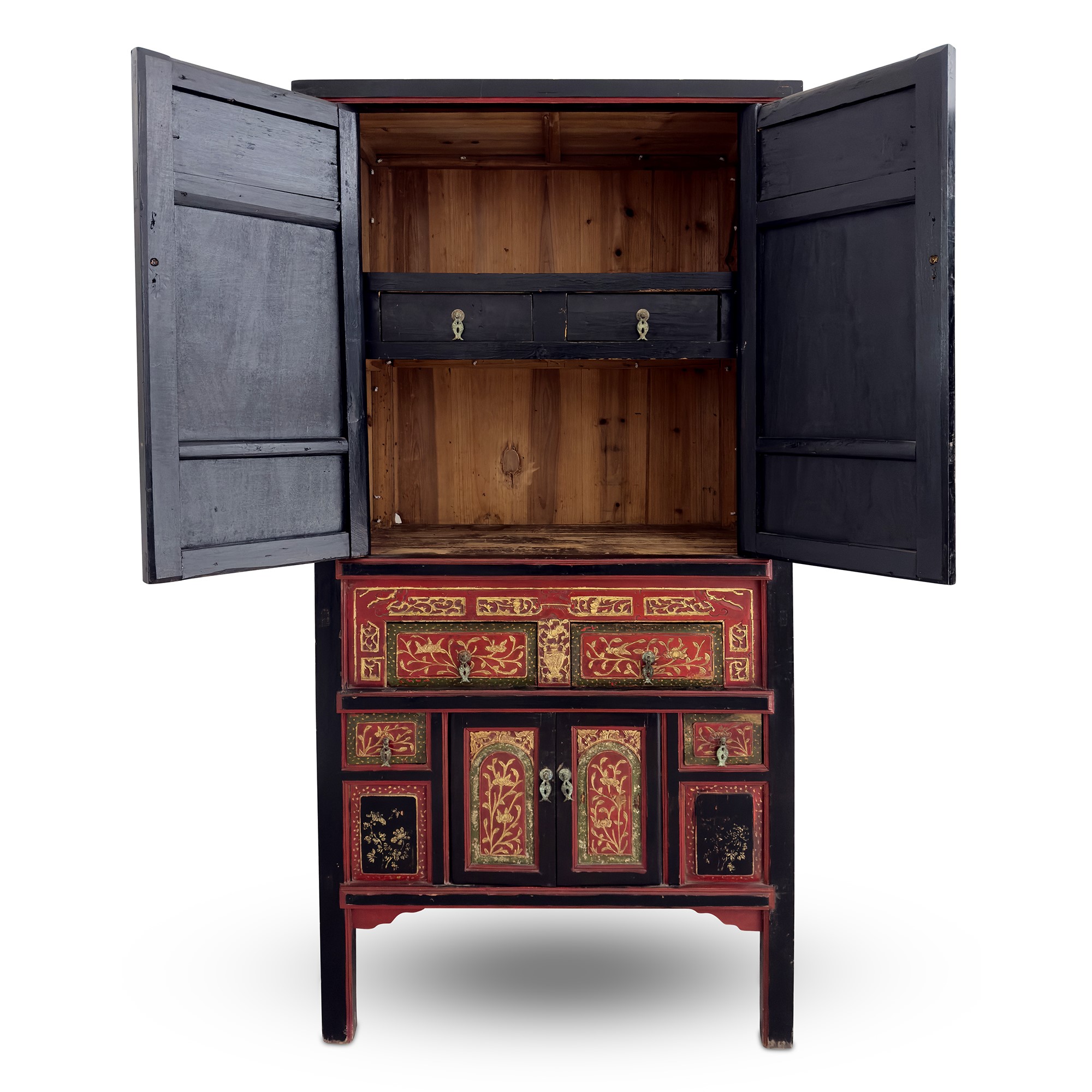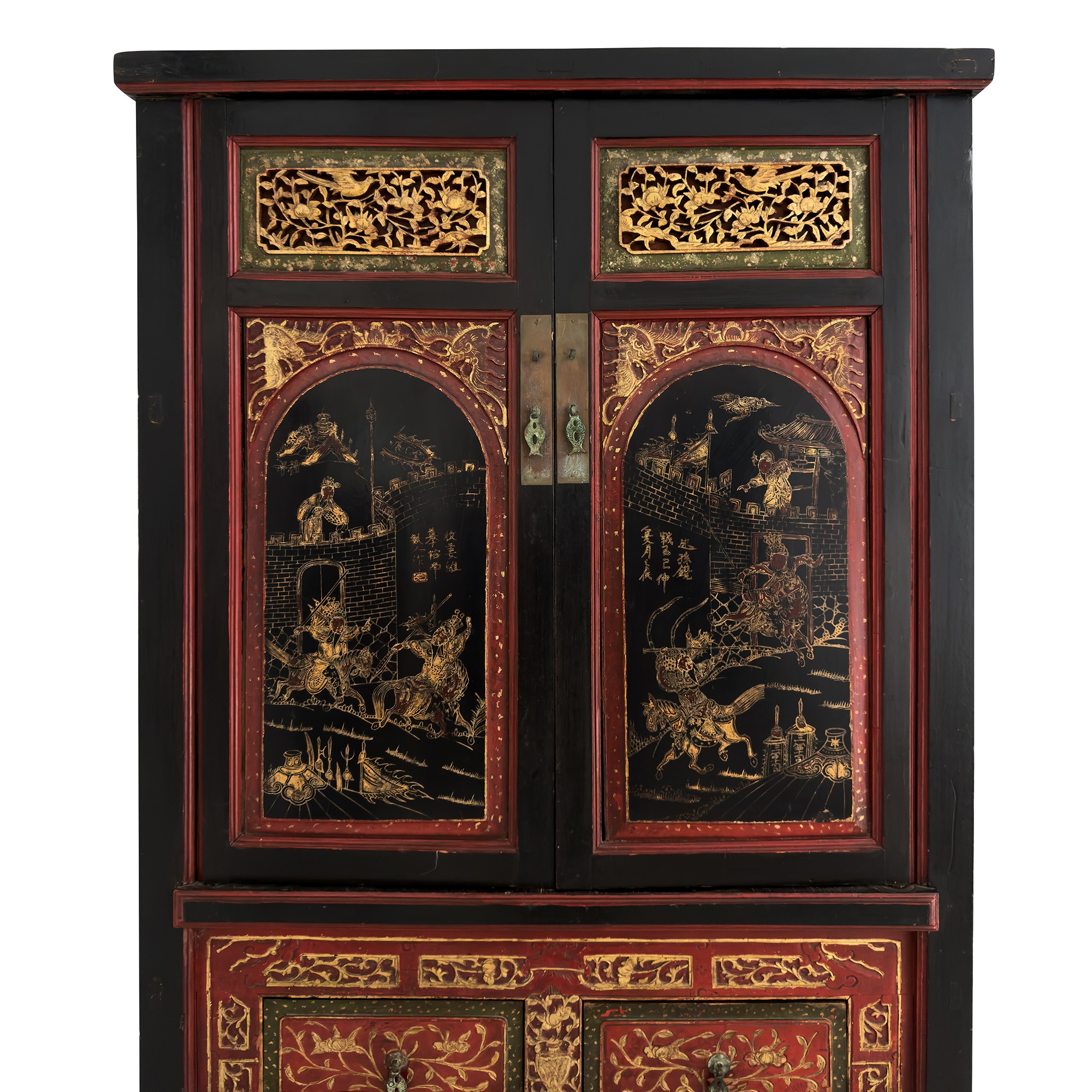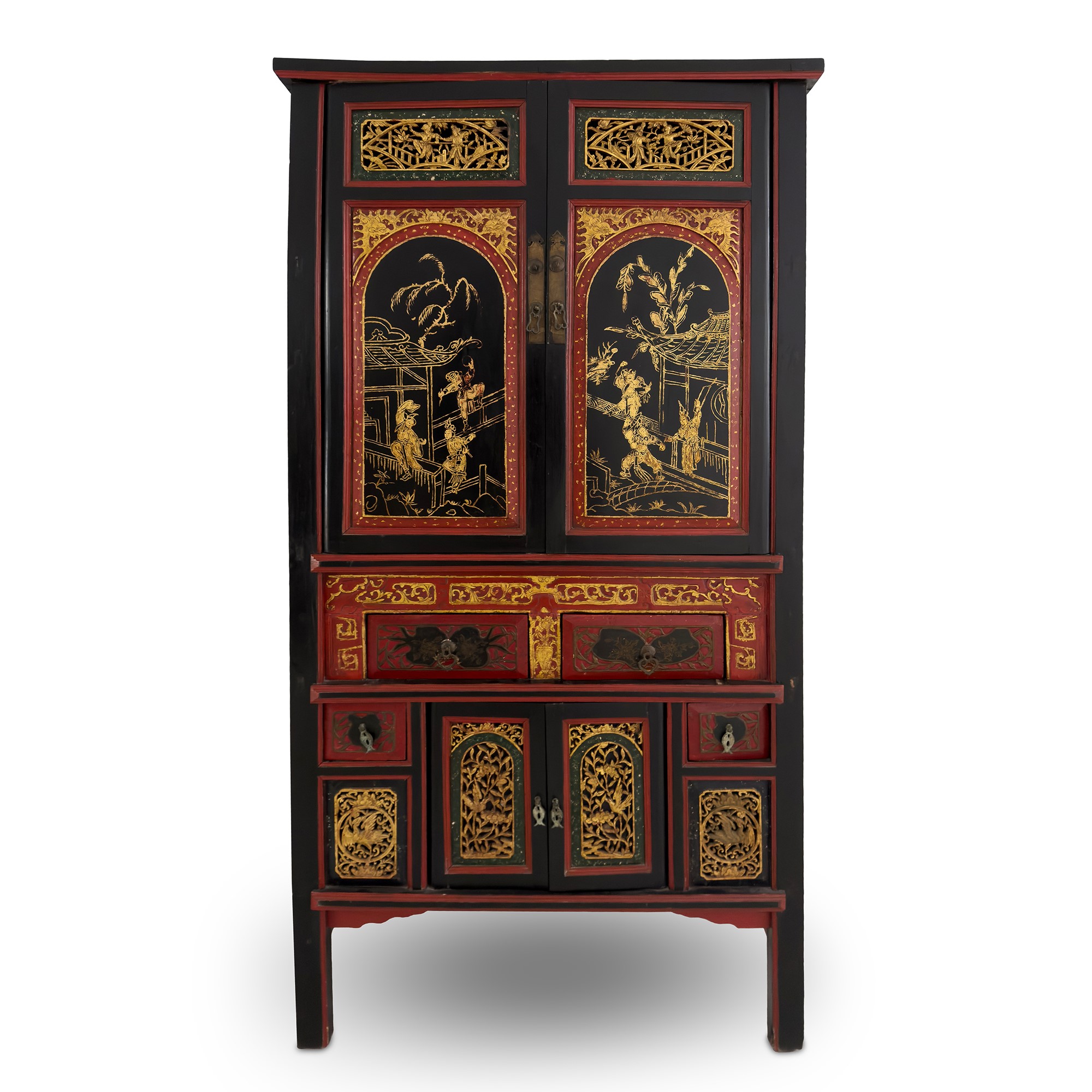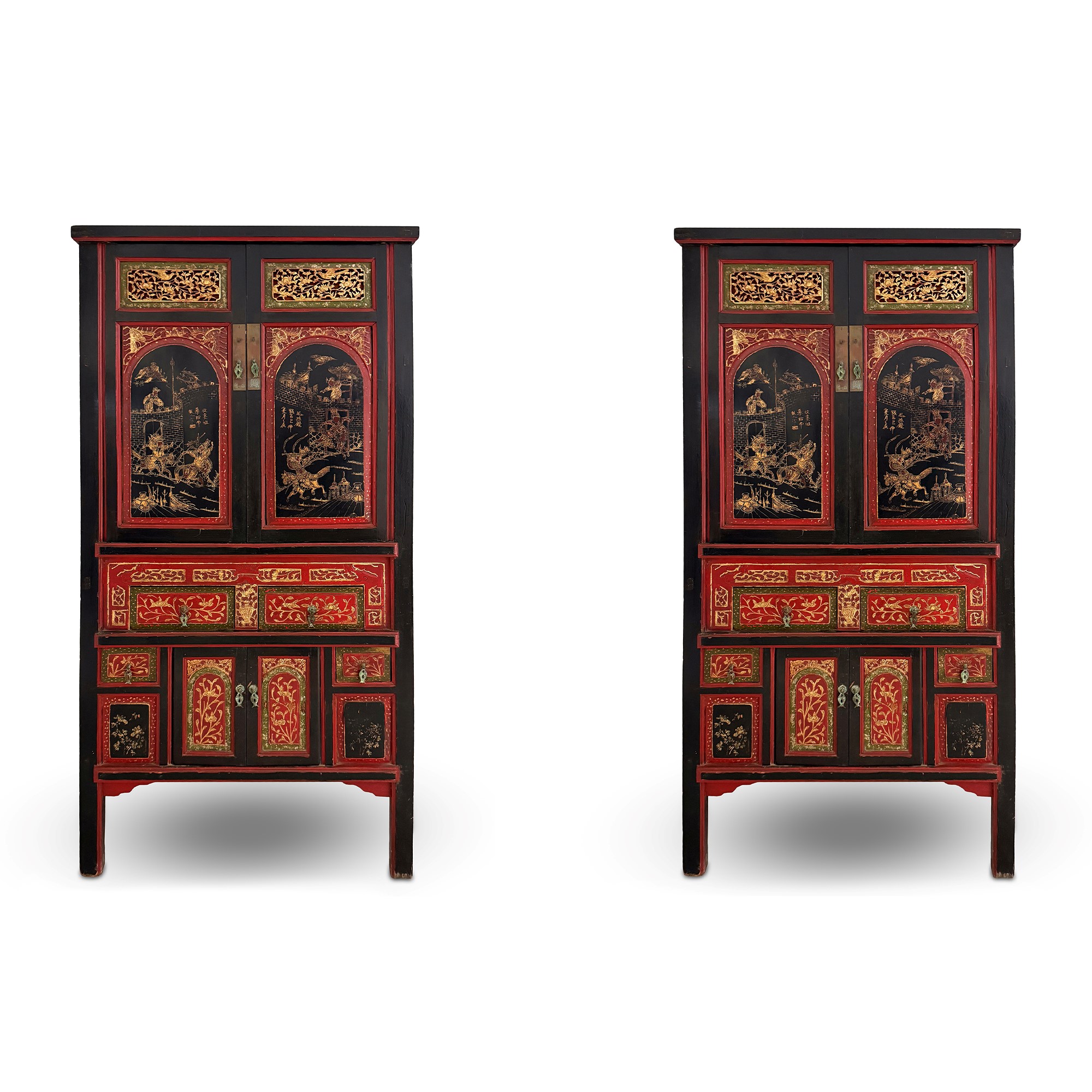 Coppia di mobili a doppio corpo in legno laccato rosso, nero e dorato, Arte Orientale