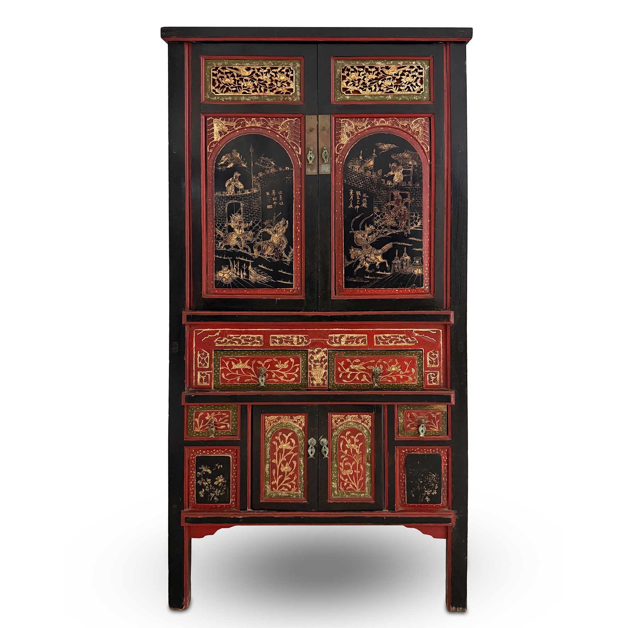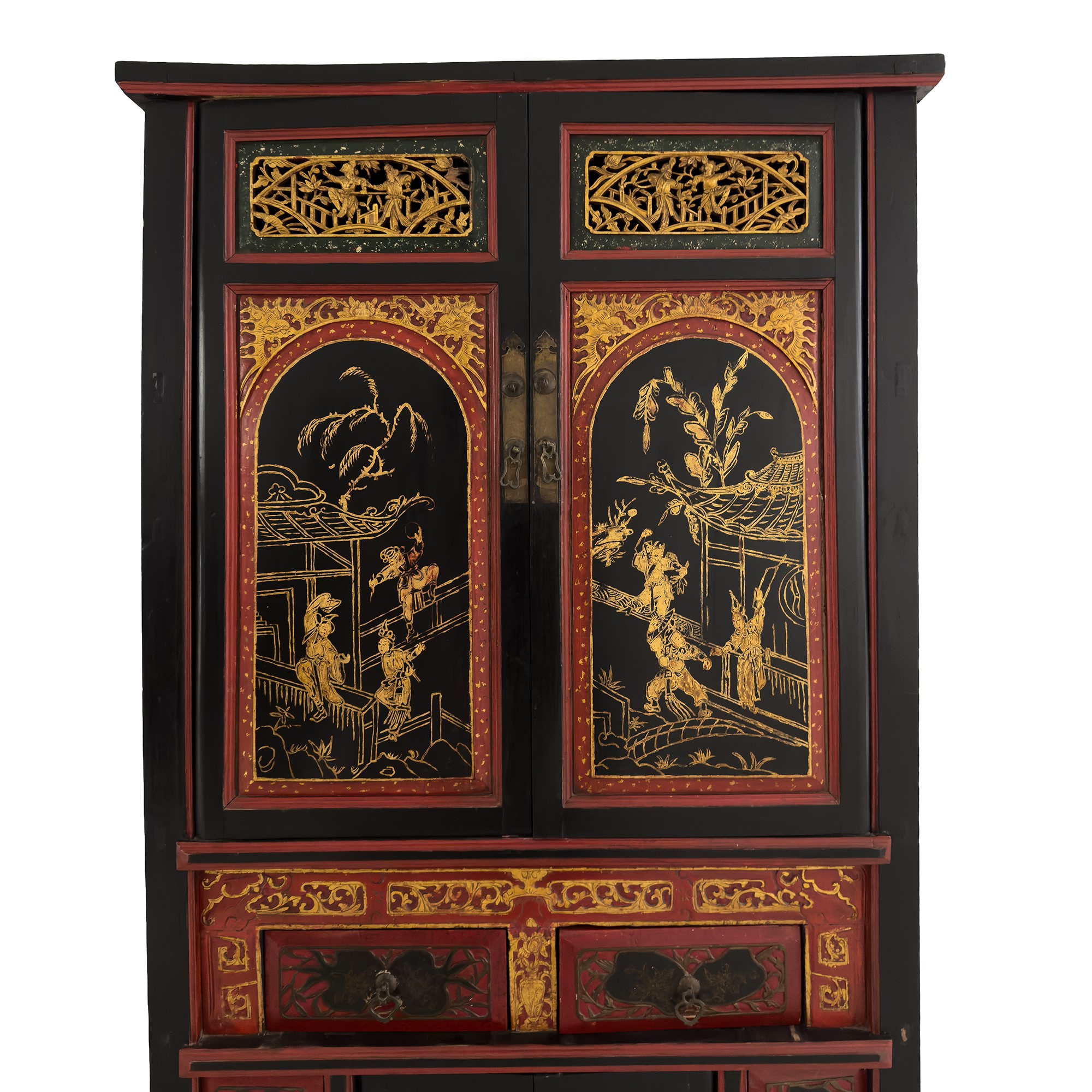 fronte a due ante arricchite da paesaggi minimi con pagoda e personaggi orientali; inferiormente due cassetti affiancati sovrastanti due portine traforate affiancate da due tiretti sopra due formelle a giorno, cm. 184x94x50