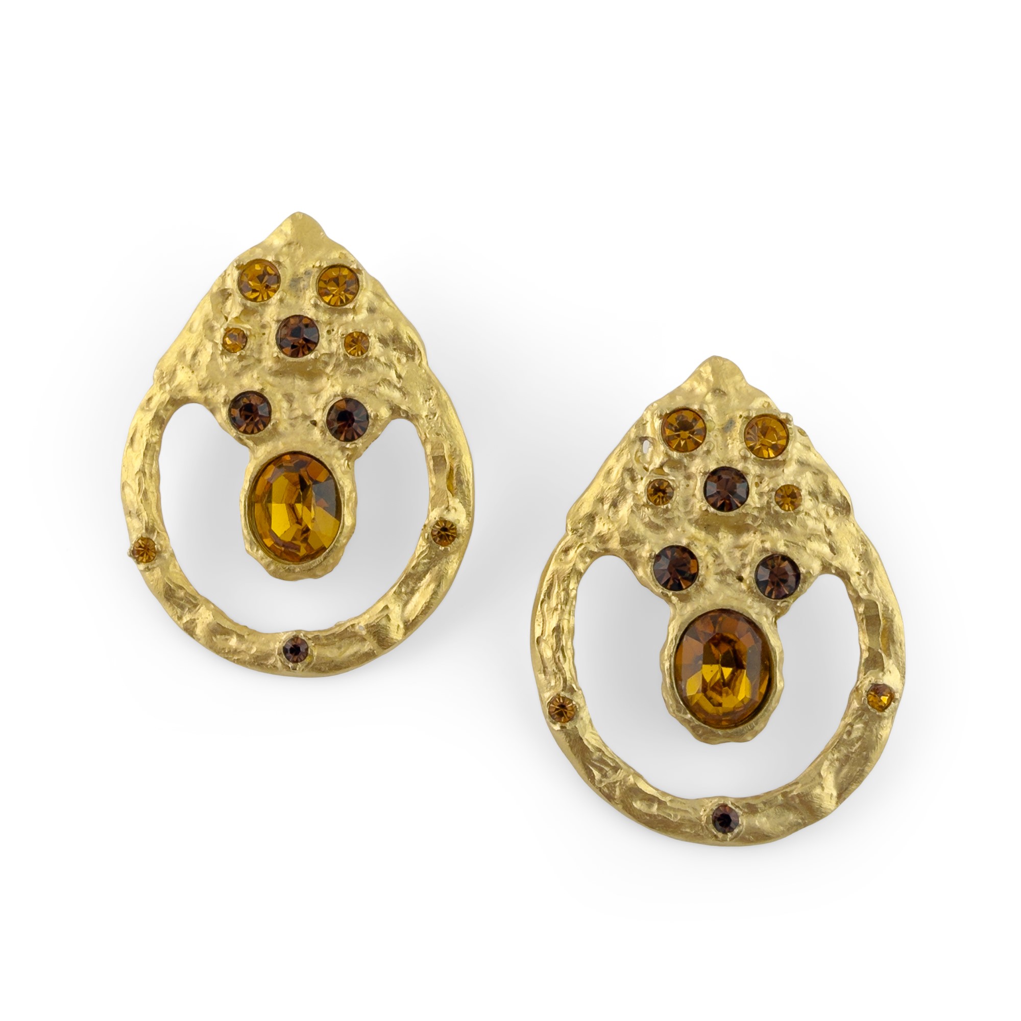 paio di orecchini in metallo dorato satinato e martellato con cristalli color ambra di misure diverse, l. cm. 5.