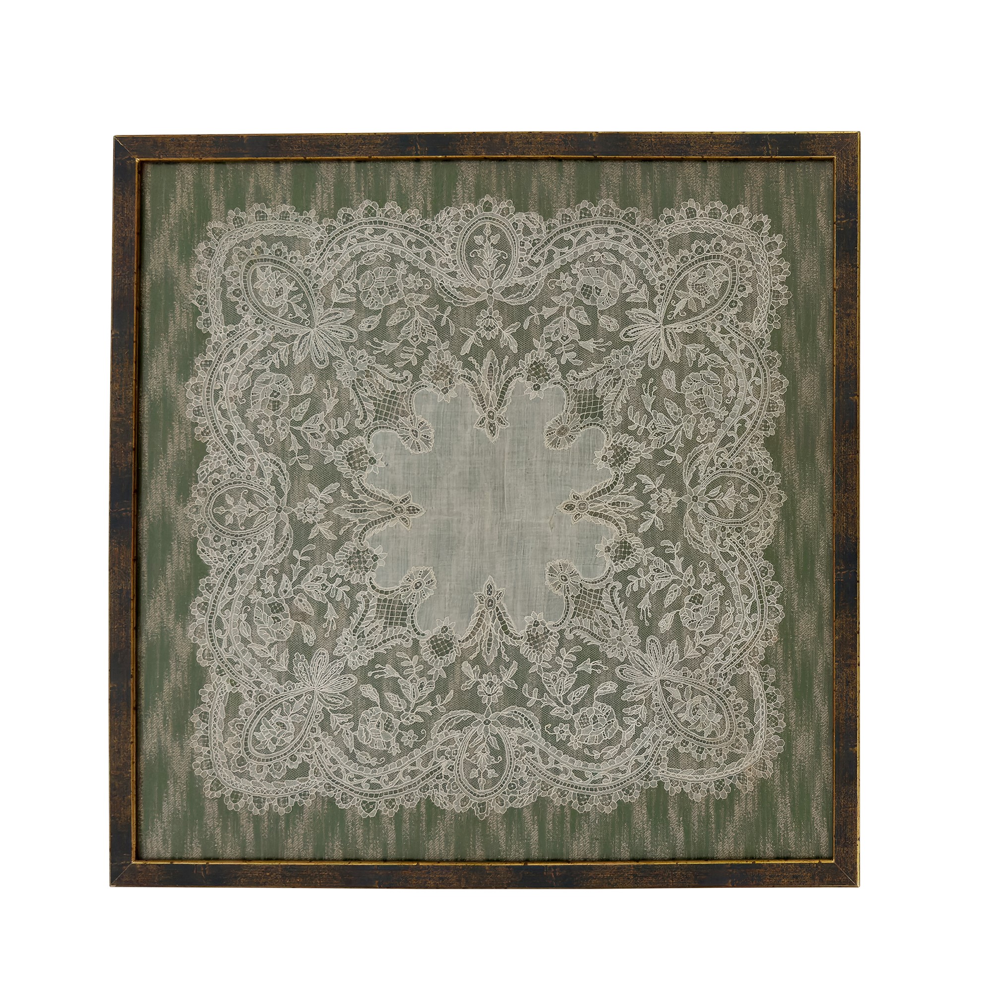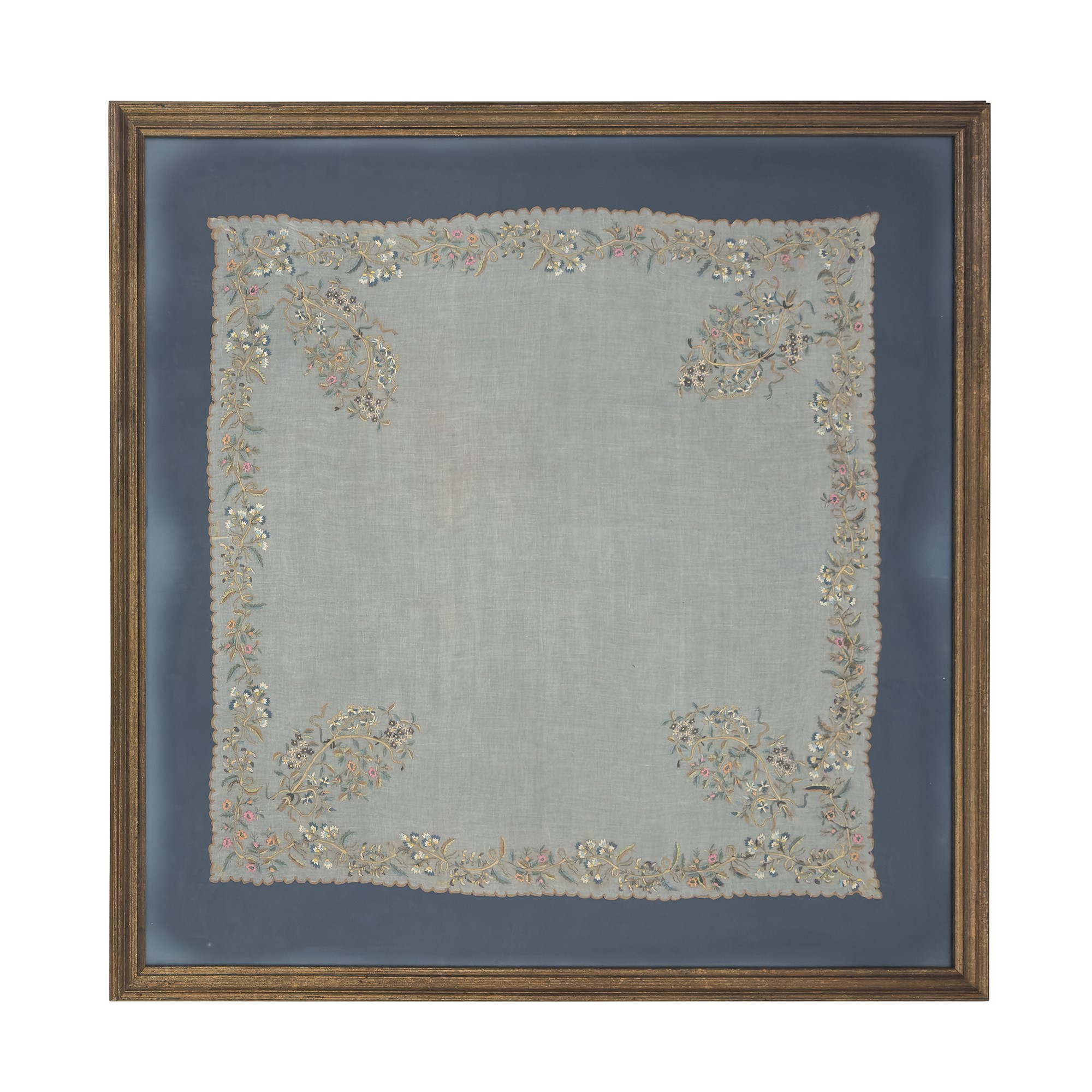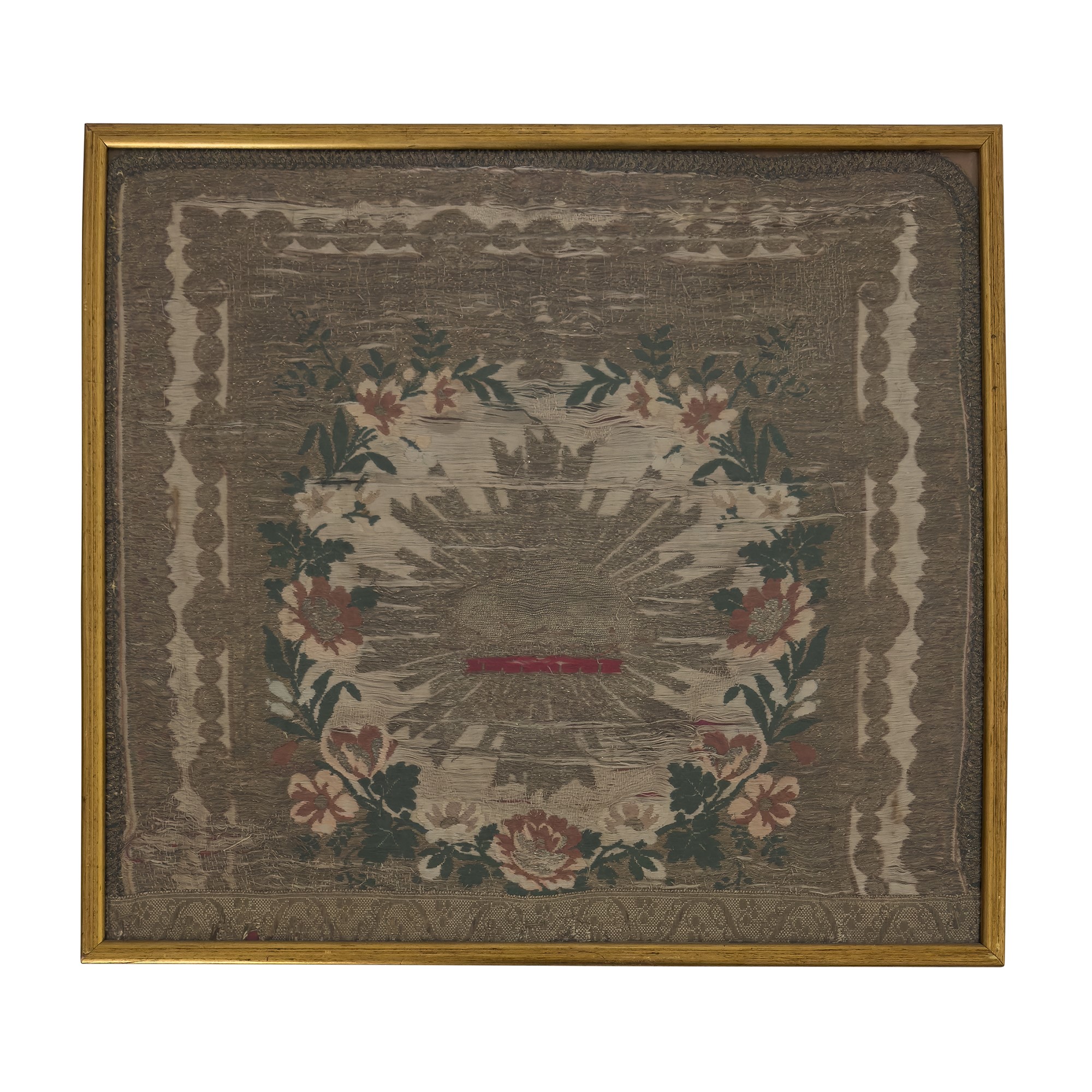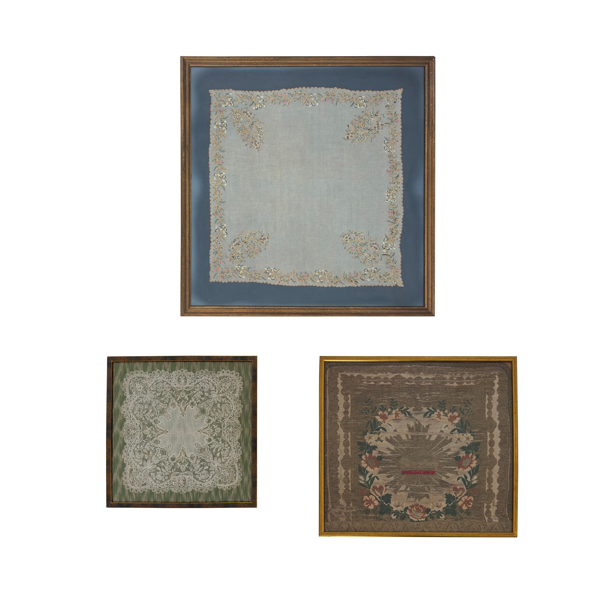 dei quali il piรน grande ricamato a mano a rami fioriti (cm. 106x107 circa), uno in pizzo bianco (cm. 44,5x44,5 circa) e l'altro tessuto in fili policromi e dorati (cm. 48,5x53 circa); contenuti entro cornici