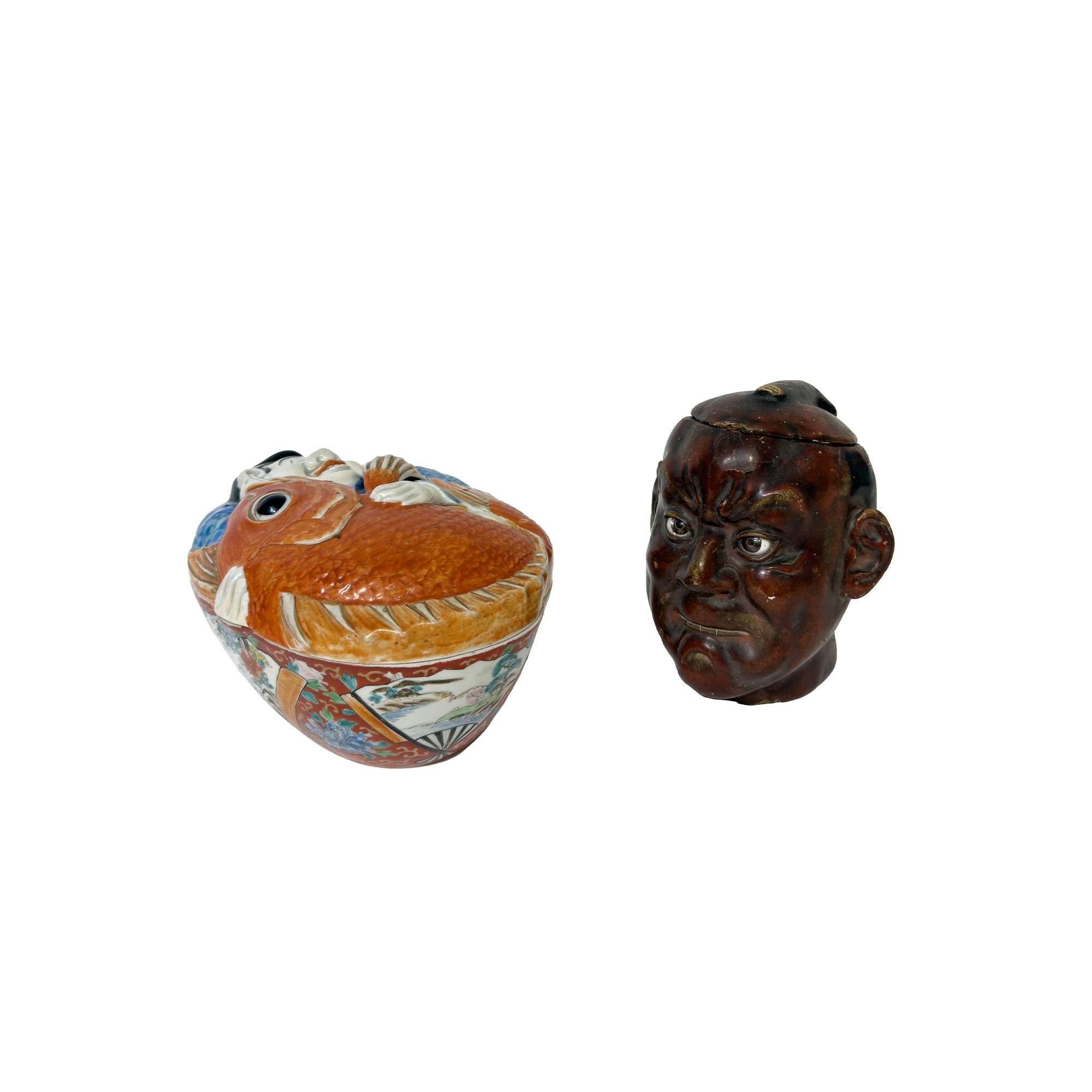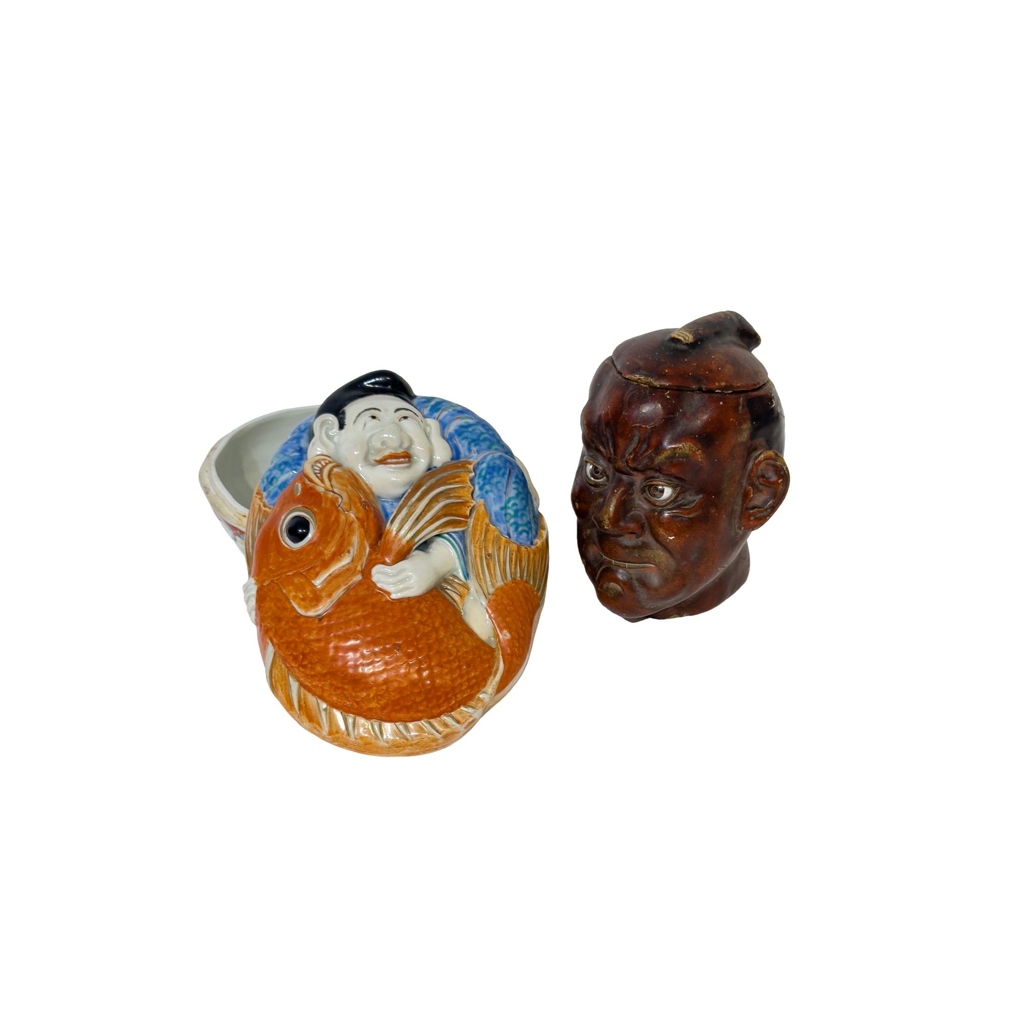 una in cartapesta raffigurante una testa virile, l'altra in porcellana policroma con coperchio modellato a raffigurare un uomo che abbraccia una carpa, h. cm. 15; cm. 11x21x16