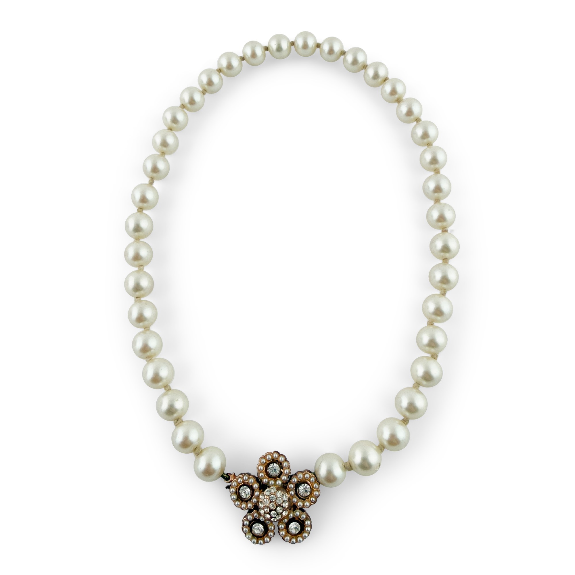 collana di finte perle con chiusura cesellata a fiore in metallo dorato, l.cm. 44,5