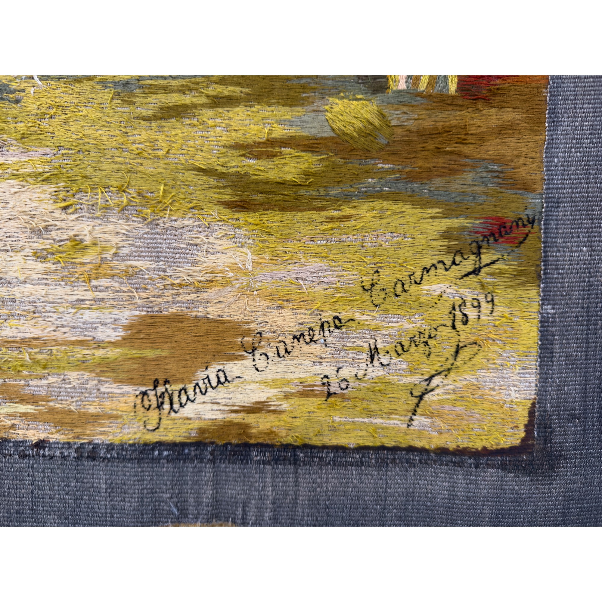 raffigurante un paesaggio lacustre con una giovane donna che legge; cornice ricamata in rilievo a girali fogliati e grifoni; compreso entro una sorta di cornice bullonata in cuoio con frange; firmato e datato in basso a destra: Flavia Canepa Carmagnani 26 Marzo 1899, cm. 235x135