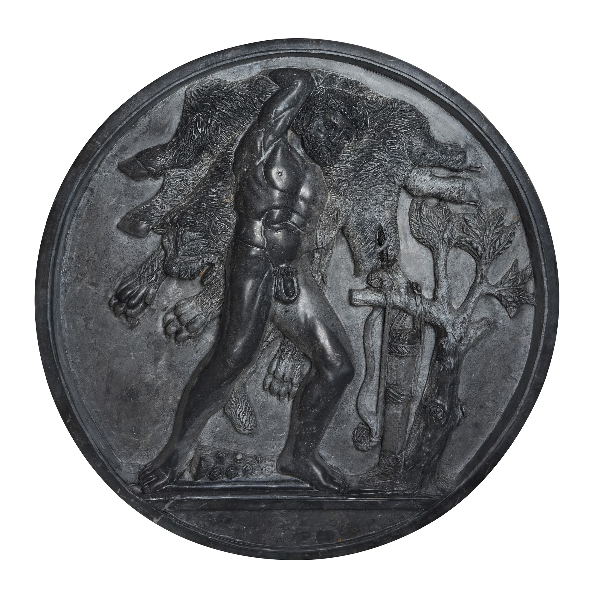 scolpita a raffigurare Ercole con leone e cinghiale, d. cm. 91; spessore cm. 7