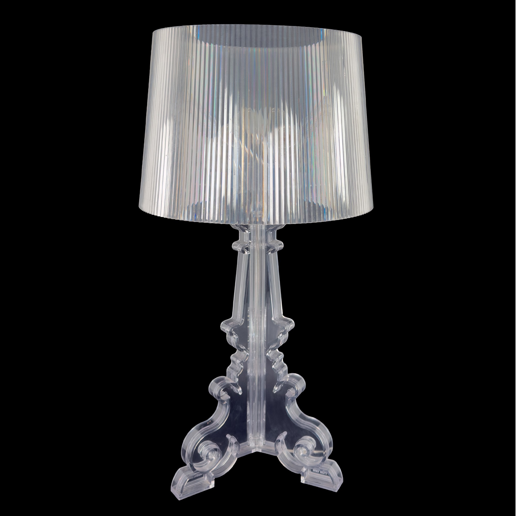 Bourgie, lampada da tavolo in policarbonato color cristallo su disegno di Ferruccio Laviani; base in stile barocco; cappello realizzato con effetto plissé, h. cm. 71,5