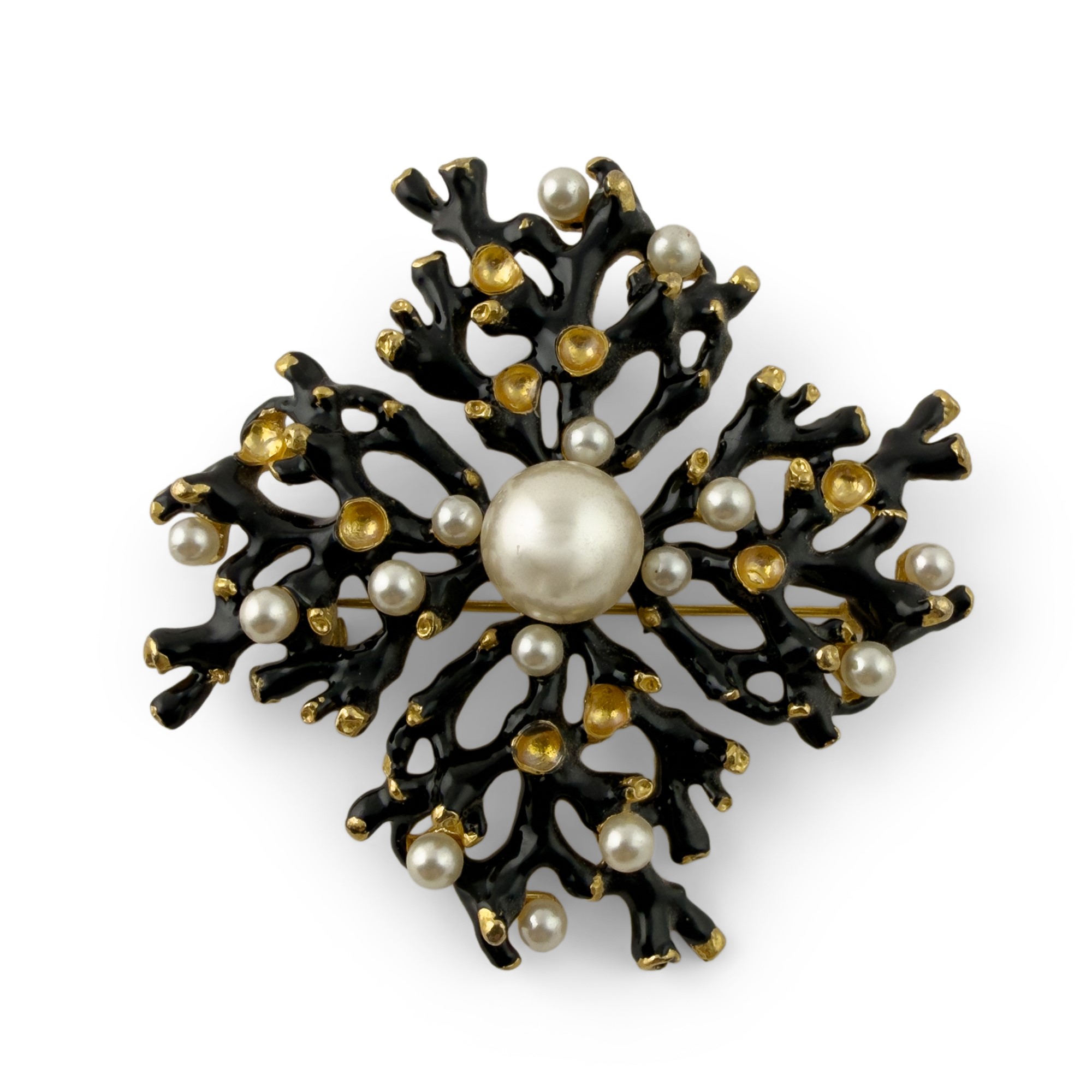 spilla/pendente in forma di un ramo di corallo in metallo dorato, smalto nero e pietre simulate.