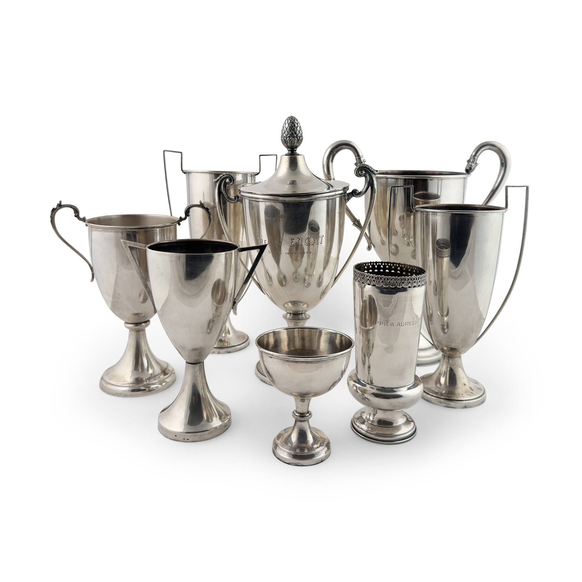 di diversa forma, h. da cm. 12 a cm. 36, peso complessivo gr. 3.270 (qualche ammaccatura; una coppa con presa dissaldata)