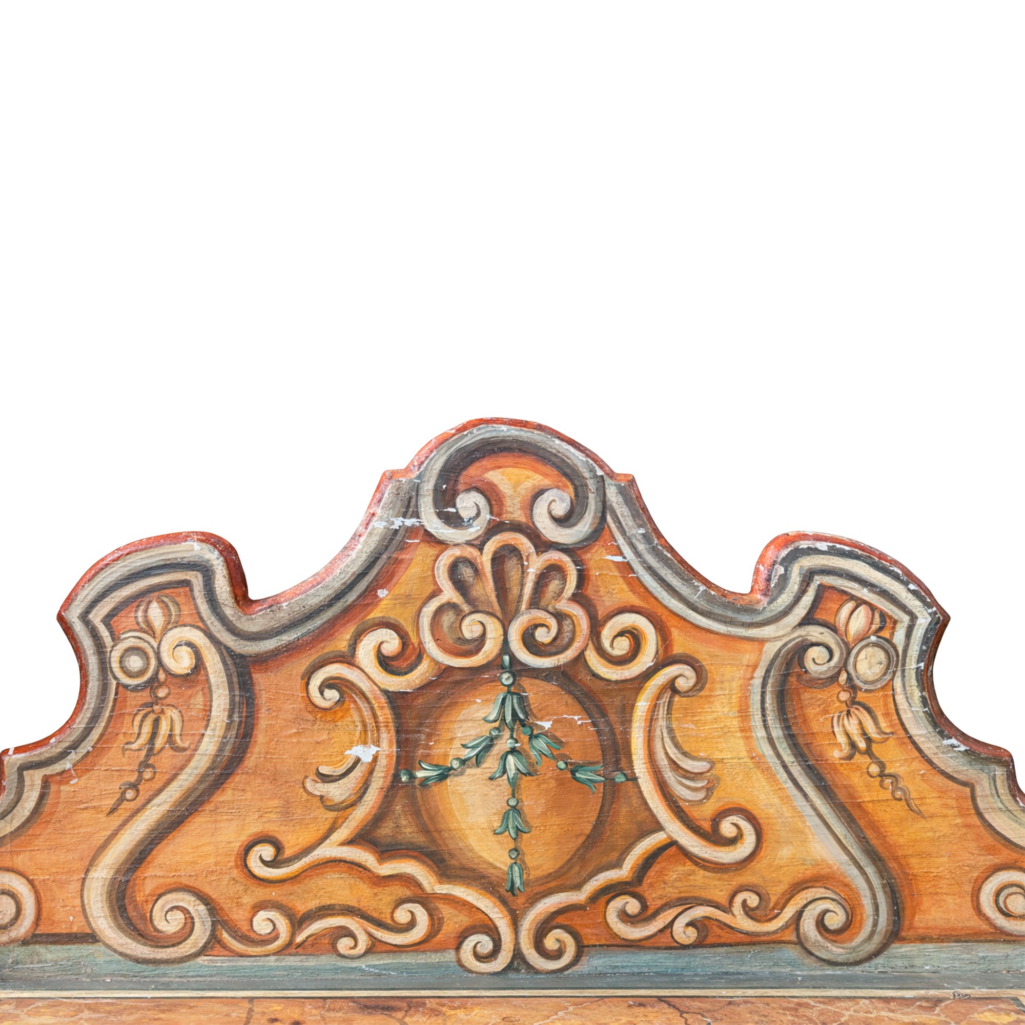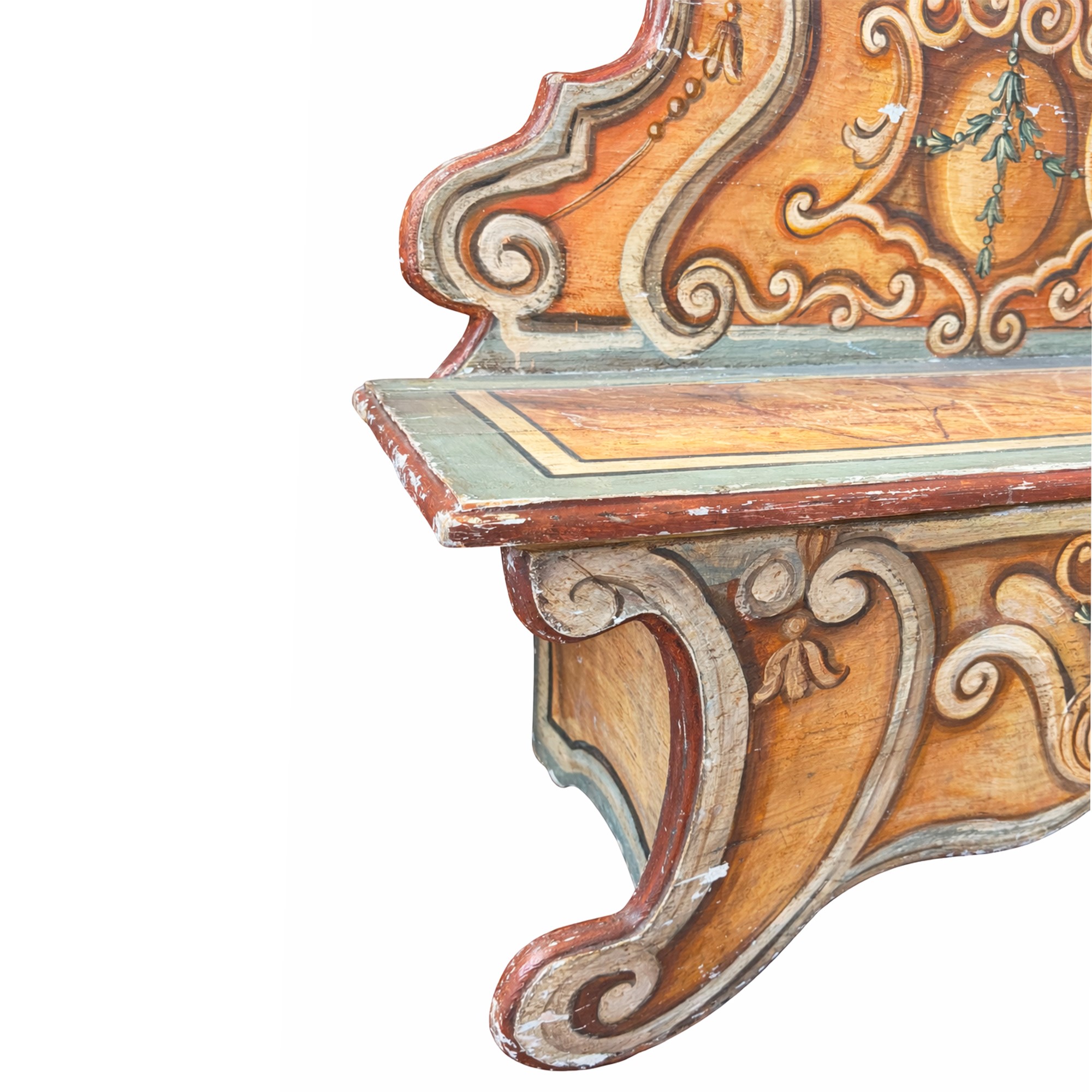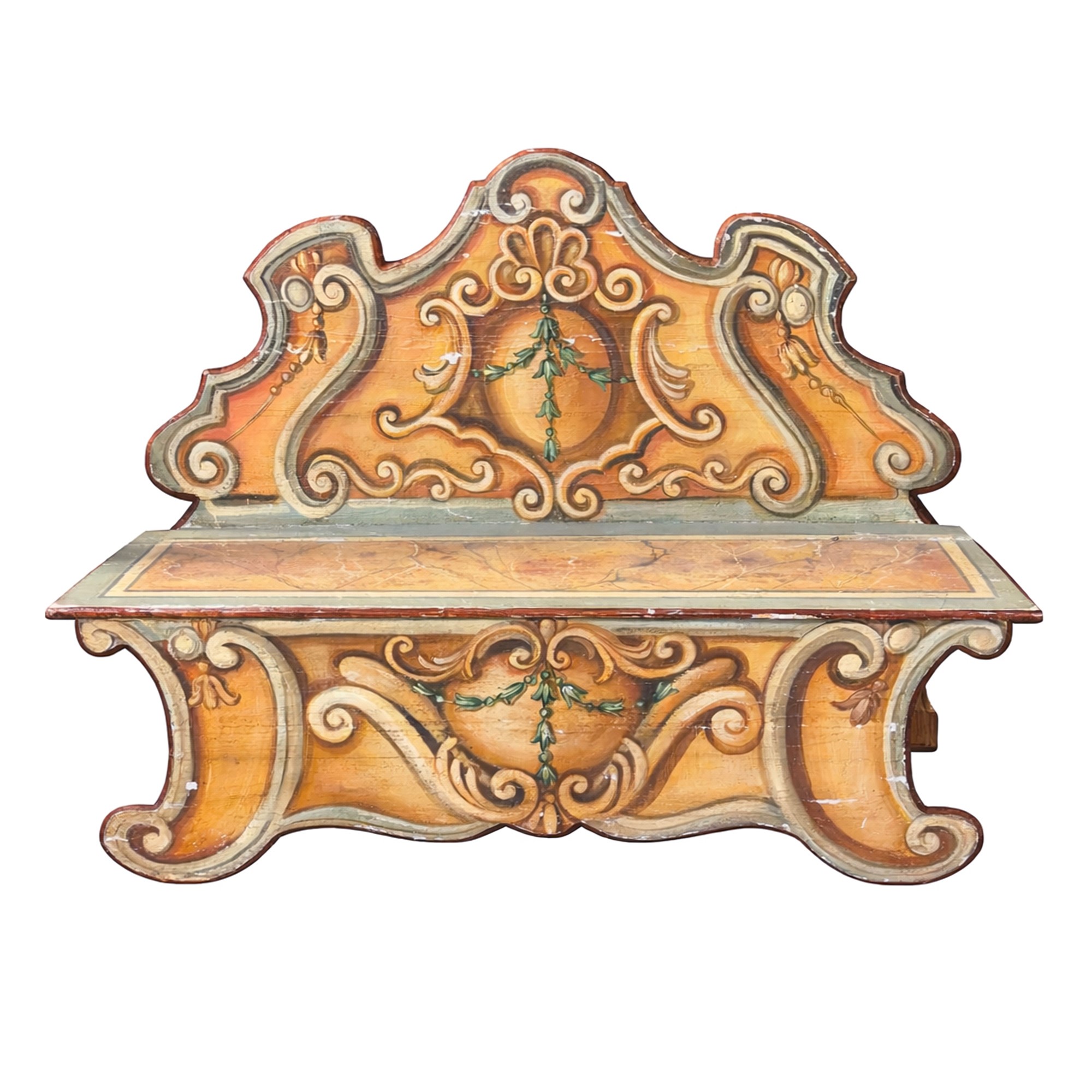 dipinta a volute in parte stilizzate; schienale dal profilo centinato; seduta simulante il marmo, cm. 105x138x45.
