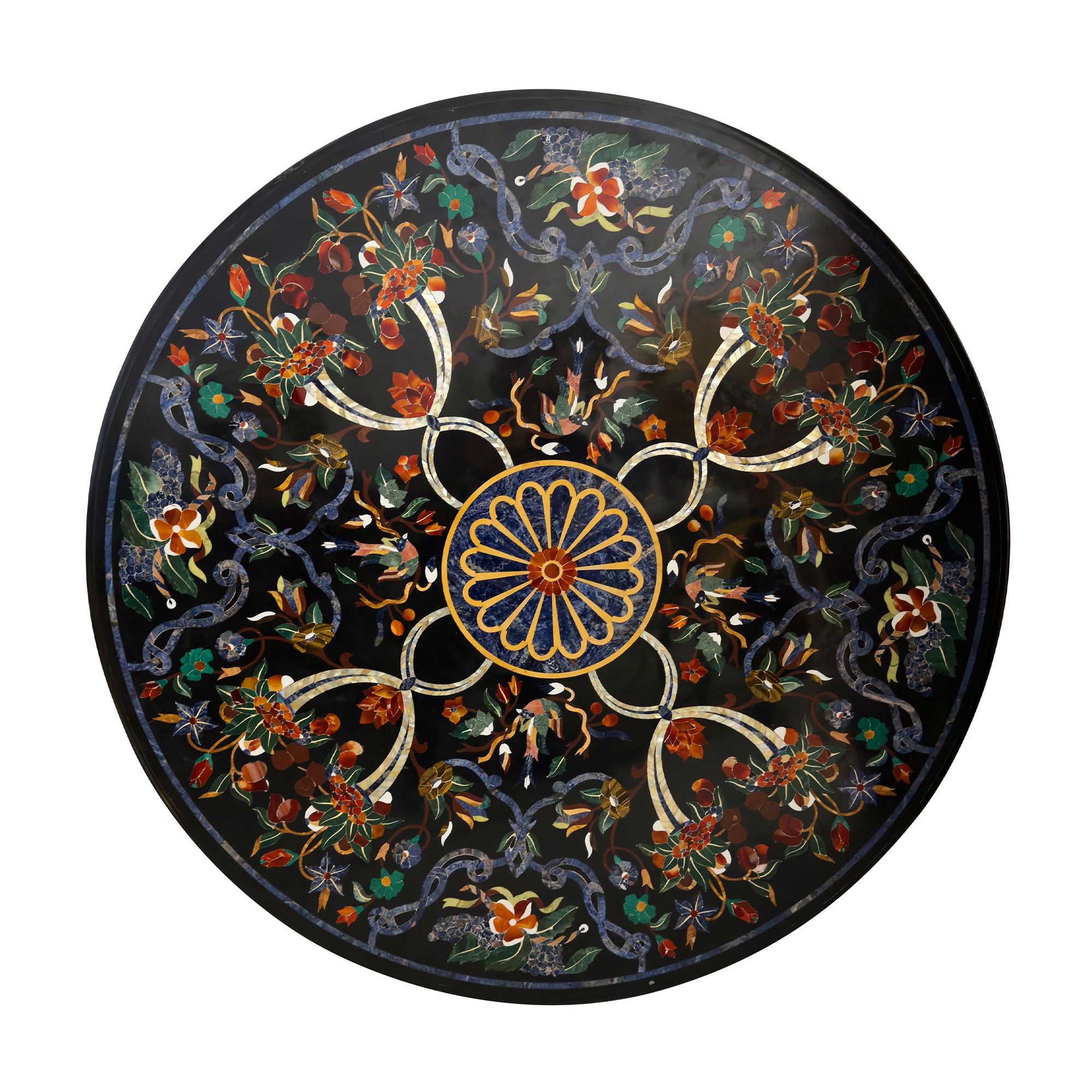 Piano circolare in marmo nero intarsiato in marmi policromi