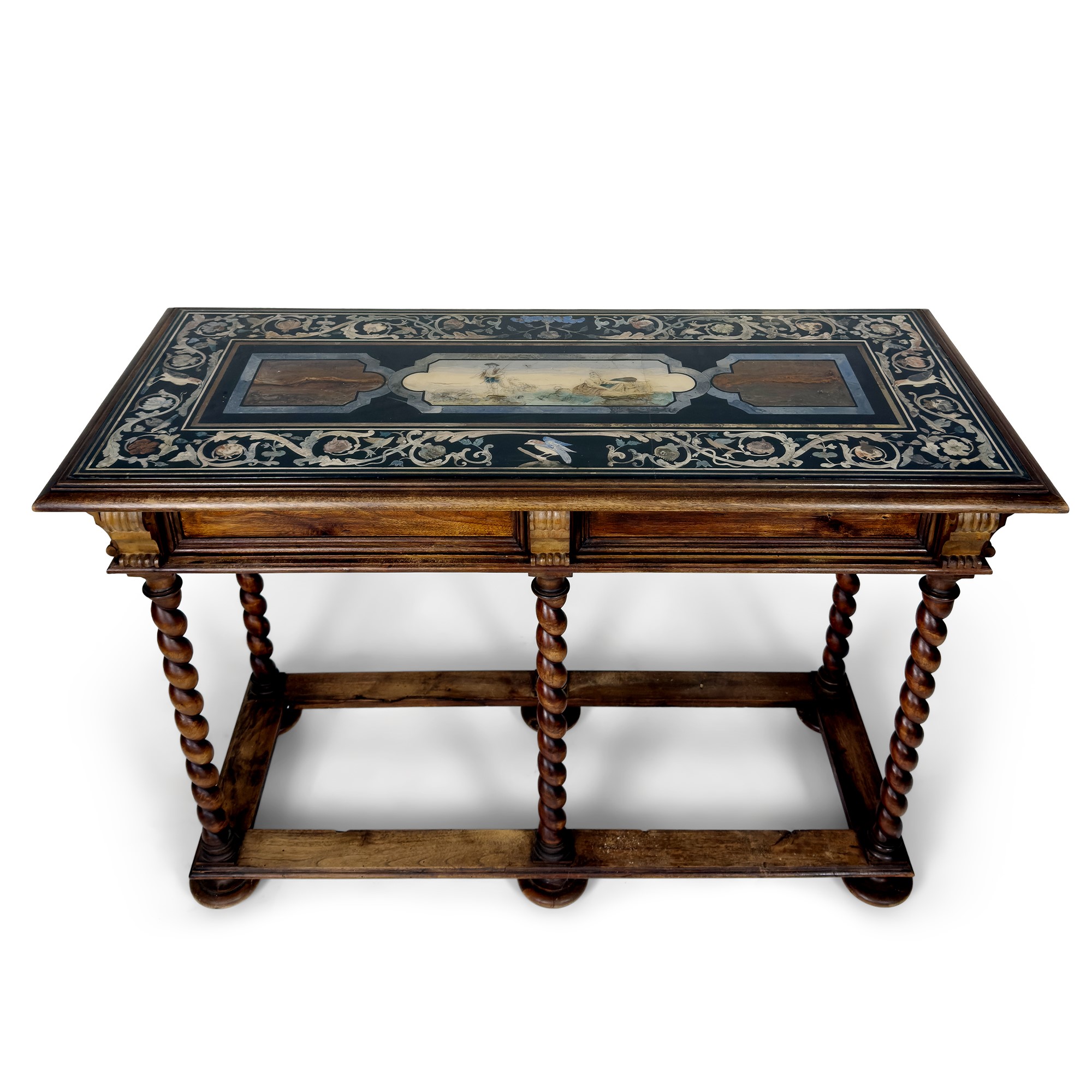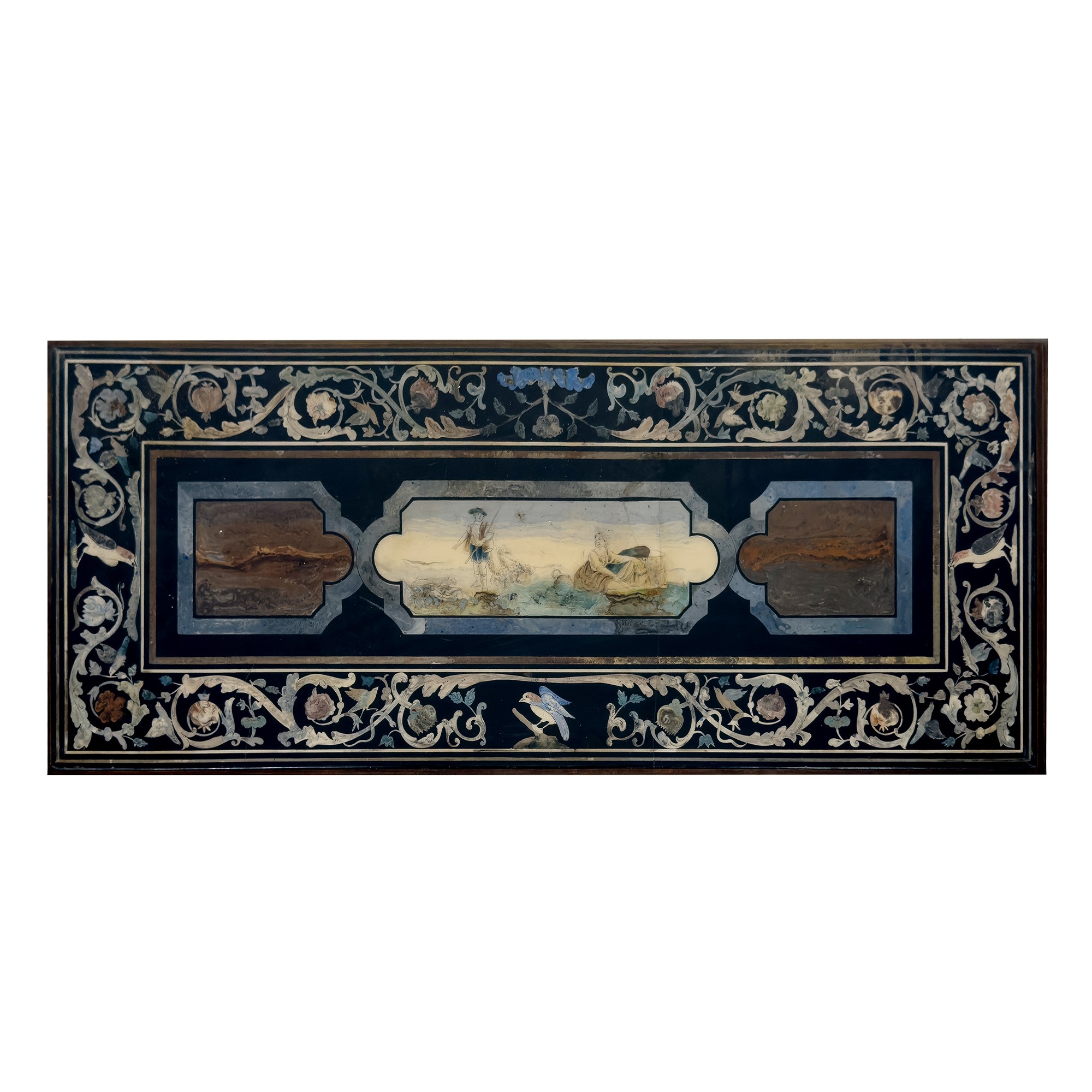 decorato al centro a scena campestre compresa entro una cornice a racemi fogliati, frutti e volatili; base lignea con sostegni tortili e piedi a boccia schiacciata, cm. 85x122x53 (restauri al piano)