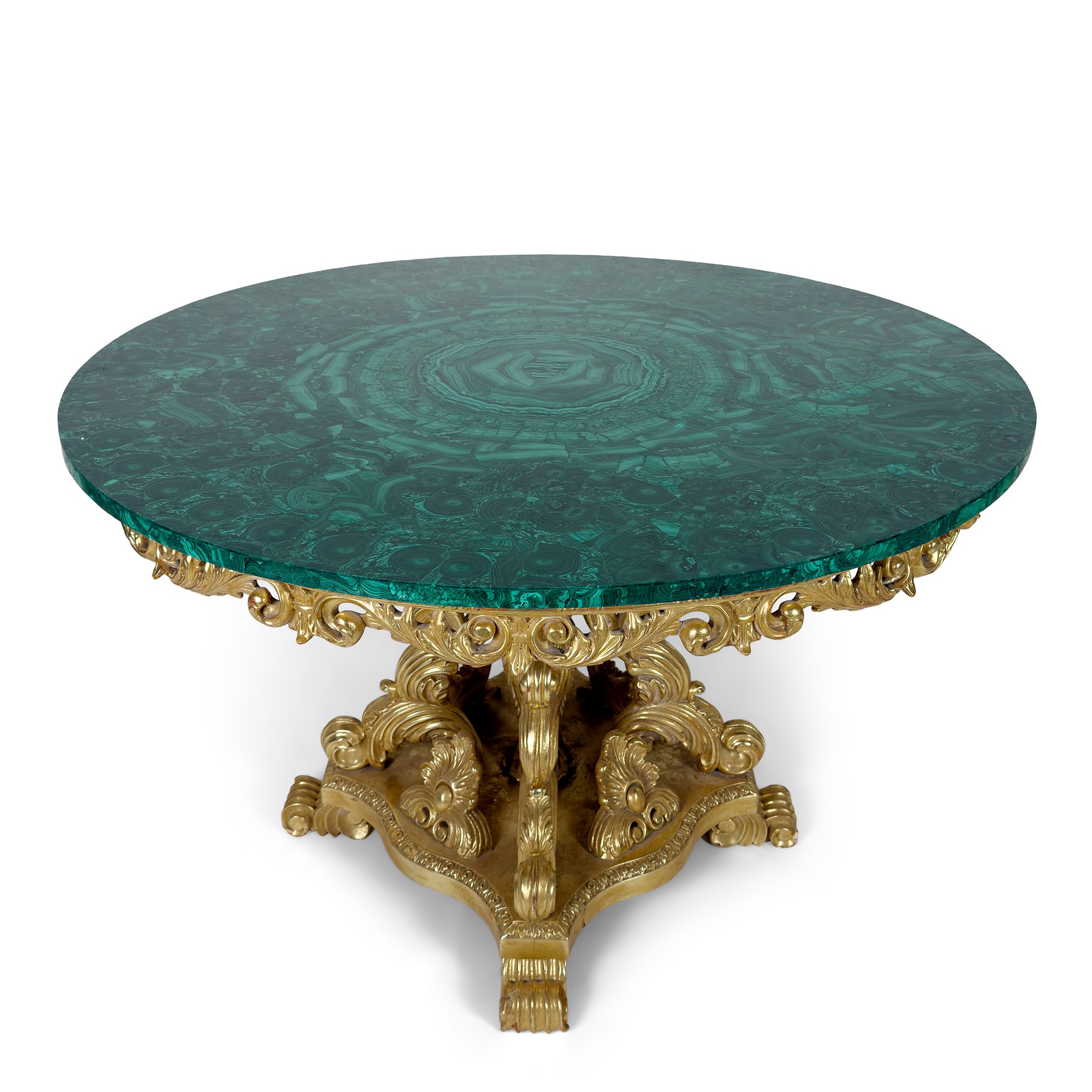 Tavolo in legno dorato con piano circolare placcato in malachite
