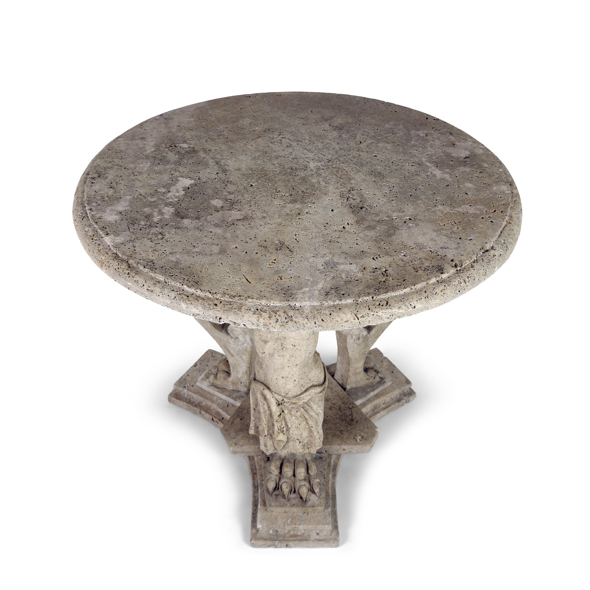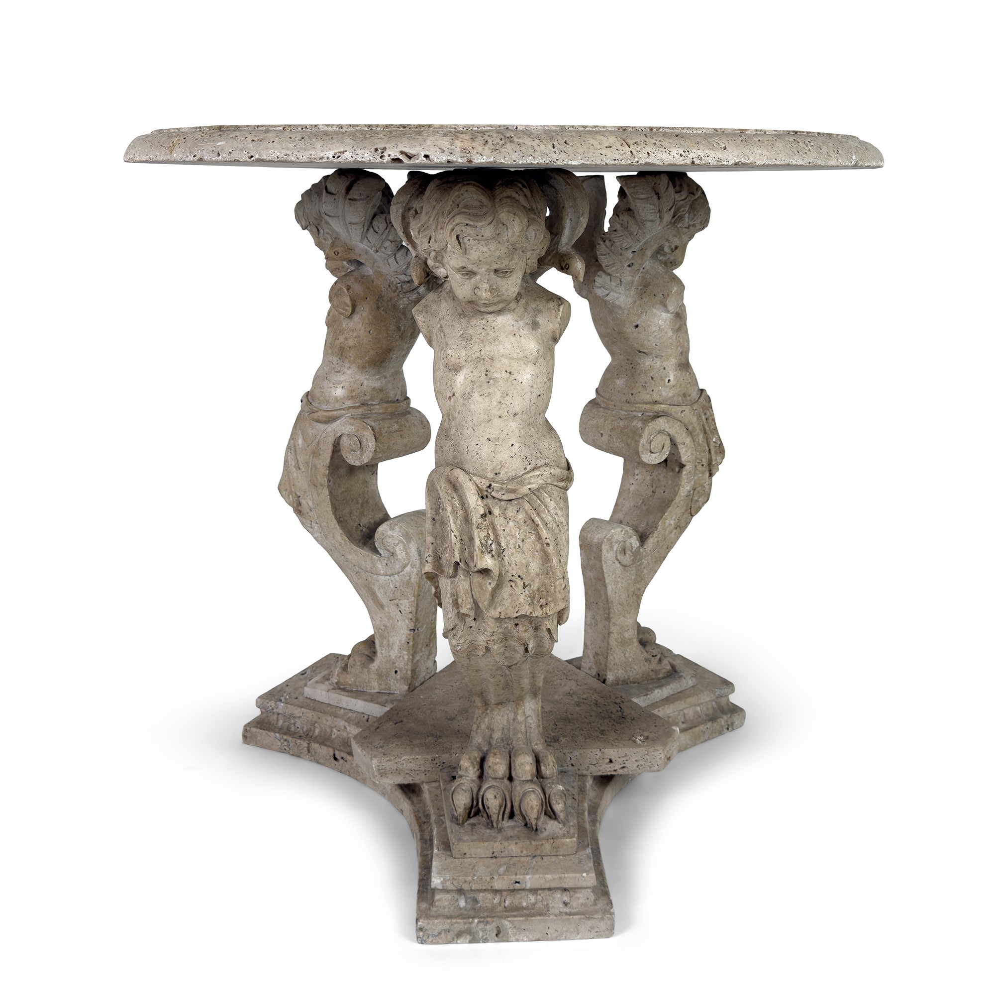 piano circolare sostenuto da tre montanti a erma di putto; base trilobata, cm. 80x80