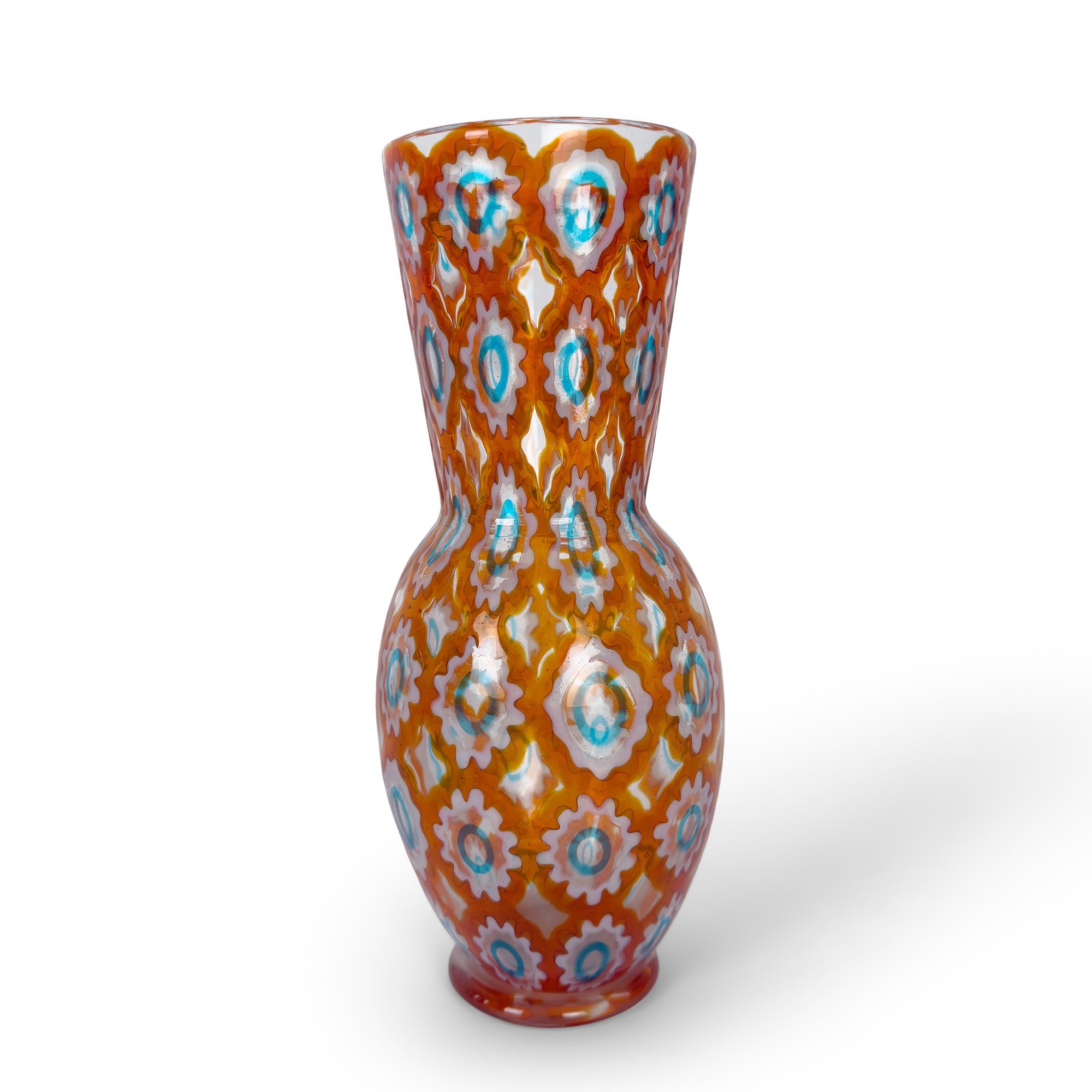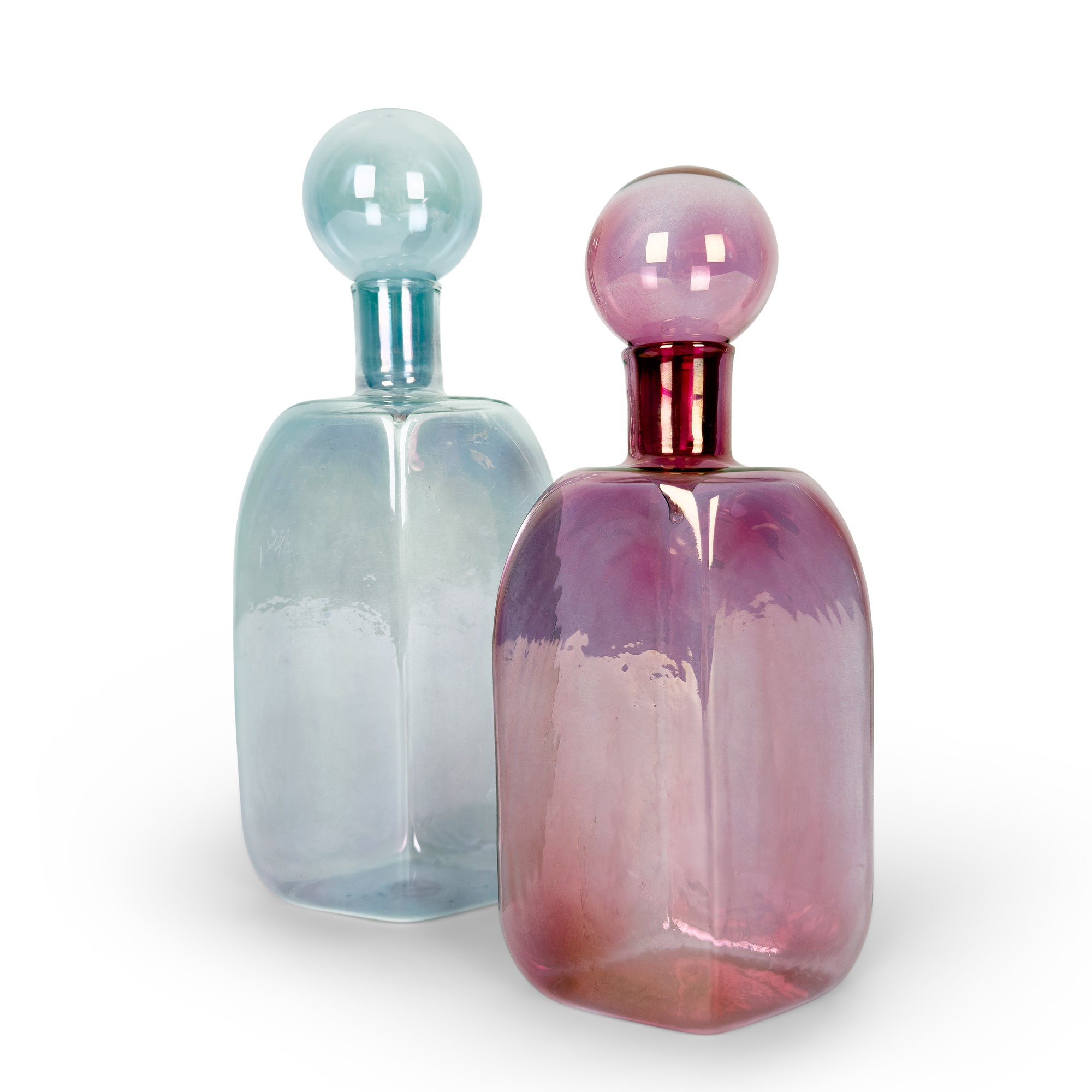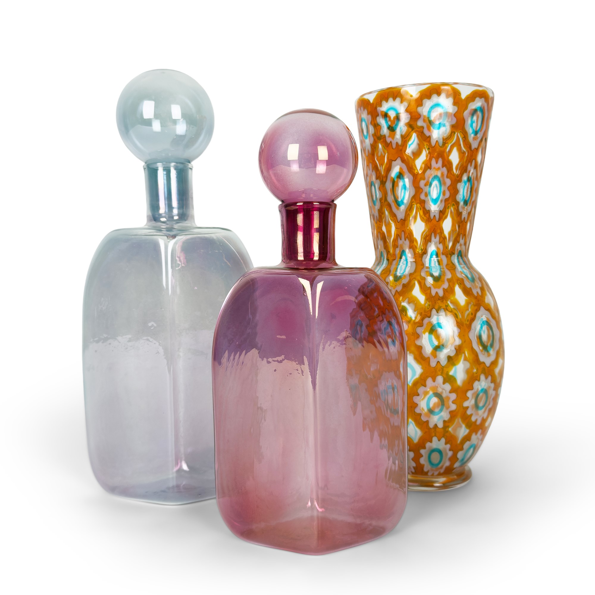 corpo ovoidale UNITO A due bottiglie di diverso colore in vetro soffiato con tappo sferico, il vaso: h. cm. 31; le bottiglie Marostica, Soffieria Parise, come da etichetta adesiva: h. cm. 29; h. cm. 33