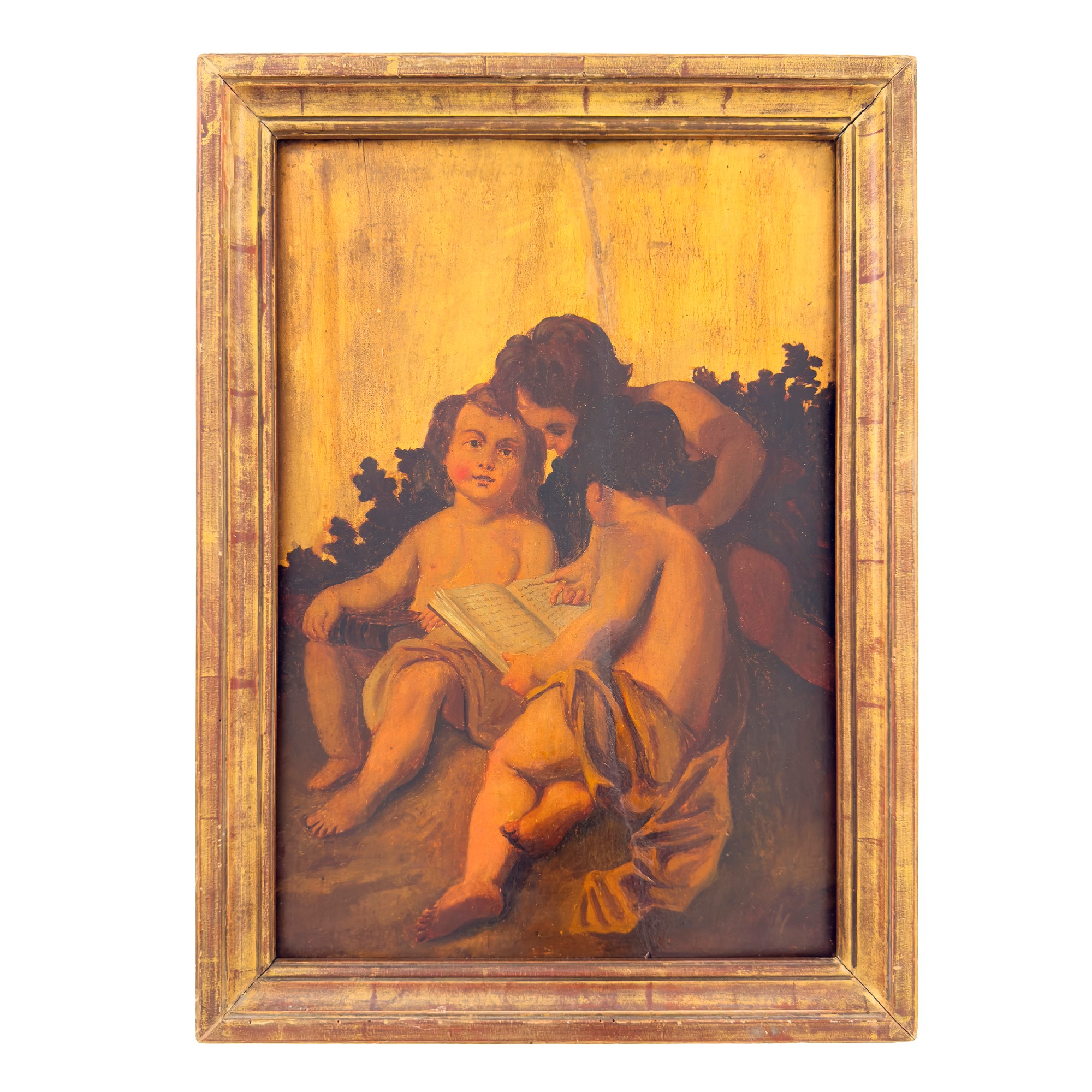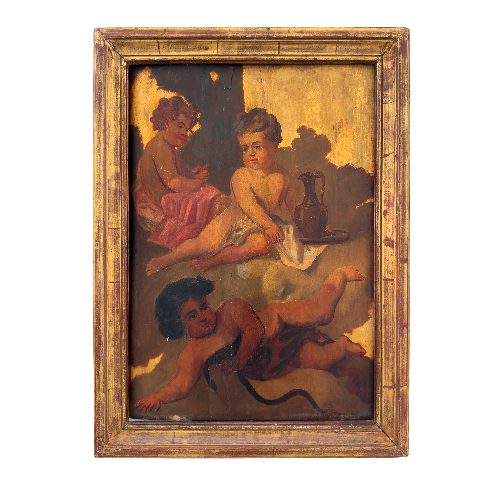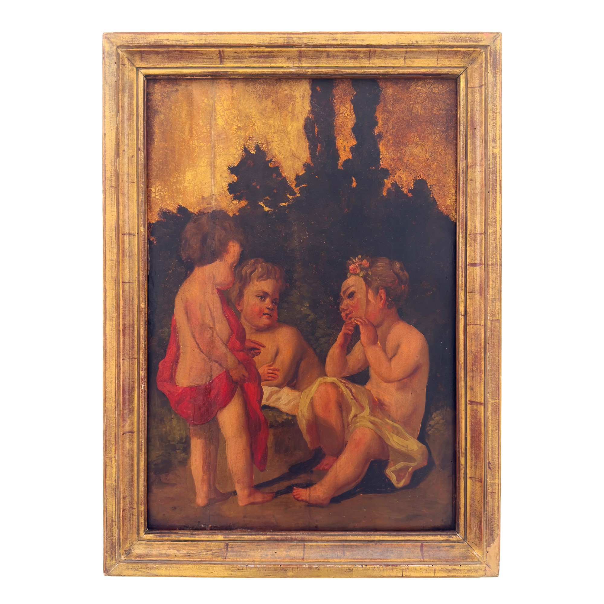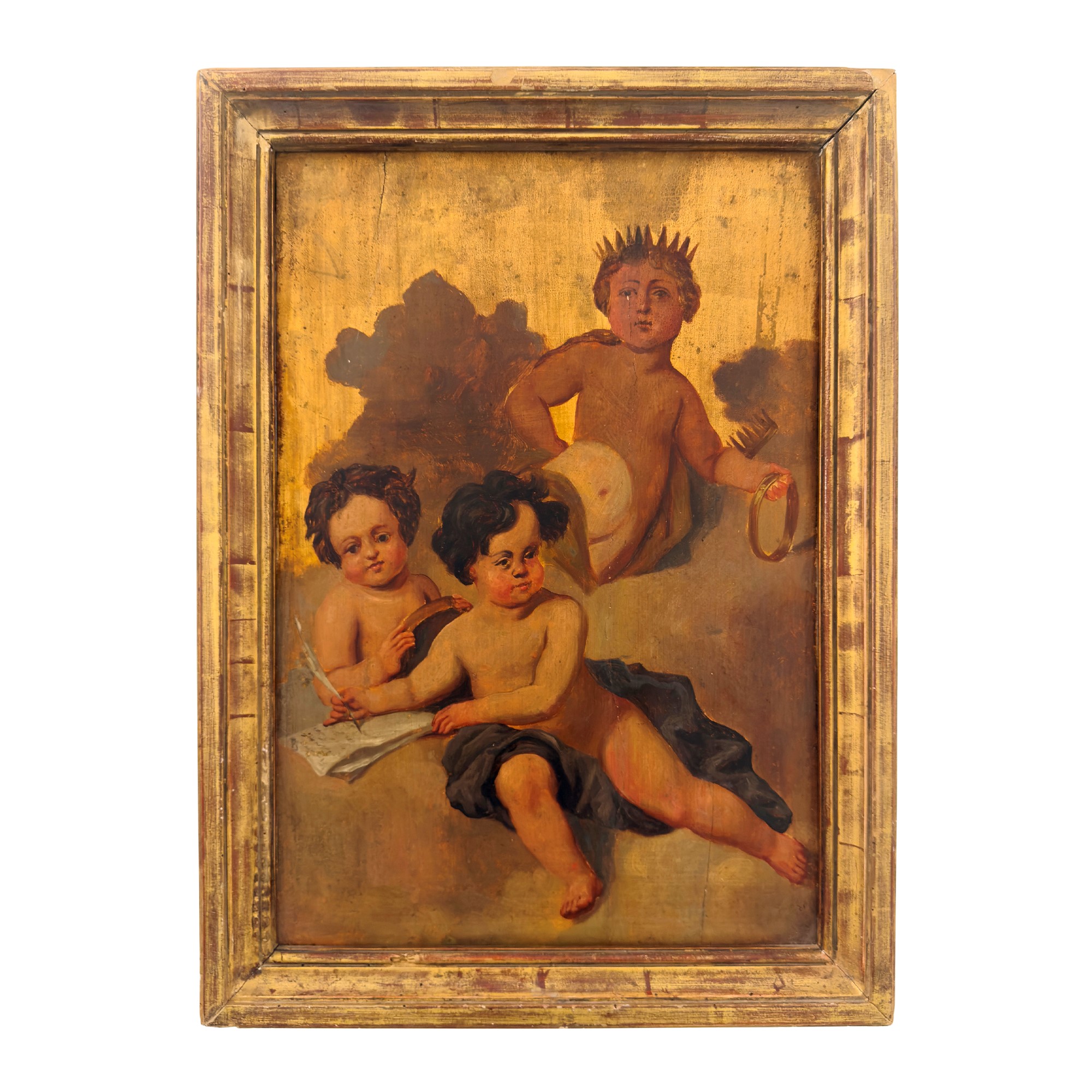 Allegorie di putti, quattro pannelli a olio su tavola a fondo oro, XIX secolo