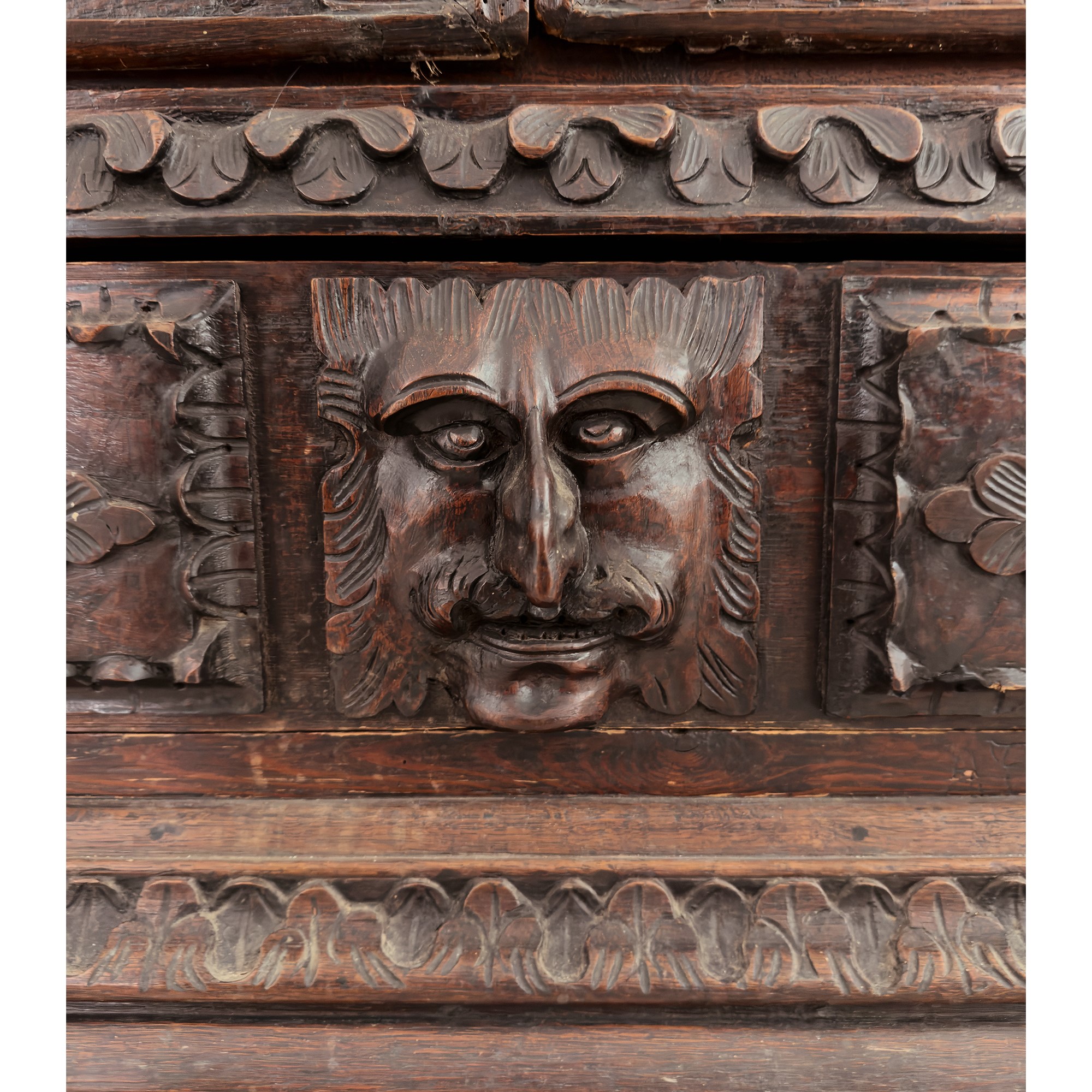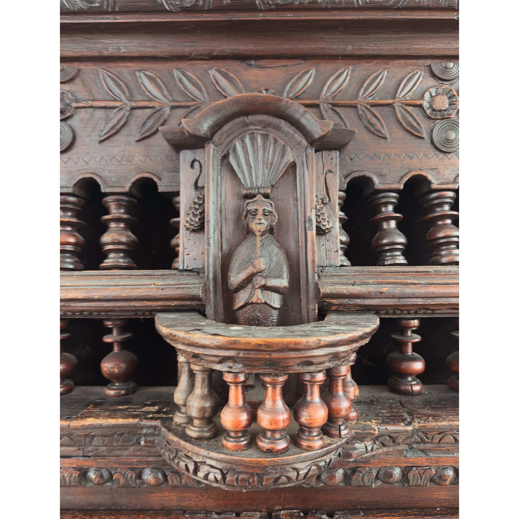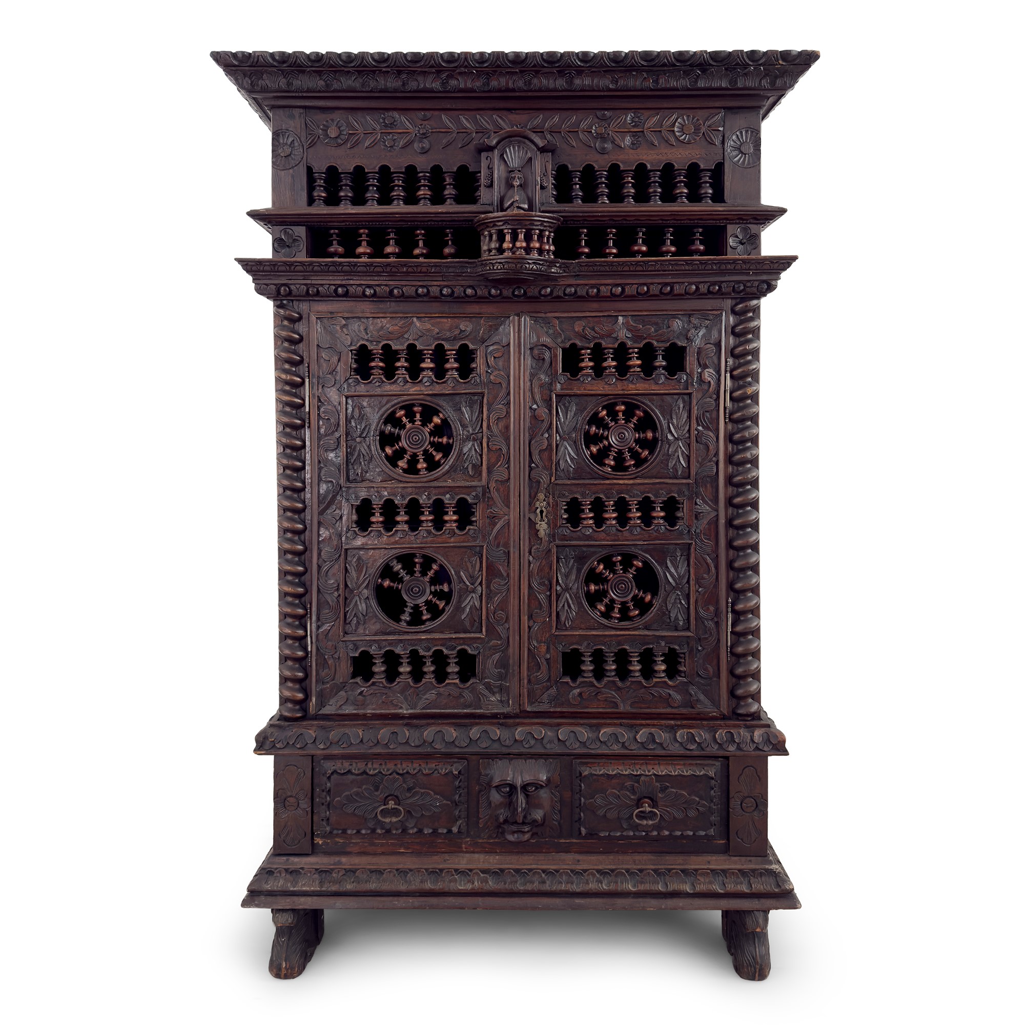 fronte a due ante traforate a motivi ornamentali caratterizzati da elementi a rocchetto. La parte superiore centrata da una figura virile; quella inferiore con cassetto centrato da un mascherone zoomorfo; lesene a colonnina tortile; cappello aggettante, cm. 190x120x42
