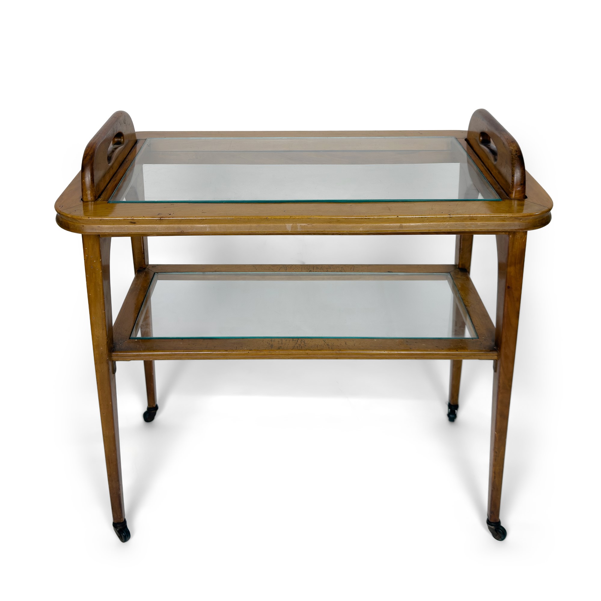 due ripiani rettangolari in vetro; il piano sollevabile a uso vassoio; gambe munite di rotelle, cm. 75x79x44,5