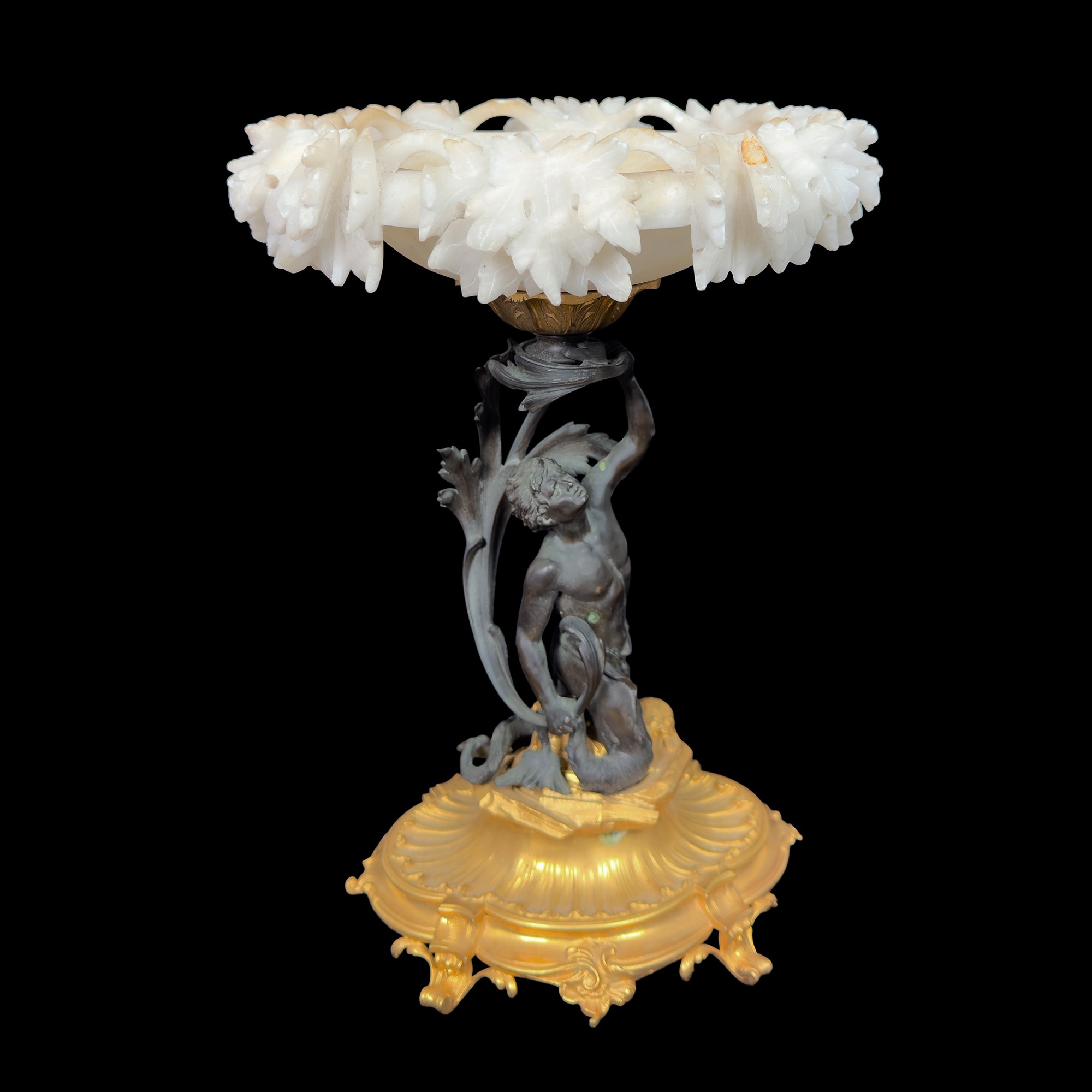 caratterizzato dalla figura di un tritone che sorregge una vasca circolare con profilo scolpito a foglie di vite, cm. 41x29