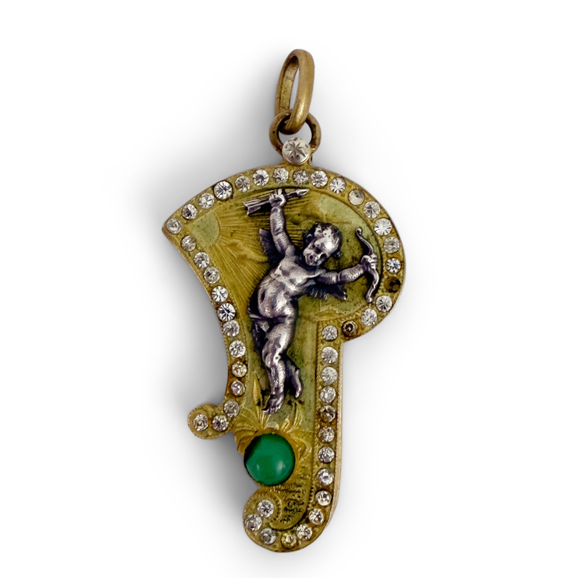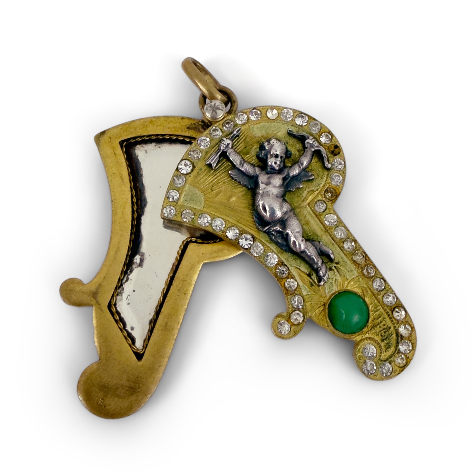 in forma di una "P" con interno in specchio, qualificato da una figurina di Cupido con arco e frecce, h. cm. 5