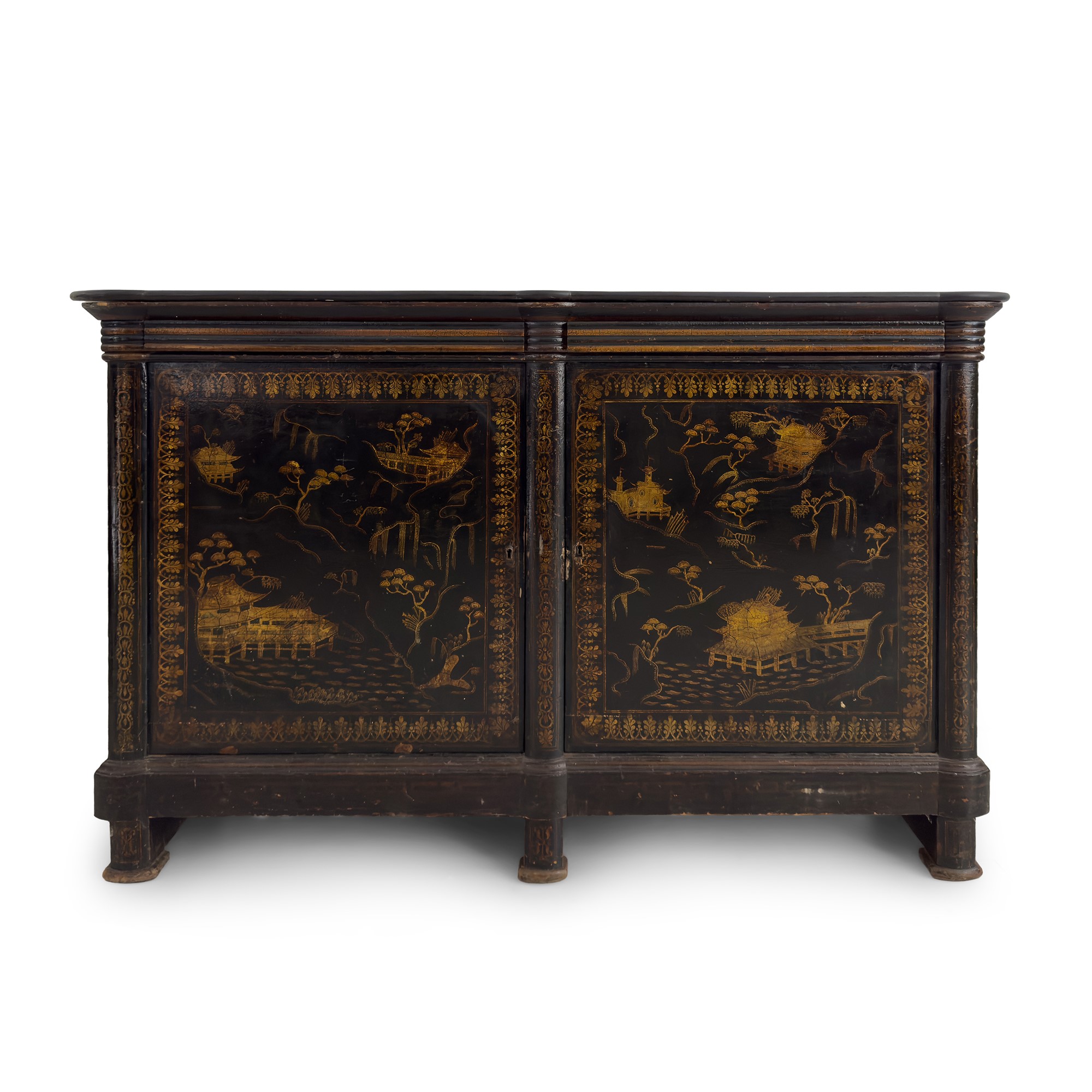 piano di marmo nero mistilineo sovrastante due cassetti allineati e due porte lignee ornate a raffigurare paesaggi orientali con pagode e figurette; piedi lineari. Dall'apertura delle ante si svelano otto cassetti su due colonne, cm. 98x155x39 (qualche difetto al piano)