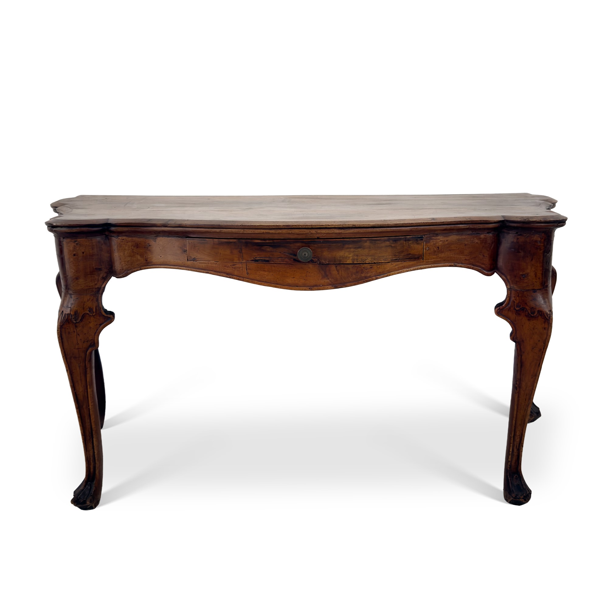 piano dal profilo sagomato; fascia sottostante munita di cassetto, gambe a voluta segnate superiormente da un lieve intaglio a motivo vegetale, cm. 79x160x65 circa